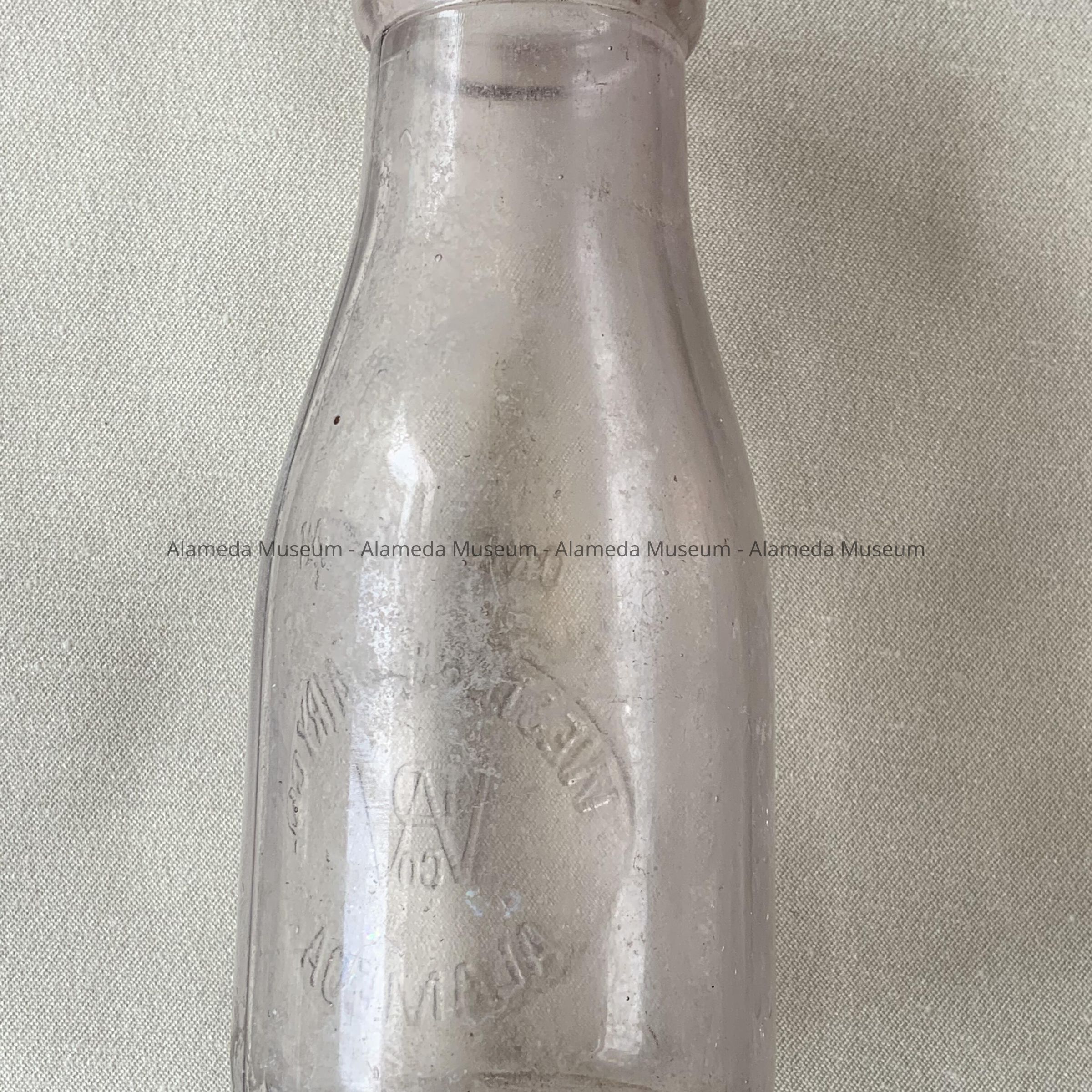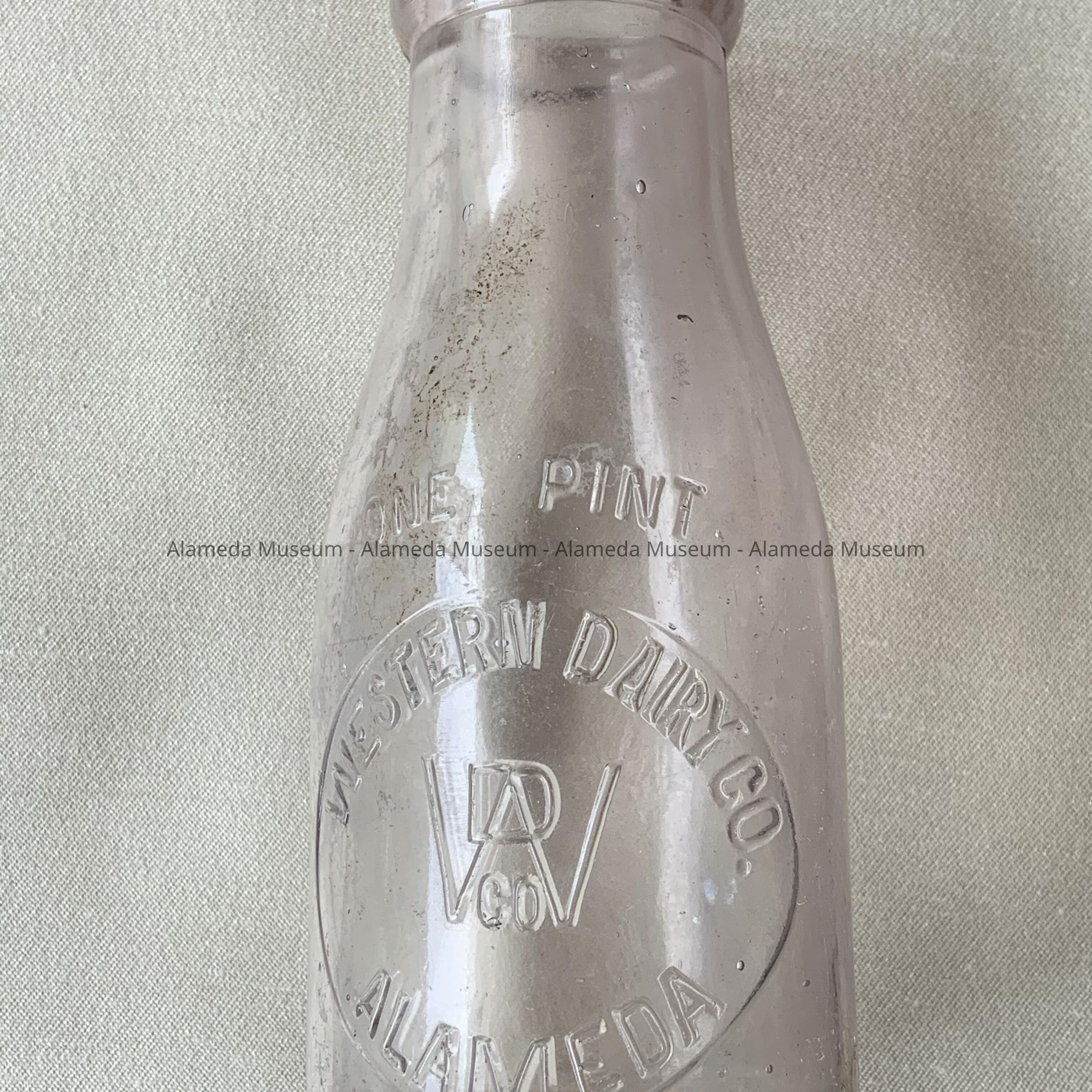 Description: A pint size double seam clear glass milk bottle with an embossed caption reading: "Western Dairy Co. Alameda Cal".