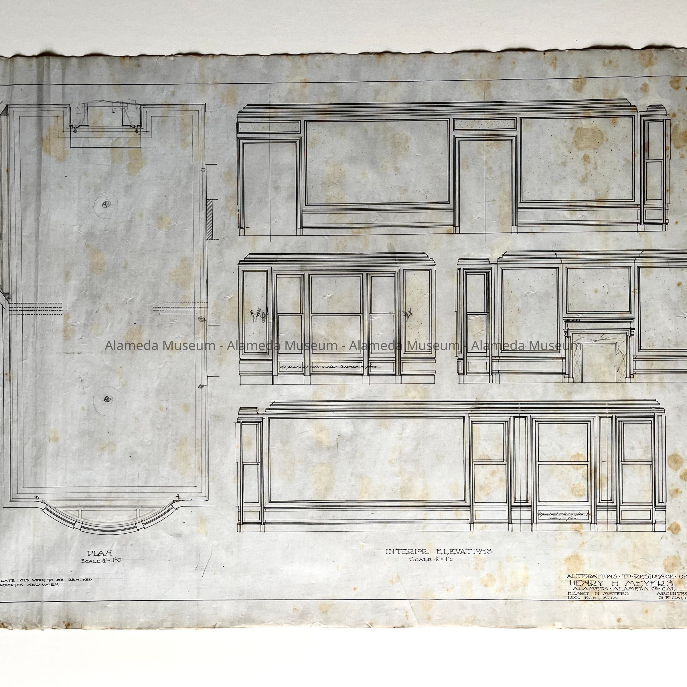 ALTERATIONS MADE IN 1914 AND 1915 TO THE PARLOR OF THE HENRY H MEYERS' RESIDENCE LOCATED AT 2021 ALAMEDA AVE., ALAMEDA, CALIFORNIA. PLAN ORIGINATED ON SEPTEMBER 24, 1914. IT WAS AT THAT TIME WHEN THE PARTITION SEPARATING THE FRONT AND BACK PARLORS WAS REMOVED.