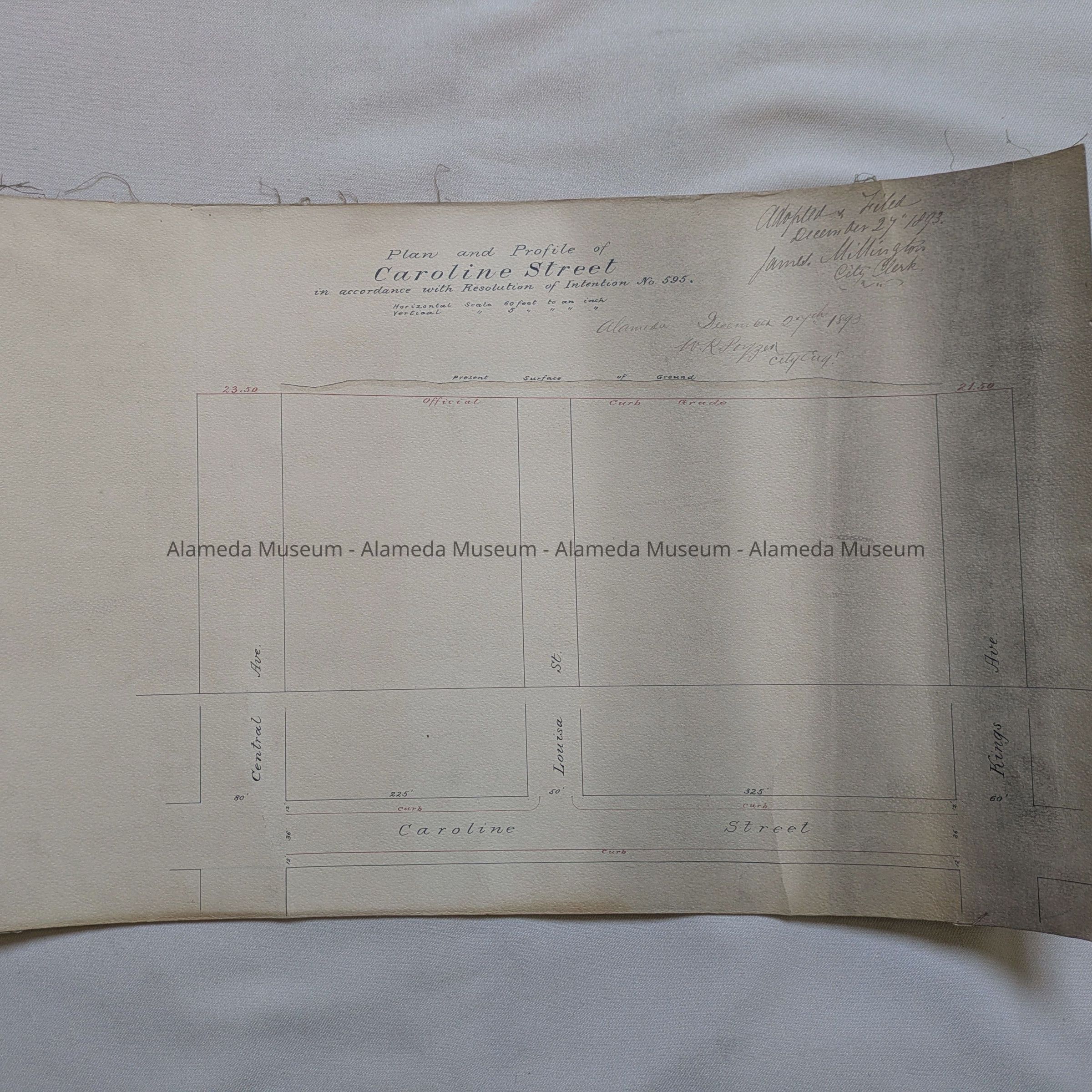 Description: A Plan, hand-drawn on off-white card stock paper, with blocks marked in black ink, and curb line marked in red ink. Title: ‘Plan and Profile of Caroline Street in accordance with Resolution of Intention No. 595.’ Horizontal scale 60 feet to an inch / Vertical scale 5 feet to an inch. Drawn by: City Engineer, H. R. Poyser, Alameda, December 27th, 1893. Adopted and Filed December 27th, 1893, James Millington, City Clerk. Has original filing tag from city hall attached.