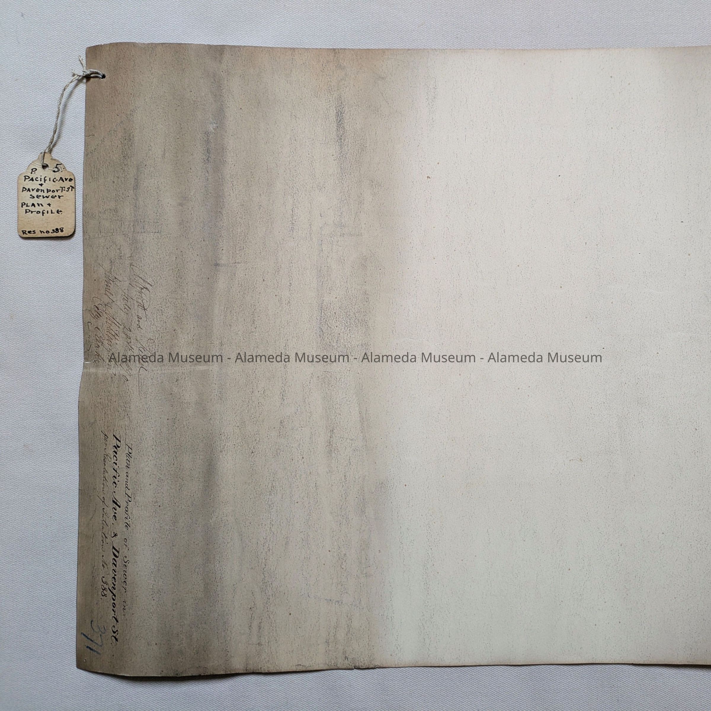 History of Object: Plan and Profile of Sewer in Pacific Avenue and Davenport Street, 1890. Found in the attic of City Hall in the 1990s.