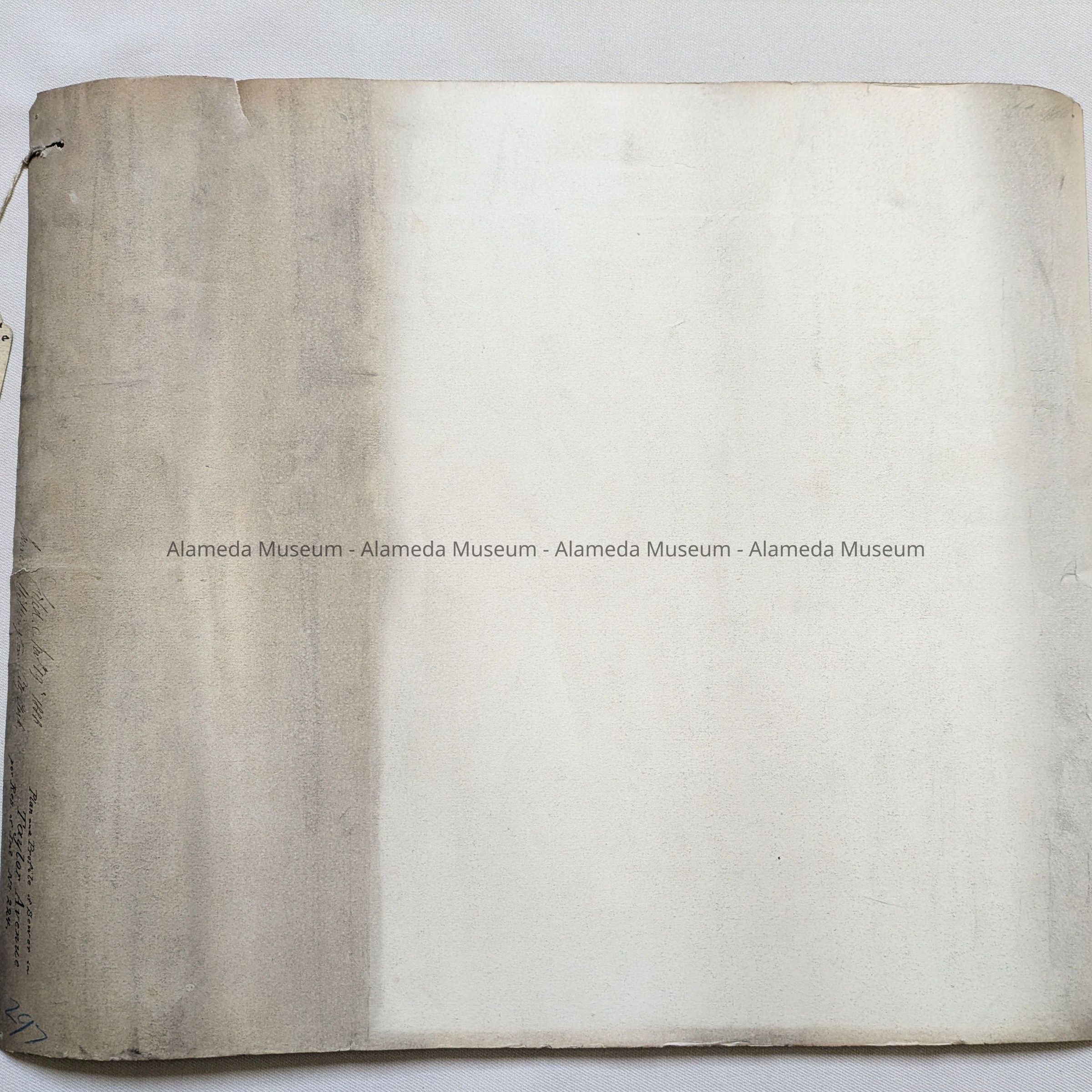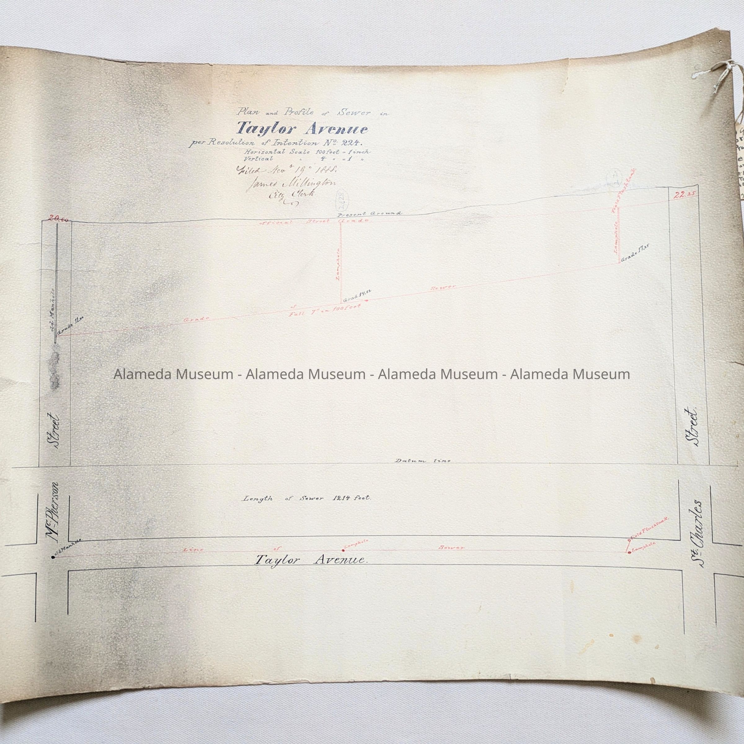 Description: A Plan, hand-drawn on off-white card stock paper, with blocks marked in black ink, and sewer lines in red ink. Title: ‘Plan and Profile of Sewer in Taylor Street per Resolution of Intention No. 224’. Horizontal scale 100 feet to an inch, Vertical scale 4 feet to an inch. Filed November 19th, 1888, James Millington, City Clerk. Has original filing tag from city hall attached.