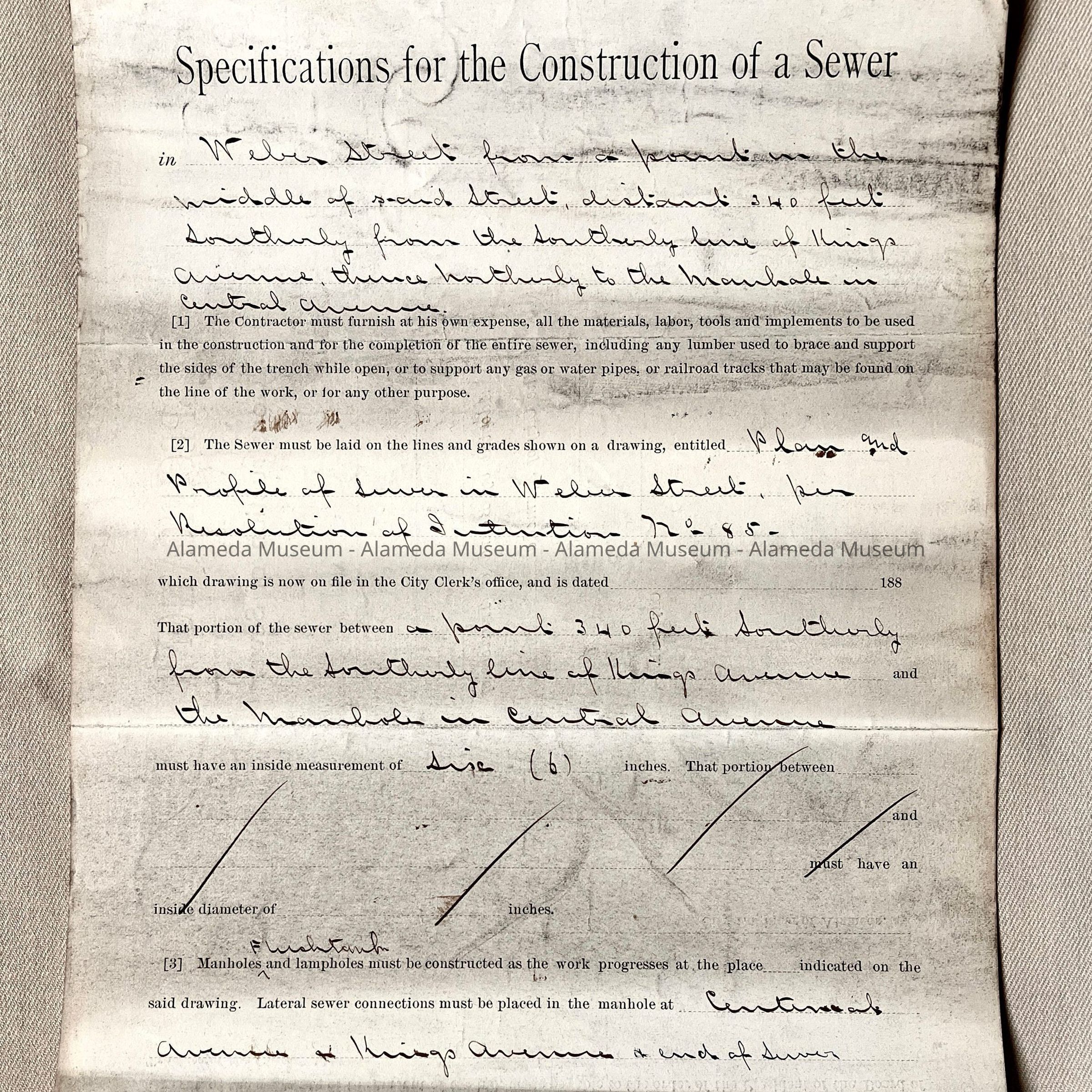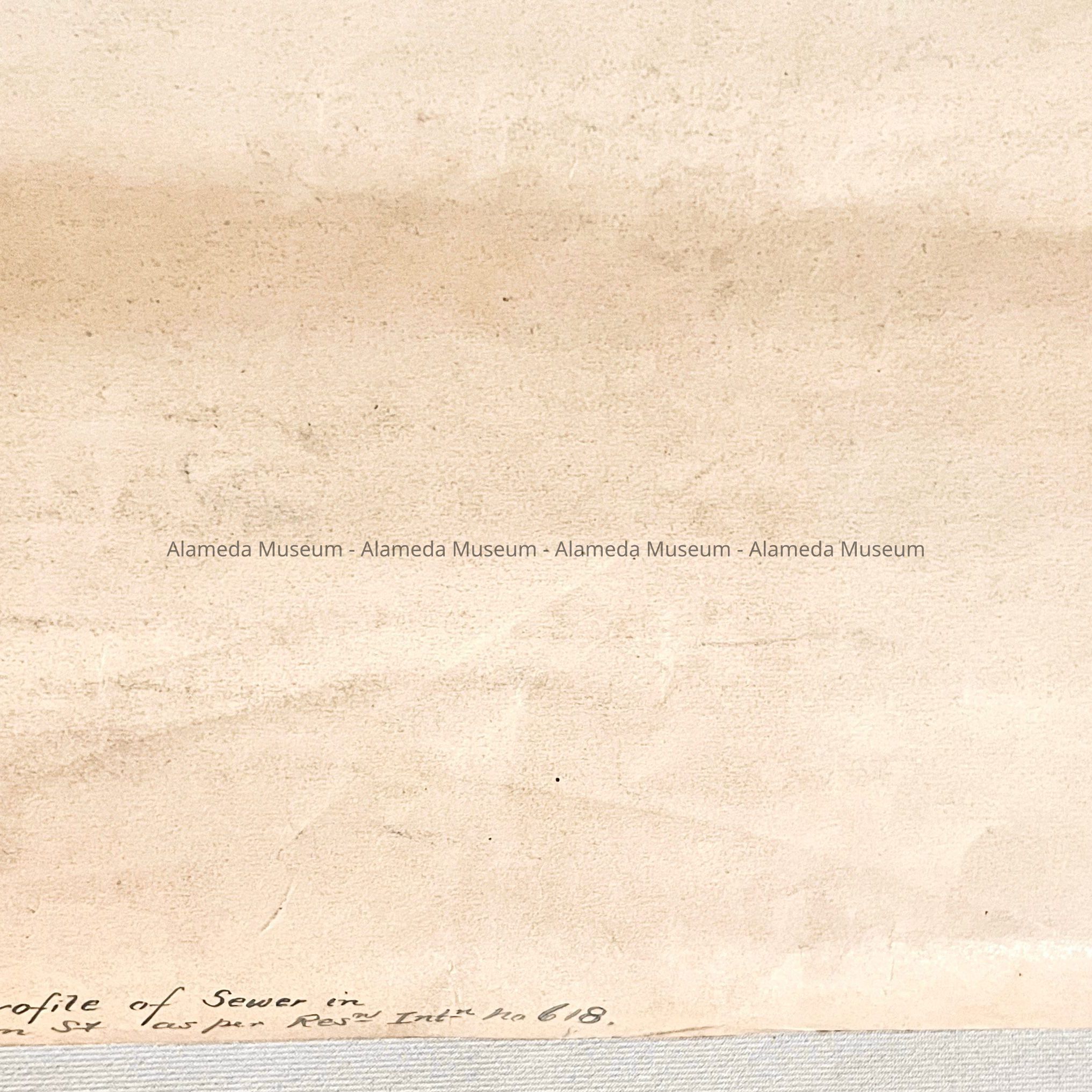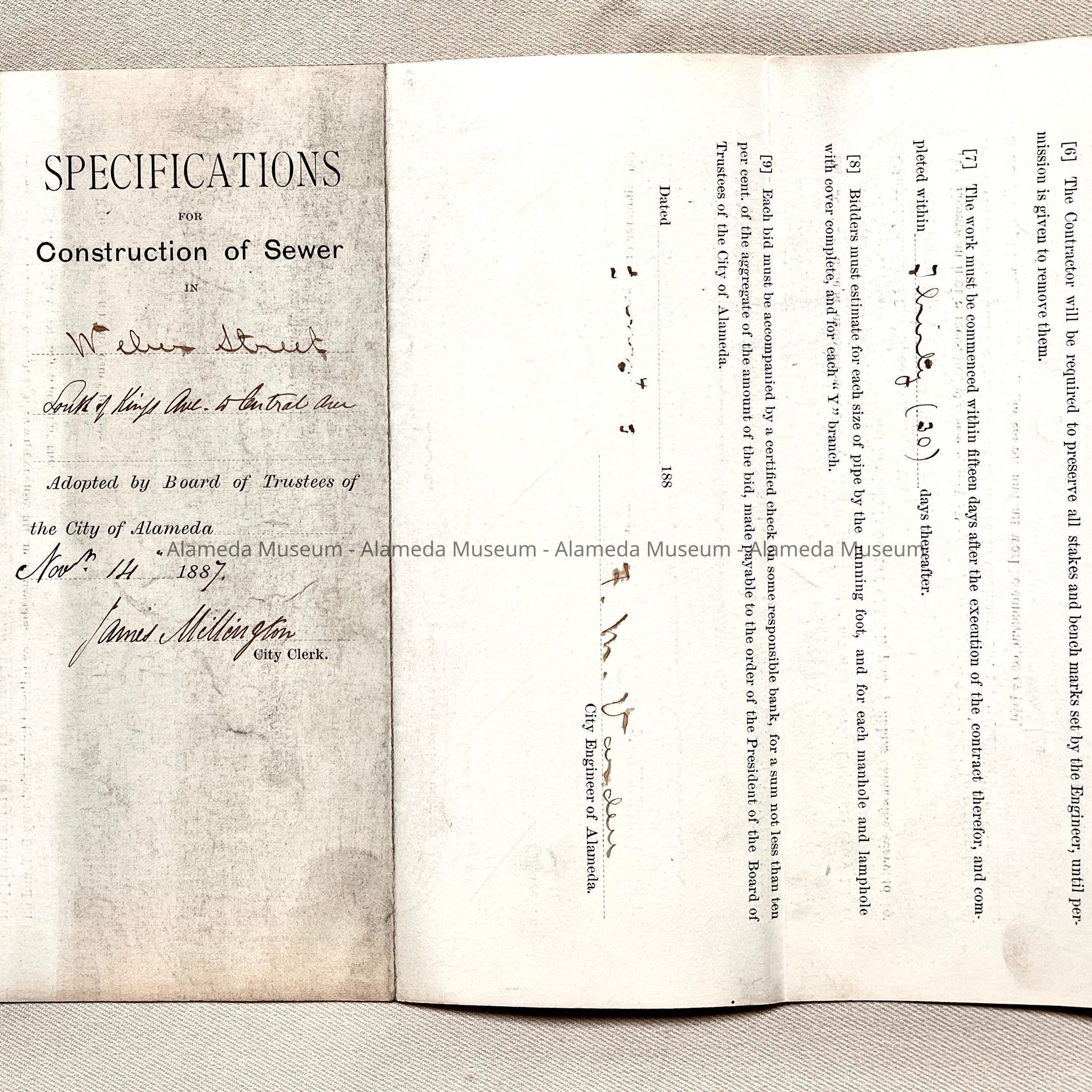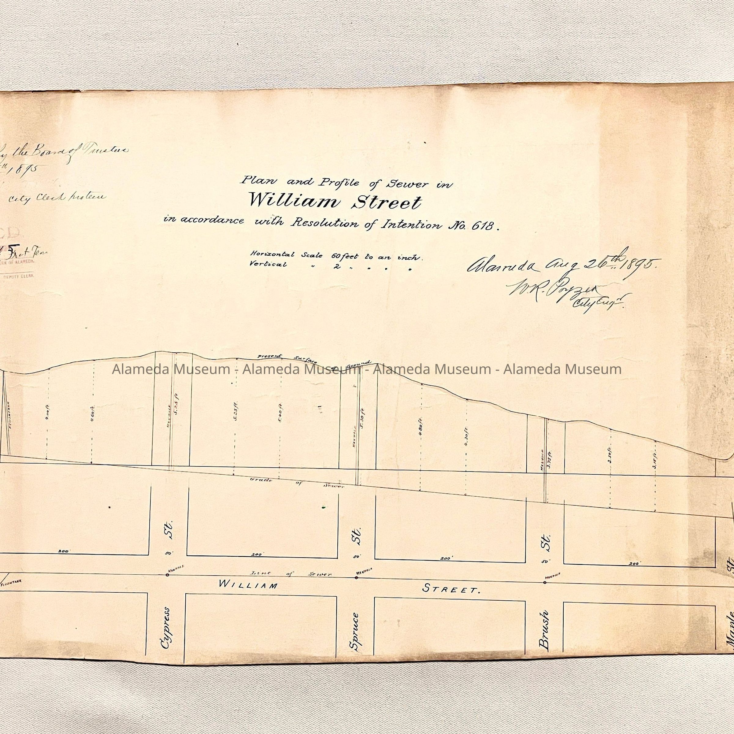 Hand-drawn map and profile (A) and specifications (B) on sturdy card stock paper, titled 'Plan and Profile of Sewer on William Street in accordance with Resolution of Intention No. 618'. Signed and dated to the right of the title: 'Alameda, Aug 26th 1895, W. R. Poyzer, City Engnr' and handwritten addition in ink on the left of the title: 'Adopted by the Board of Trustees August 26th 1875, Attest: City Clerk Pro Tem'. Showing 'William' Street, from Pacific, to Cypress, to Spruce, to Brush, and finally, Mape Streets.
