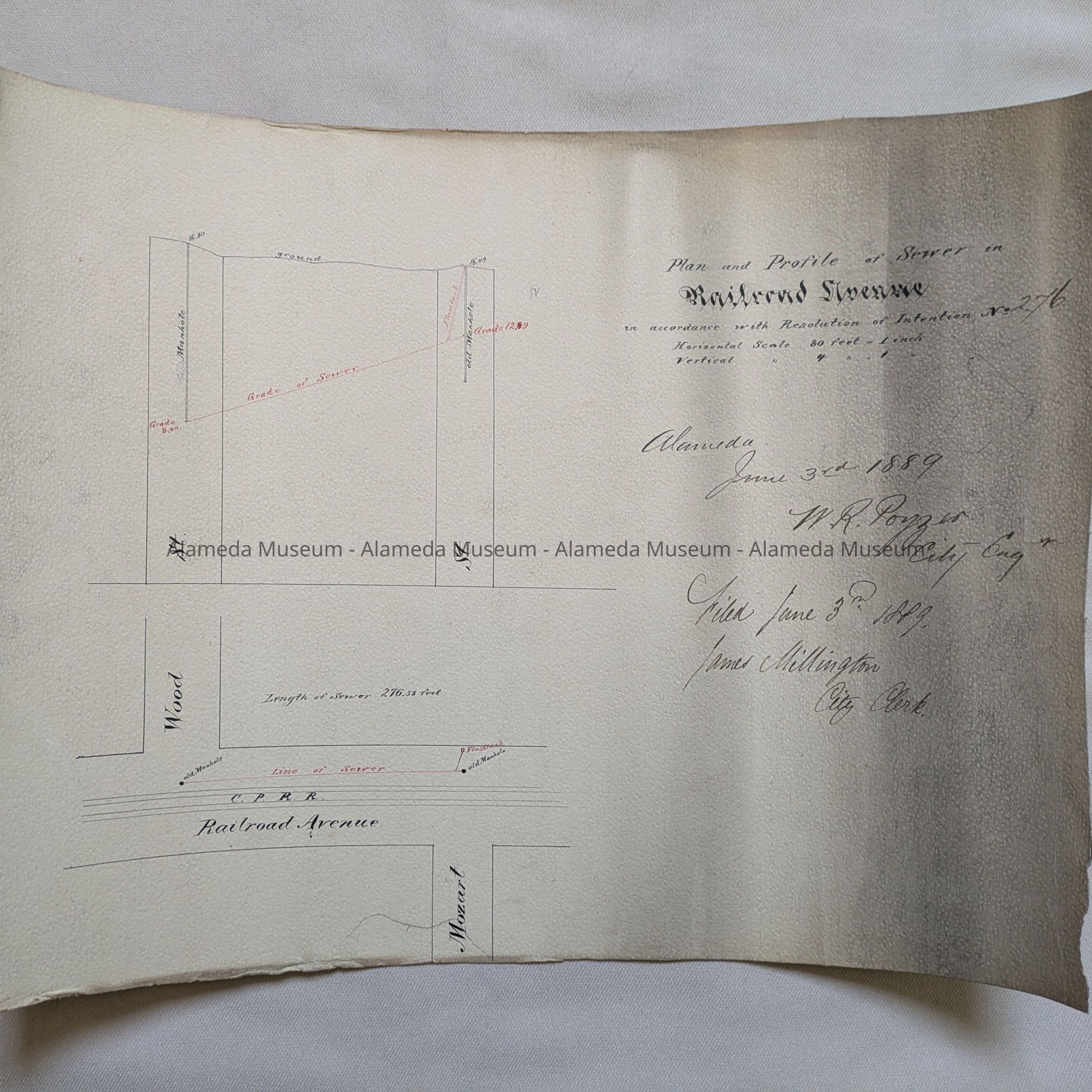 Description: A Plan, hand-drawn on off-white card stock paper, with blocks and manholes marked in black ink and sewer line and grade marked in red ink. Title: ‘Plan and Profile of Sewer of Railroad Avenue in accordance with Resolution of Intention No. 276.’ Horizontal scale 80 feet to an inch / Vertical scale 4 feet to an inch. Drawn by: City Engineer, H. R. Poyser, Alameda, June 3rd, 1889. Adopted and Filed June 3rd, 1889, James Millington, City Clerk. Has original filing tag from city hall attached.