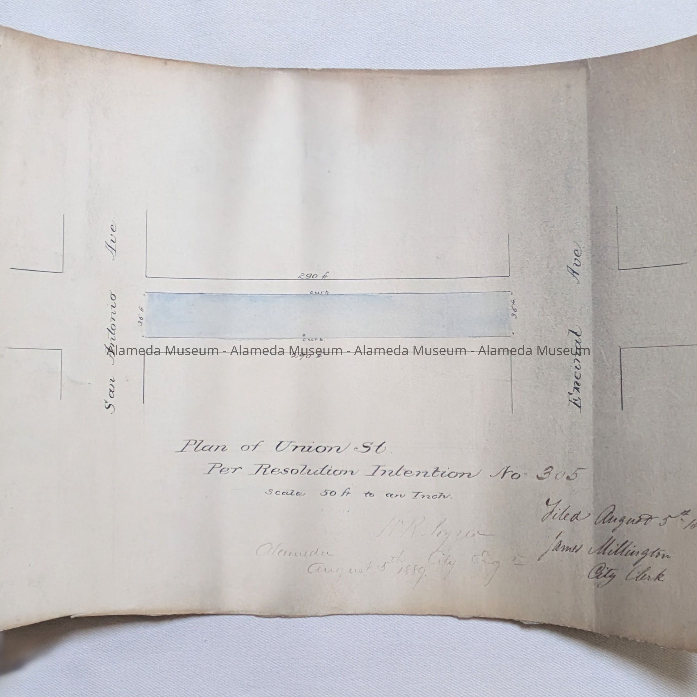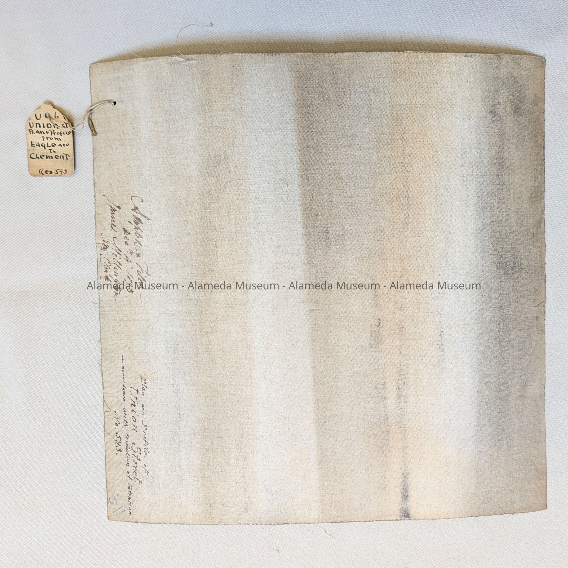 Description: A Plan, hand-drawn on off-white card stock paper, with blocks marked in black ink, and macadamizing in blue ink. Title: ‘Plan and Profile of Union Street in accordance with Resolution of Intention No. 593’. Scale 60 feet to 1 inch, Vertical scale 3 feet to 1 inch. Drawn by: City Engineer H. R. Poyser, Alameda, December 4th, 1893. Adopted and Filed, December 4th, 1893, James Millington, City Clerk. Has original filing tag from city hall attached.