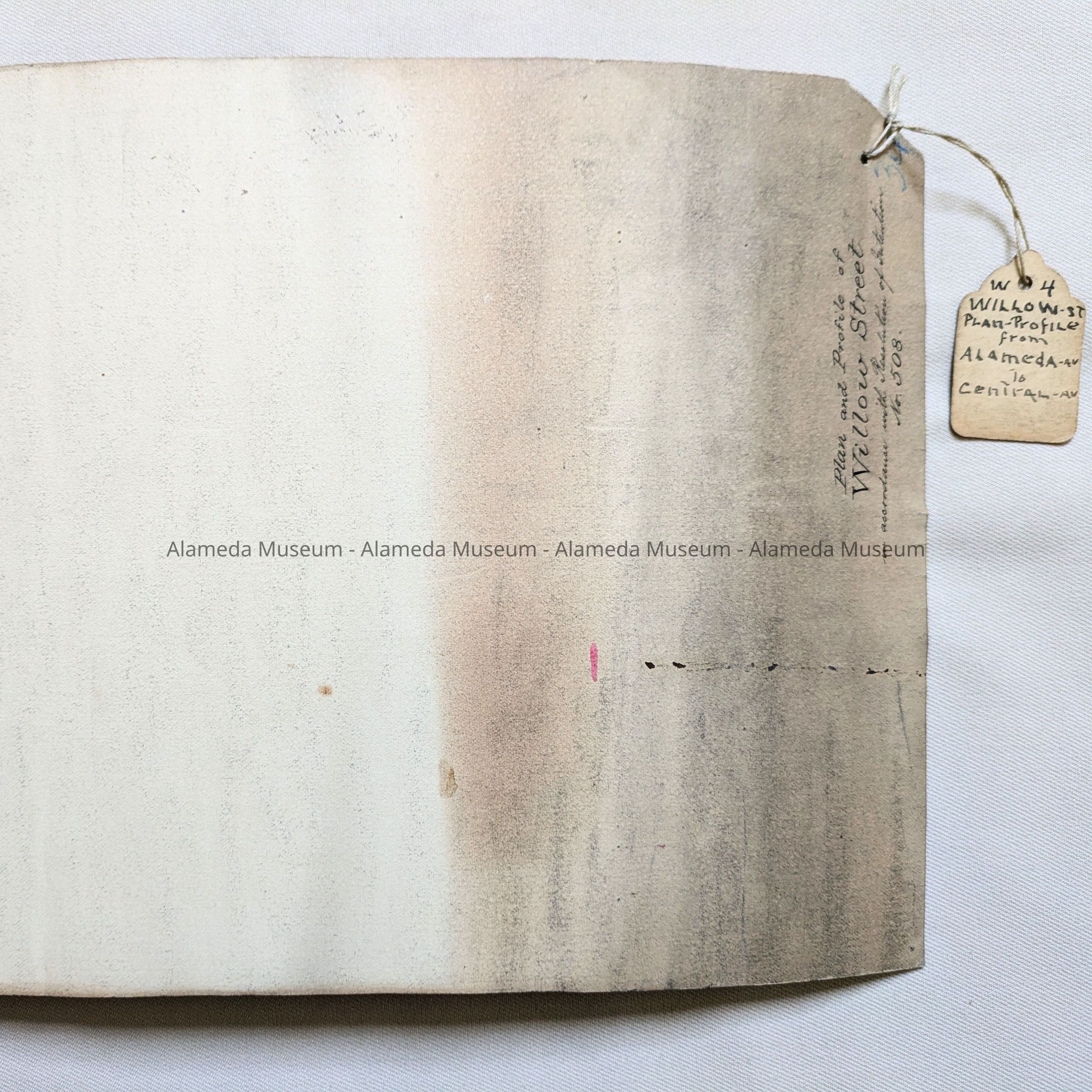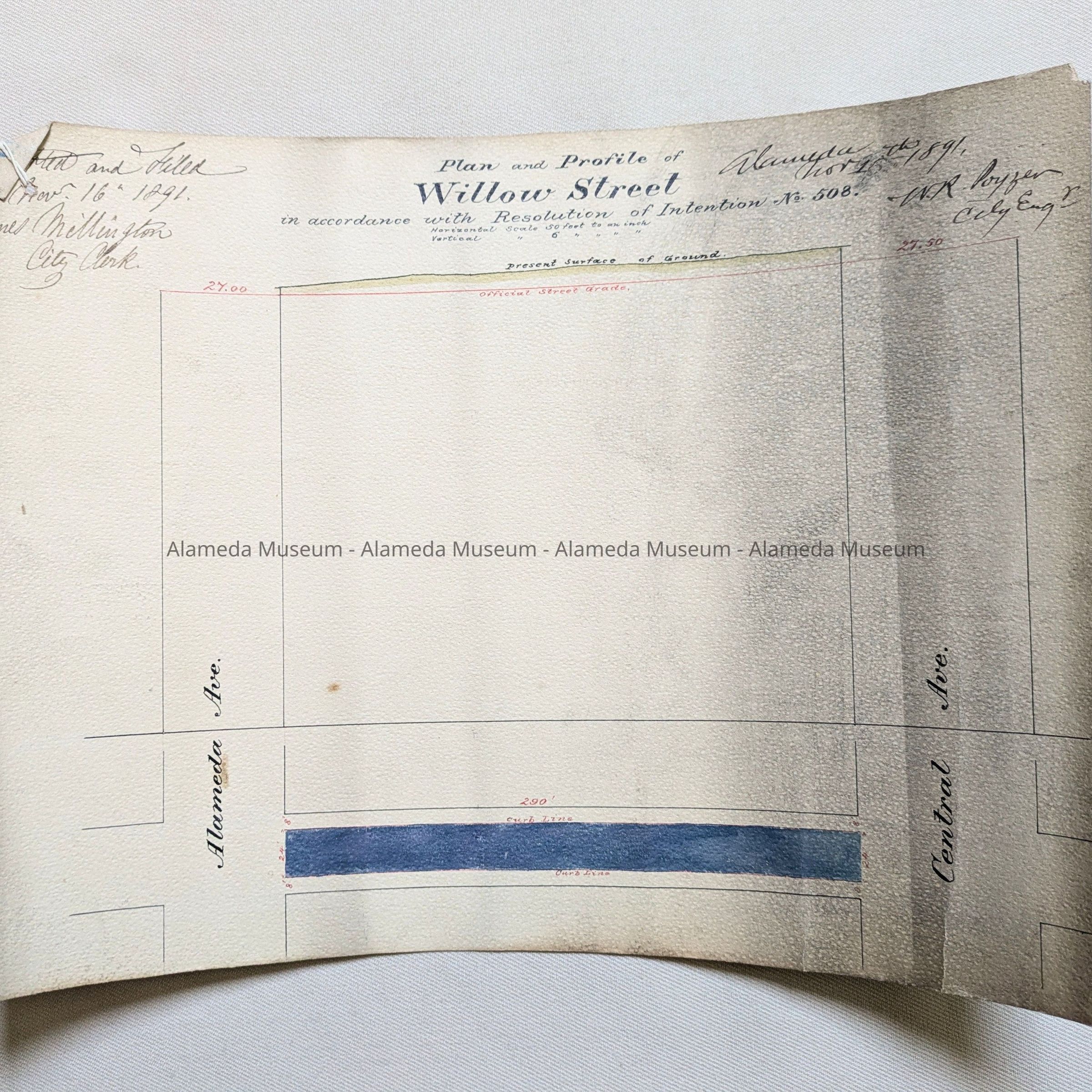 Description: A Plan, hand-drawn on off-white card stock paper, with blocks marked in black ink, and macadamizing in blue ink. Title: ‘Plan and Profile of Willow Street in accordance with Resolution of Intention No. 508’. Horizontal scale 50 feet to an inch, Vertical scale 6 feet to an inch. Drawn by: City Engineer H. R. Poyser, Alameda, November 16th, 1891. Adopted and Filed, November 16th, 1891, James Millington, City Clerk. Has original filing tag from city hall attached.