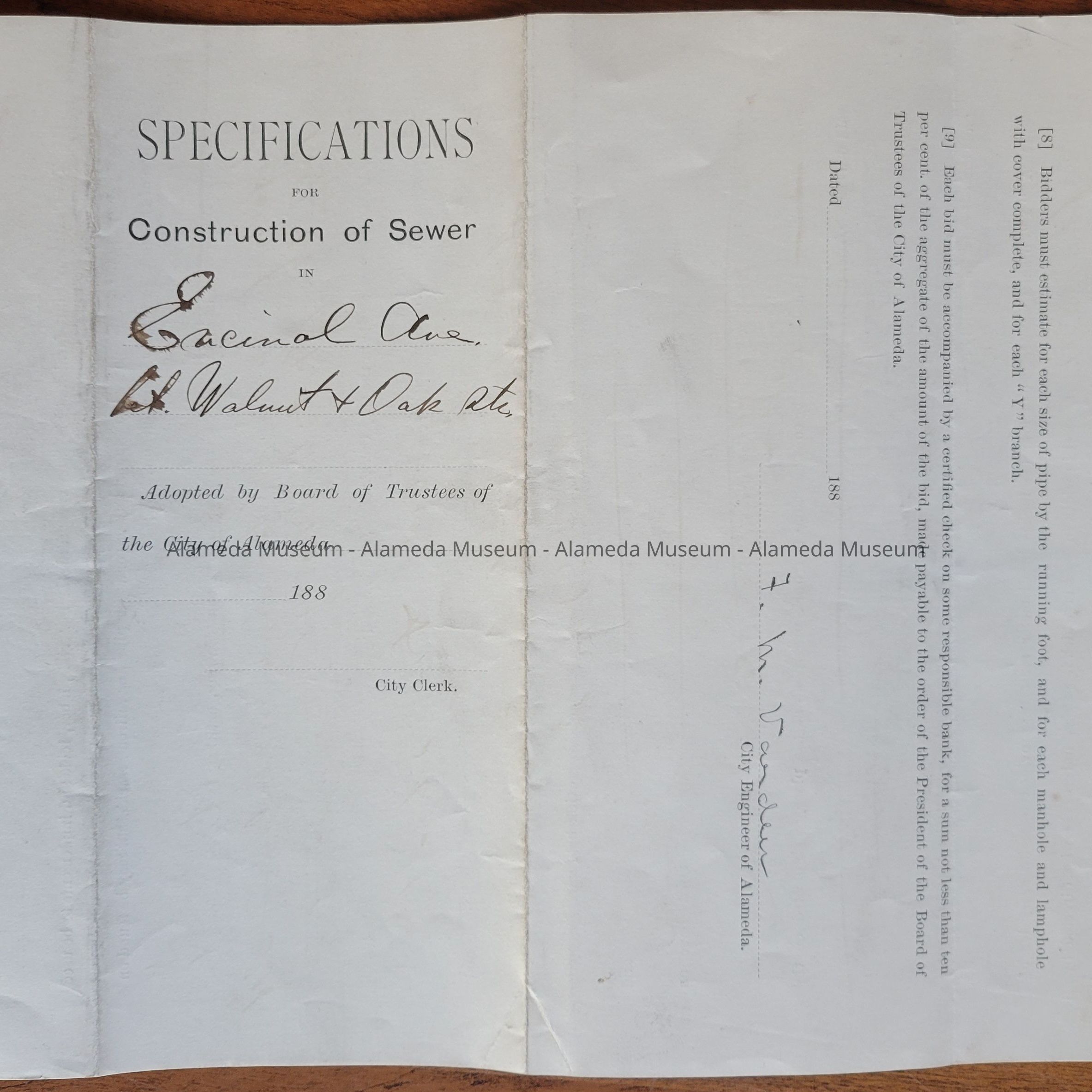 HISTORY OF OBJECTS: PLANS AND SPECIFICATIONS FOR THE CONSTRUCTION OF A SEWER ON ENCINAL AVENUE BETWEEN PARU AND PARK STREETS, PER RESOLUTION OF INTENTION NO. 100, AND SIGNED ON OCTOBER 3, 1887 BY JAMES MILLINGTON, CITY CLERK.