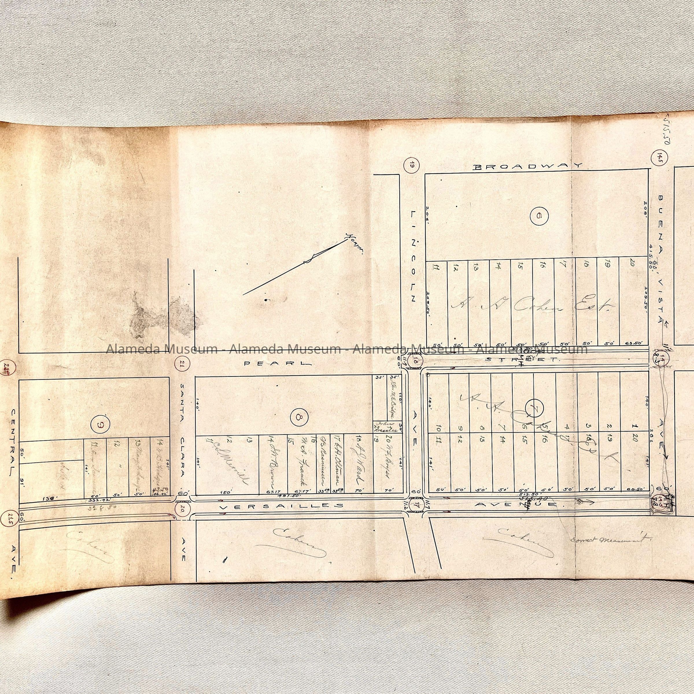 HISTORY OF OBJECT: PLAN OF THE EXTENSION OF PEARL AND VERSAILLES STREETS THROUGH THE COHEN PROPERTY. THE PLAN ALSO GIVES NAMES OF PROPERTY OWNERS LOCATED IN THE AREA.