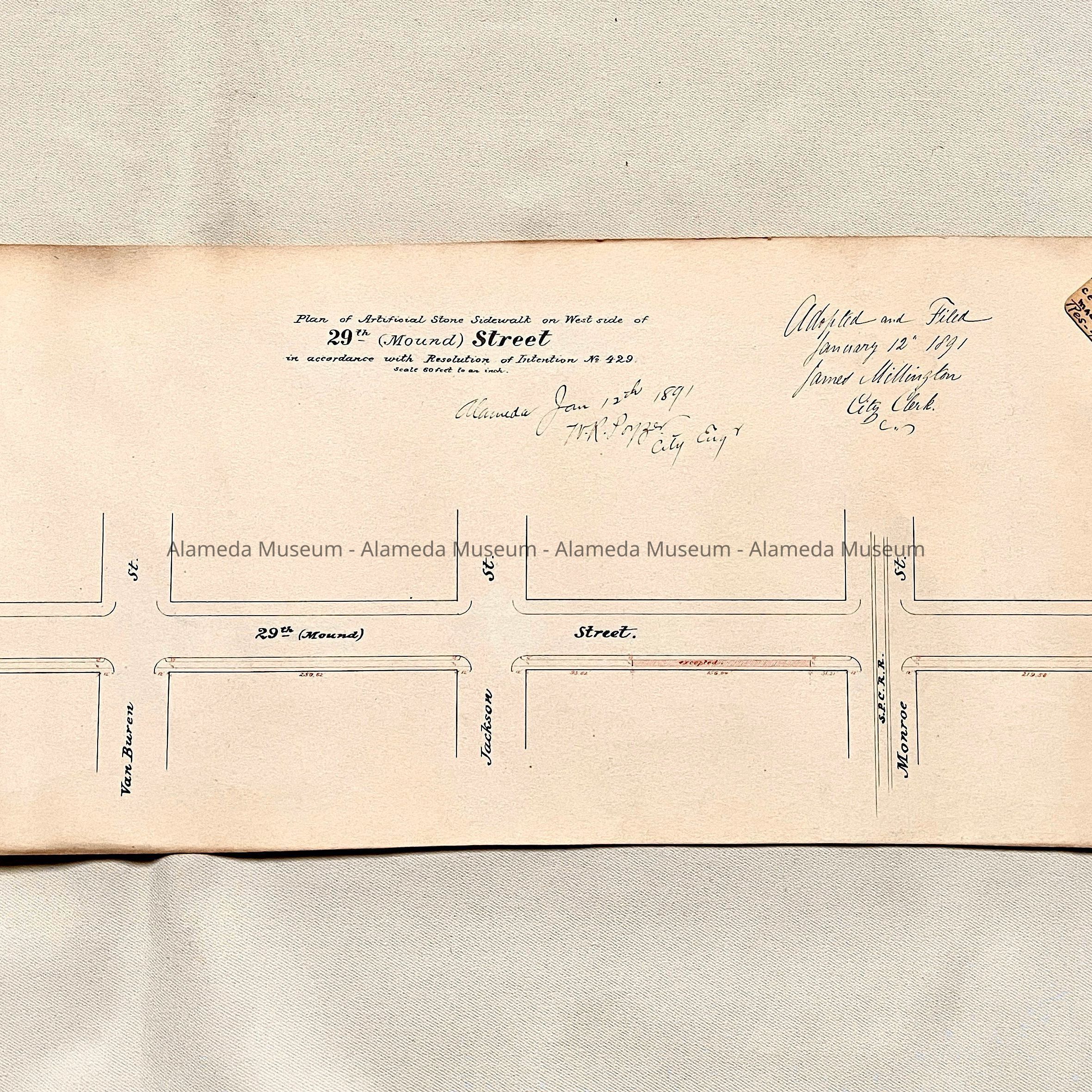 PLAN OF AN ARTIFICIAL STONE SIDEWALK TO BE LAID ON THE WEST SIDE OF 29 th STREET (NOW KNOWN AS MOUND). ADOPTED AND FILED ON JANUARY 12, 1891; JAMES MILLINGTON, CITY CLERK.