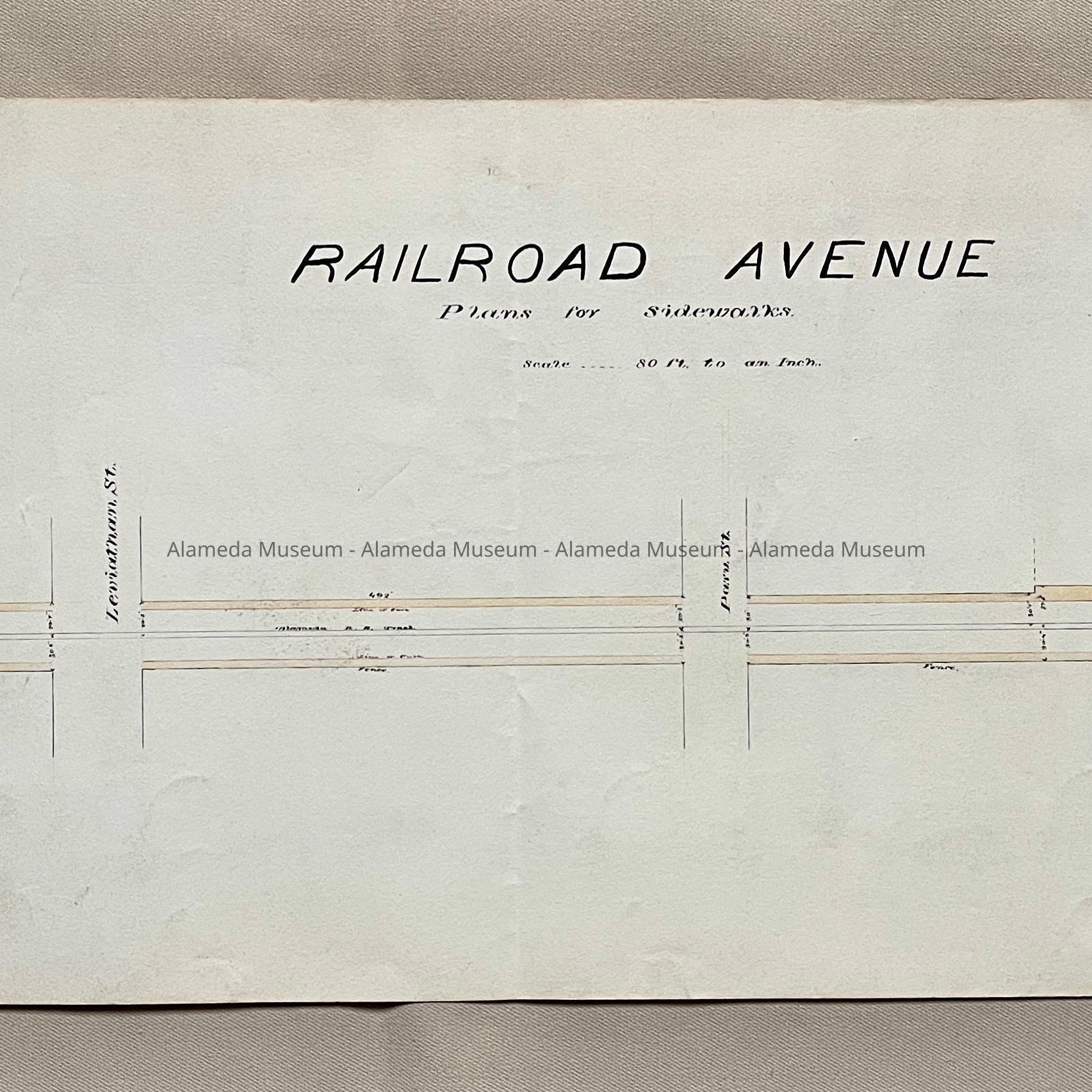 PLAN FOR SIDEWALK ON RAILROAD AVENUE BETWEEN PIKE, LEVIATHAN STREETS (NOW GRAND AND PARU STREETS), ALAMEDA, CA.