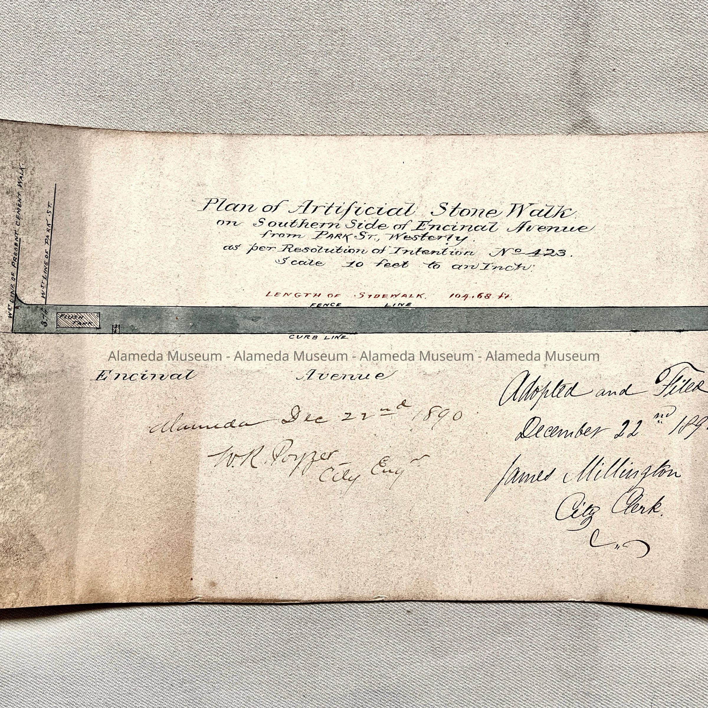 HISTORY OF OBJECT: PLAN OF AN ARTIFICIAL STONEWALK ON THE SOUTH SIDE OF ENCINAL AVENUE, ALAMEDA, FROM PARK STREET WESTERLY. PLAN WAS ADOPTED AND FILED ON DECEMBER 26, 1890 AND SIGNED BY JAMES MILLINGTON, CITY CLERK. THE PLAN WAS CREATED FOR RESOLUTION OF INTENTION NO. 423.