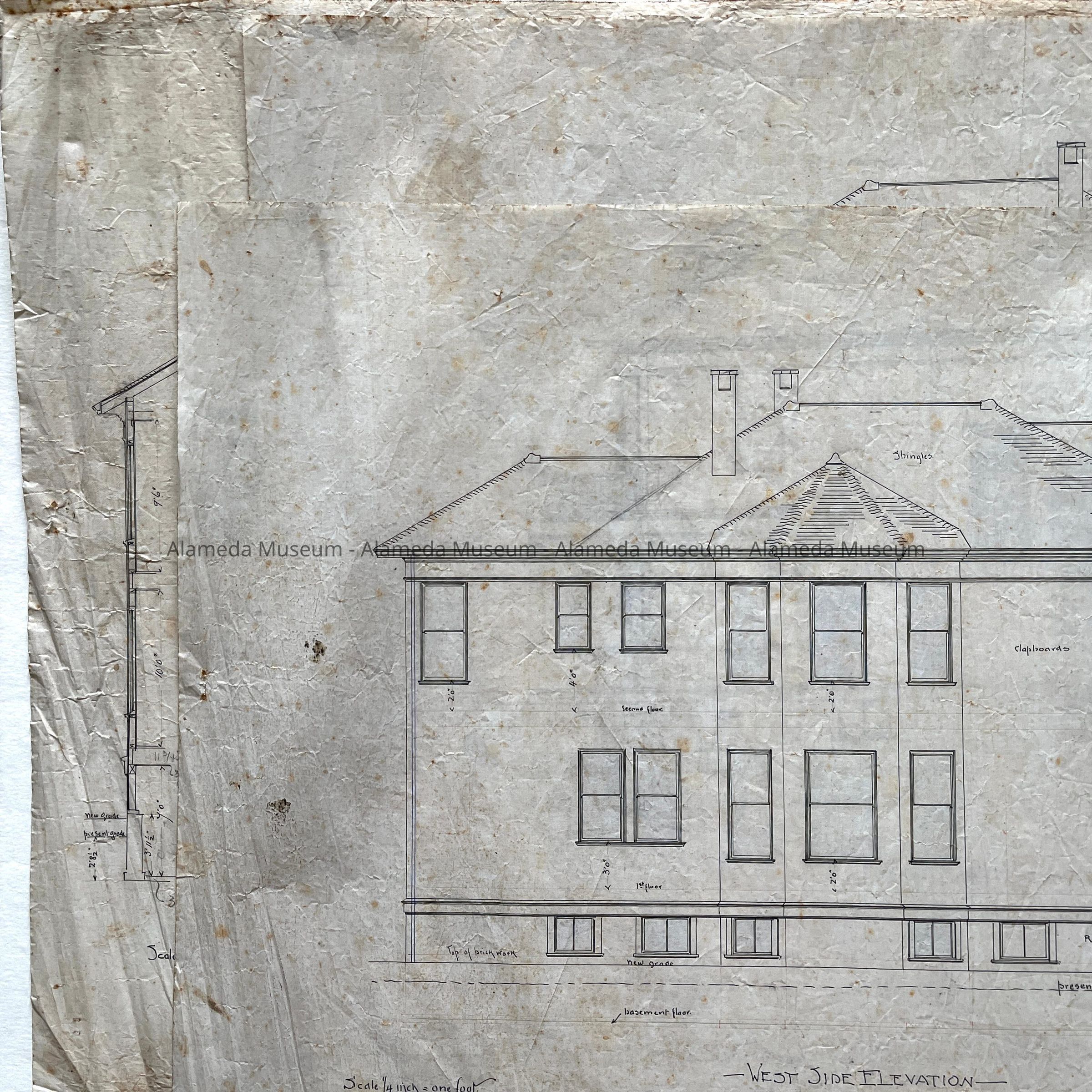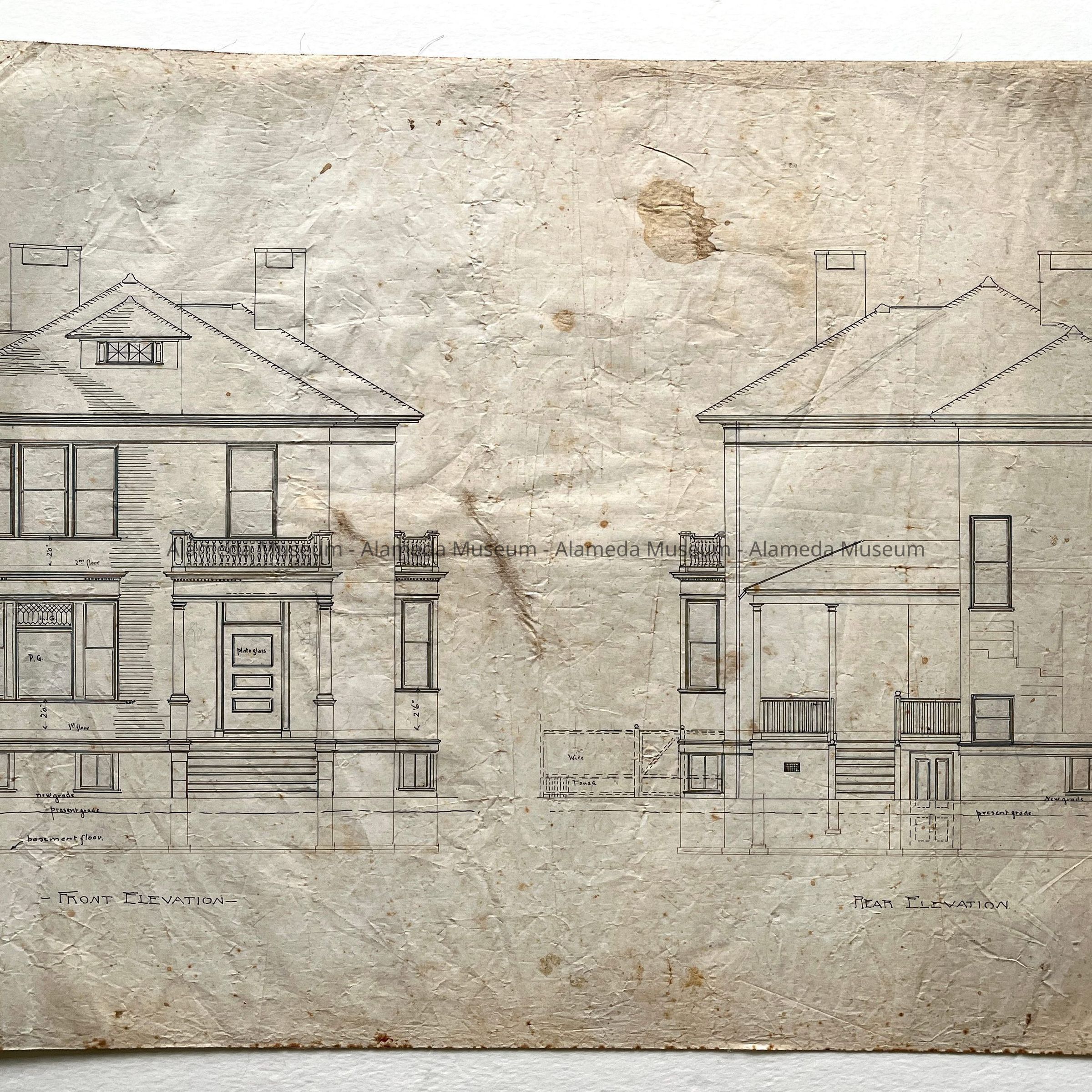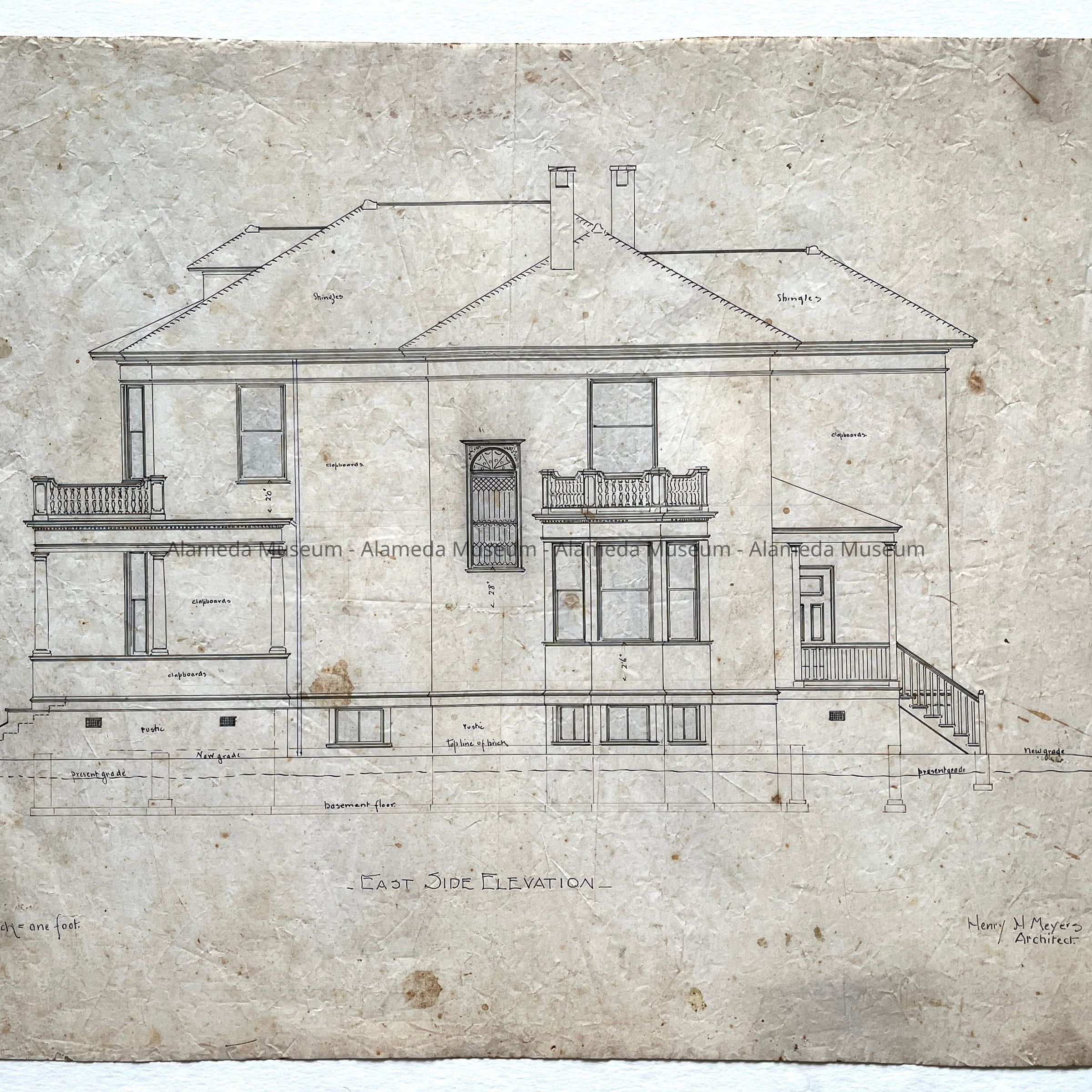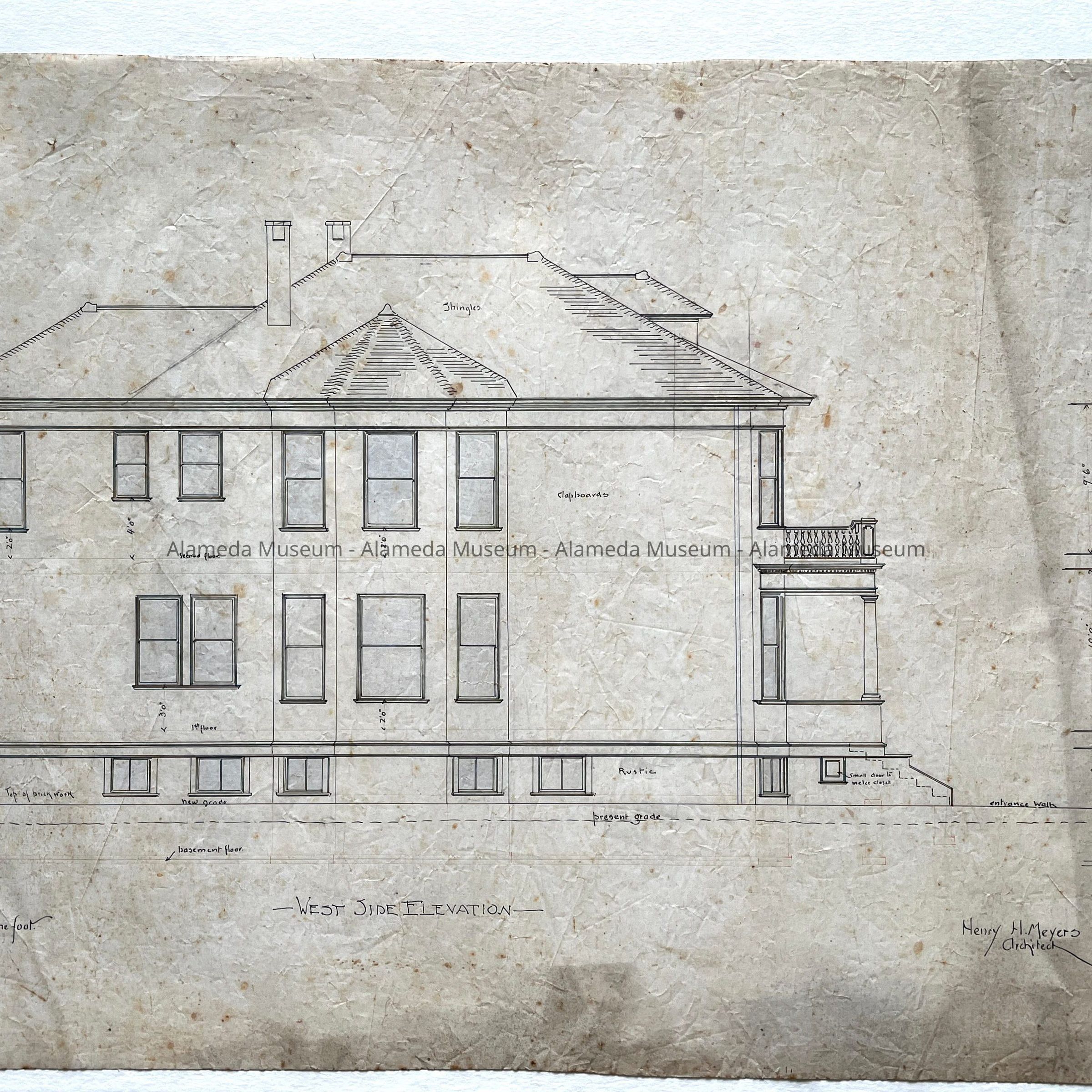 HISTORY OF OBJECT: ORIGINAL PLAN DEPICTING EAST, WEST, FRONT, AND REAR ELEVATIONS. DRAWN BY HENRY H MEYERS, ARCHITECT, FOR HIS PRIVATE RESIDENCE AT 2021 ALAMEDA AVENUE, ALAMEDA, CA.