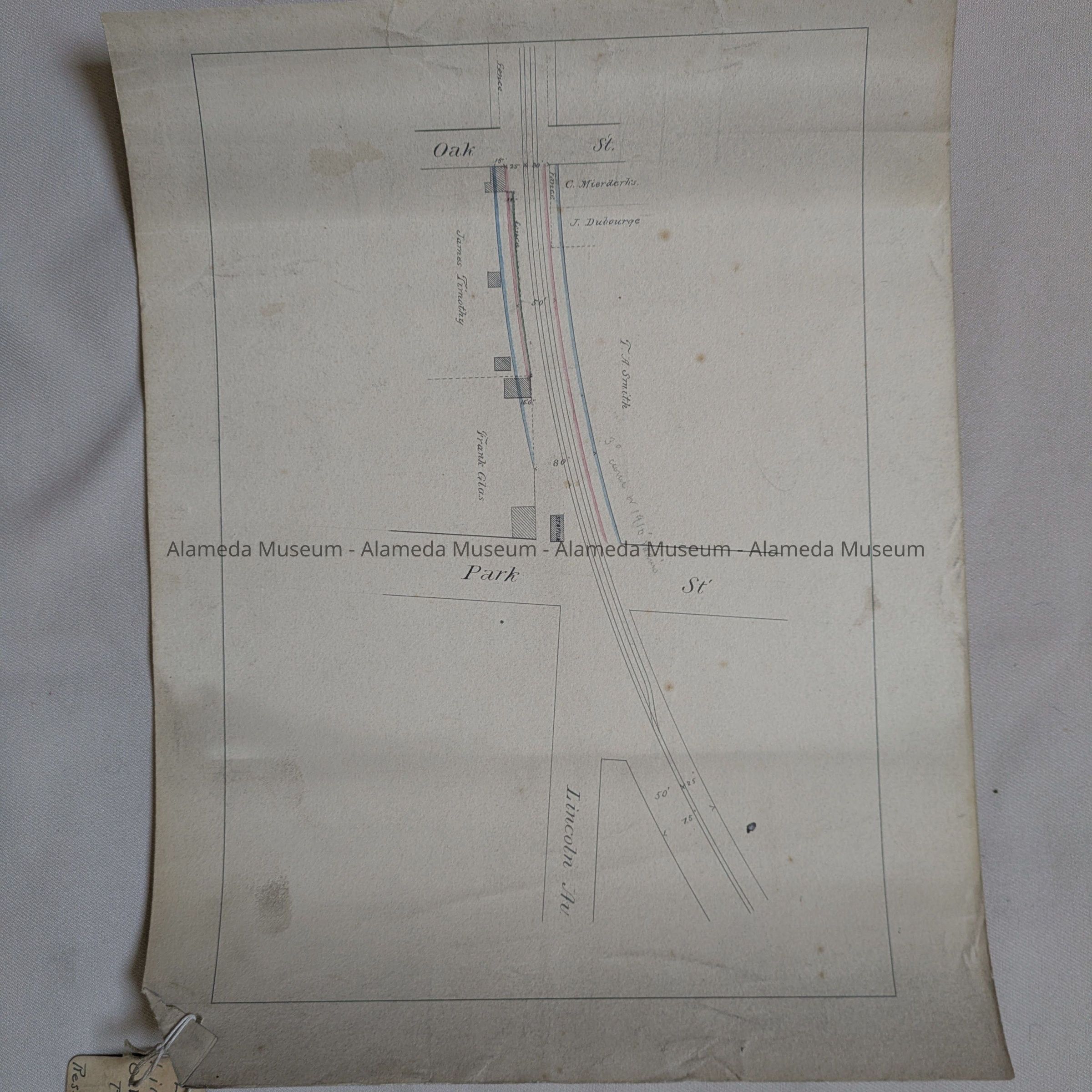 Description: A Plan, hand-drawn on off-white card stock paper, with blocks and railroad lines marked in black ink, fence and property lines in red and blue ink. Title: ‘Plan of Lincoln, Oak, Part’. In pencil, ‘3 degree curve or 1910 radius’. Has original filing tag from city hall attached.