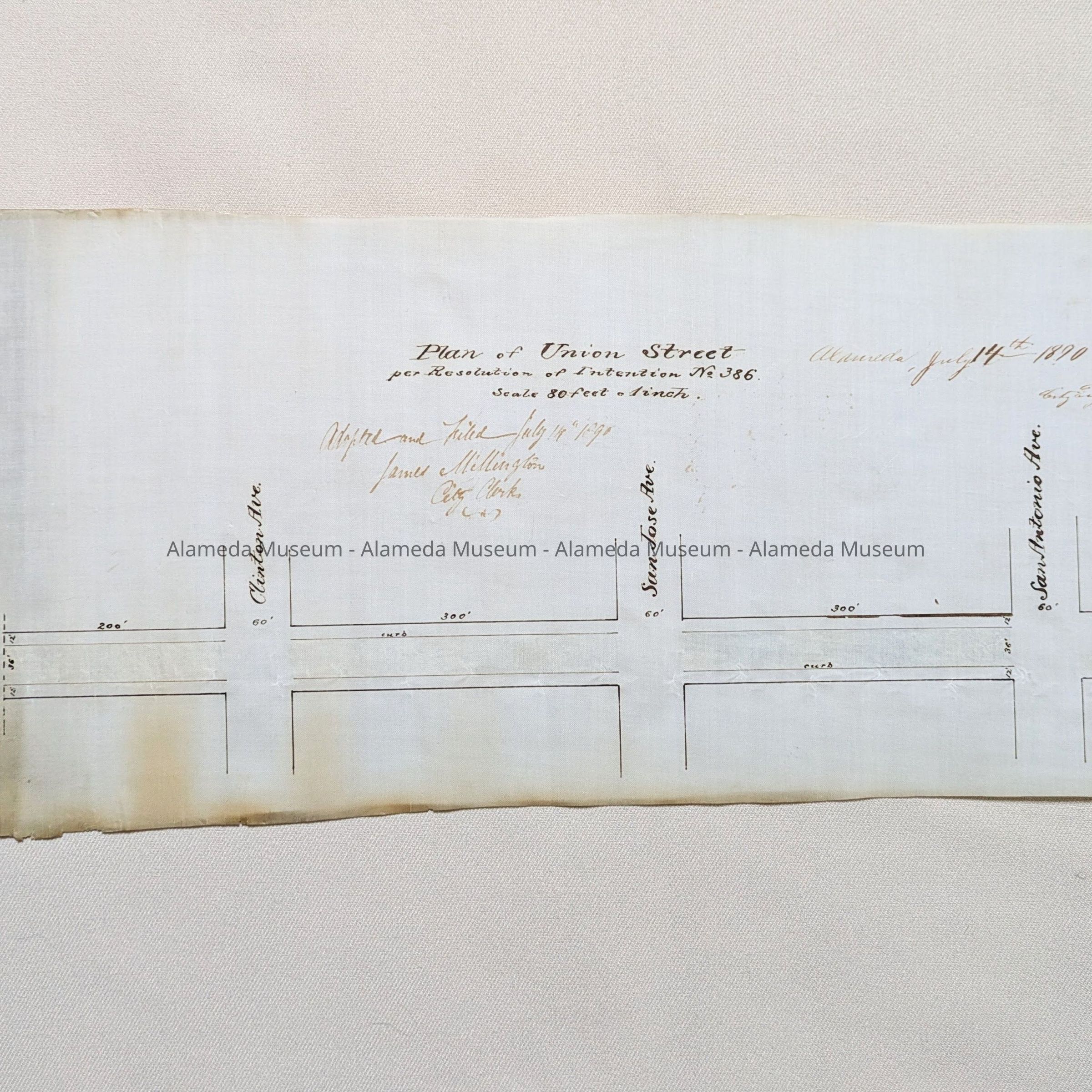 Description: A Plan, hand-drawn on linen paper, with blocks marked in black ink, macadamization in faded blue ink. Title: ‘Plan of Union Street per Resolution of Intention No. 386.' Scale 80 ft to an inch. Drawn by: City Engineer, Alameda, July 14th, 1890. Has original filing tag from city hall attached.