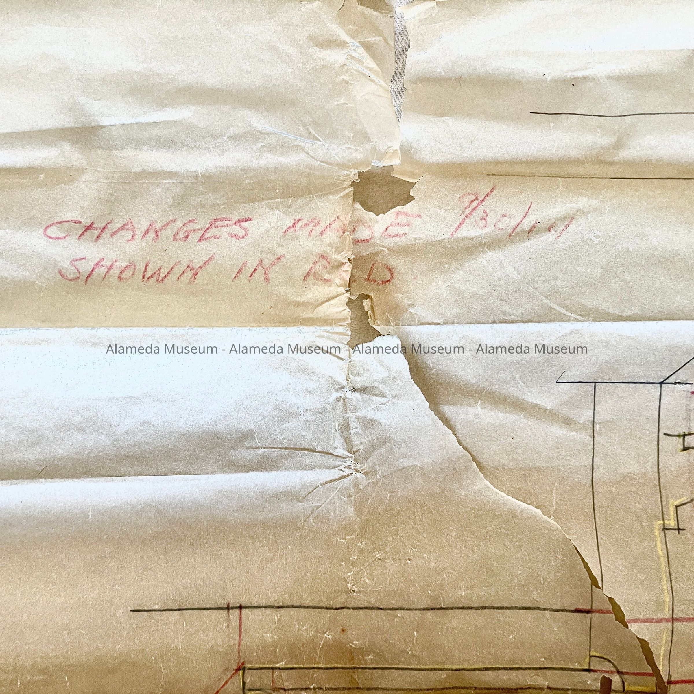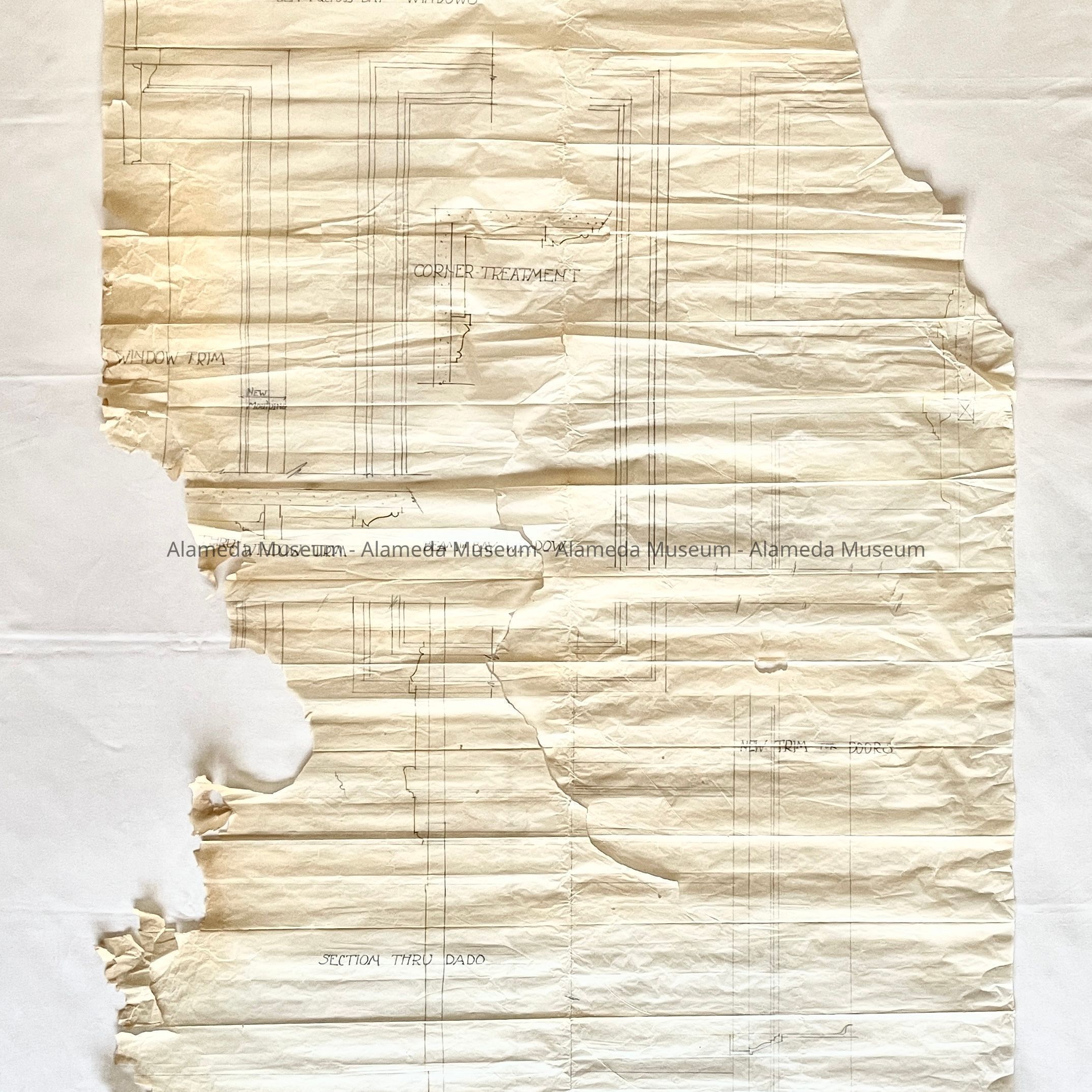 PLAN, HAND-DRAWN IN PENCIL ON DELICATE TISSUE PAPER THAT IS IN VERY POOR CONDITION. BOLD CAPTION READS, "F. S. DETAIL OF TRIM FOR RESIDENCE OF HENRY H MEYERS." 2021 ALAMEDA AVENUE, ALAMEDA, CALIFORNIA.