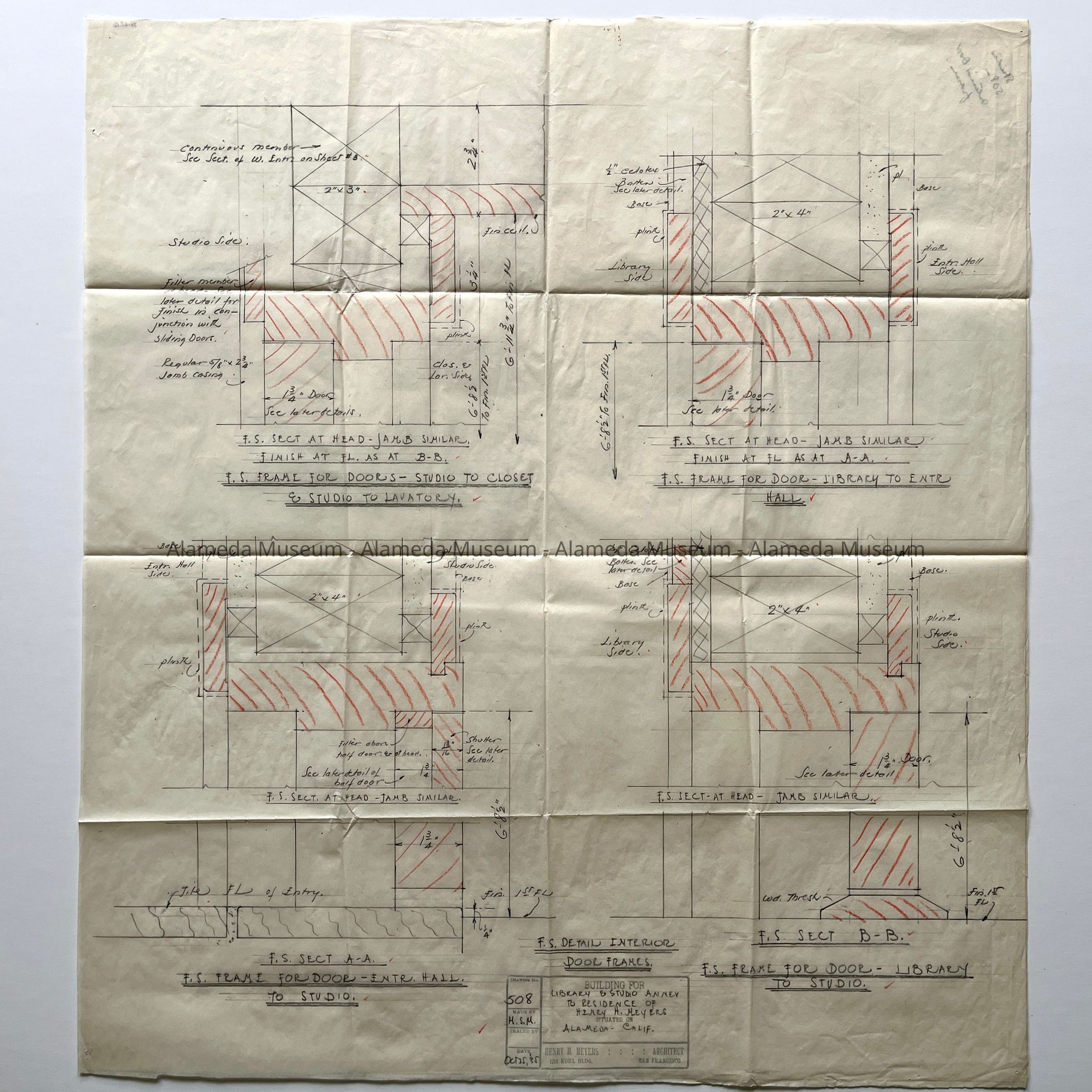 PLANS DEPICTING DOOR FRAMES, INTERIOR LIBRARY AND STUDIO ANNEX, 2024 CENTRAL AVENUE, ALAMEDA, CALIFORNIA. PLANS PREPARED BY MILDRED S MEYERS ON OCTOBER 25, 1935. MILDRED WAS THE DAUGHTER OF HENRY H MEYERS, ARCHITECT. FAMILY RESIDED AT 2021 ALAMEDA AVENUE, ALAMEDA, CA.