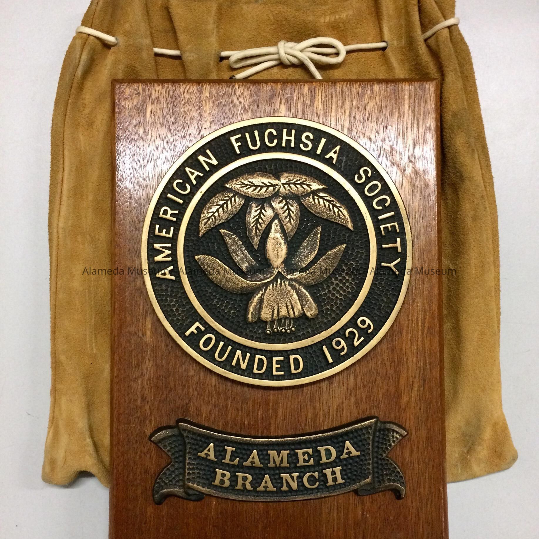 Description: Wooden plaque with attached circular shaped bronze emblem with additional bronze emblem in the form of a banner. Circular emblem states American Fuchsia Society Founded 1929. Banner emblem states Alameda Branch. Plaque supported by brass easel type stand.