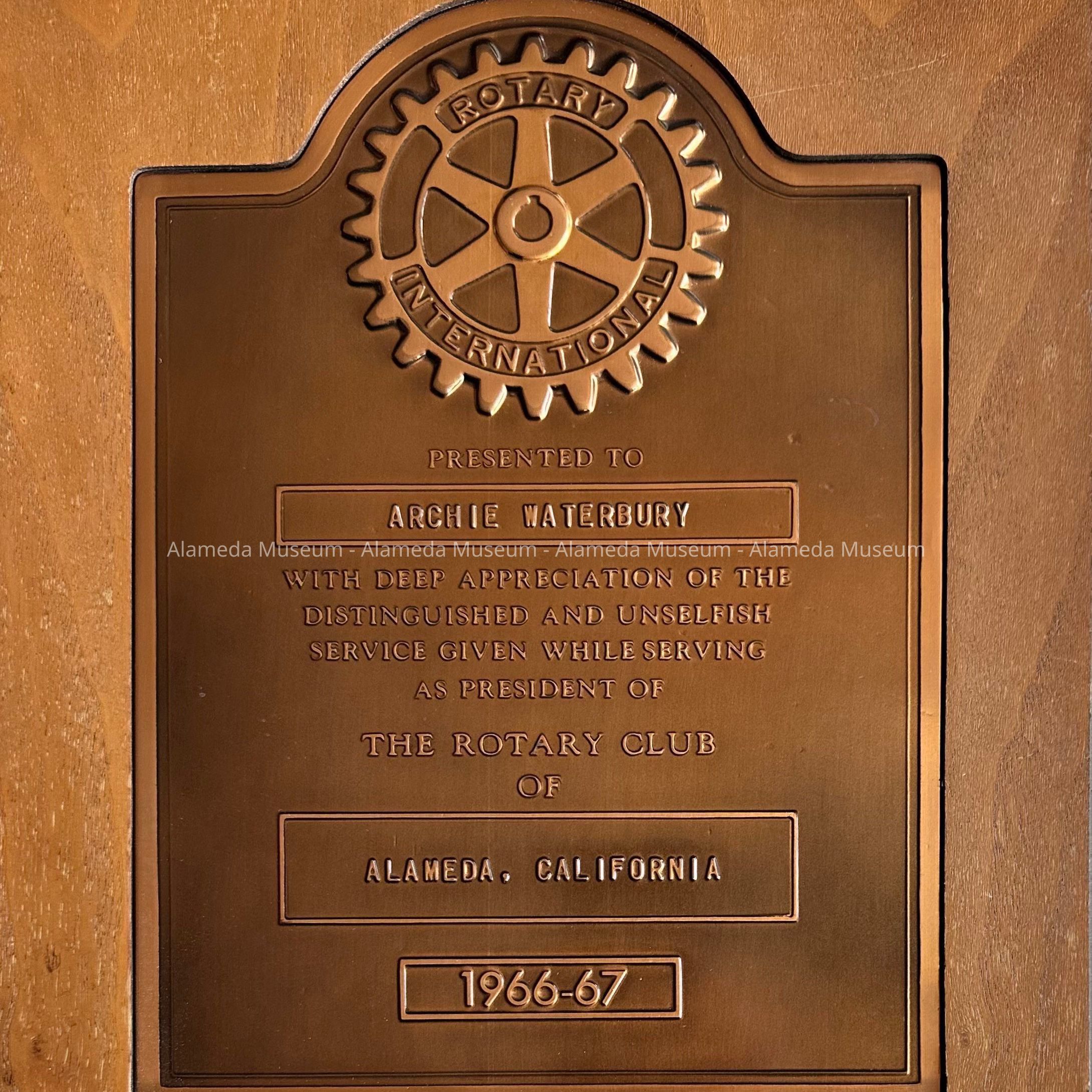 History of Object: This plaque was presented to Archie Waterbury for his devoted service as president of the Alameda Rotary Club, 1966-1967. The late Mr. Waterbury was born and raised in Alameda; he worked for the Alameda Fire Dept for many years, eventually becoming assistant fire chief.