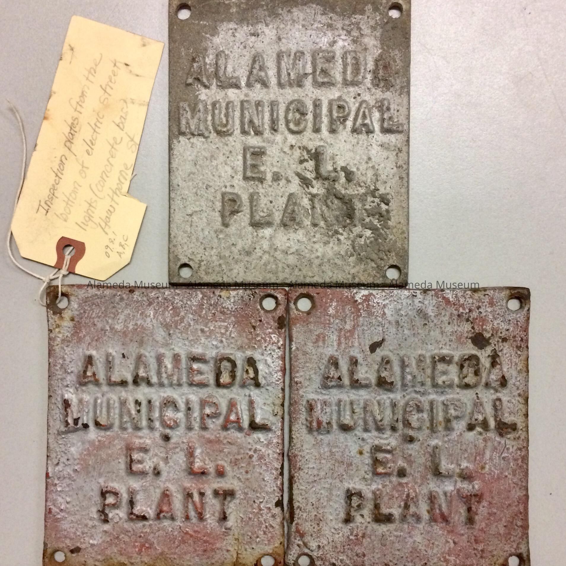 THREE IDENTICAL EMBOSSED IRON PLAQUES. EMBOSSED RAISED LETTERING STATES, "ALAMEDA MUNICIPAL ELECTRIC LIGHT PLANT."