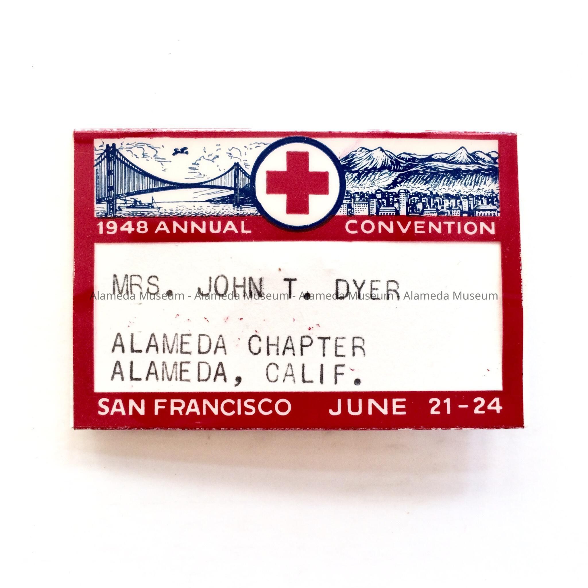 BADGE WORN BY MRS JOHN T DYER (DOROTHY), REPRESENTING THE ALAMEDA CHAPTER OF THE AMERICAN RED CROSS AT A CONVENTION HELD IN SAN FRANCISCO FROM JUNE 21 THRU JUNE 24, 1948.