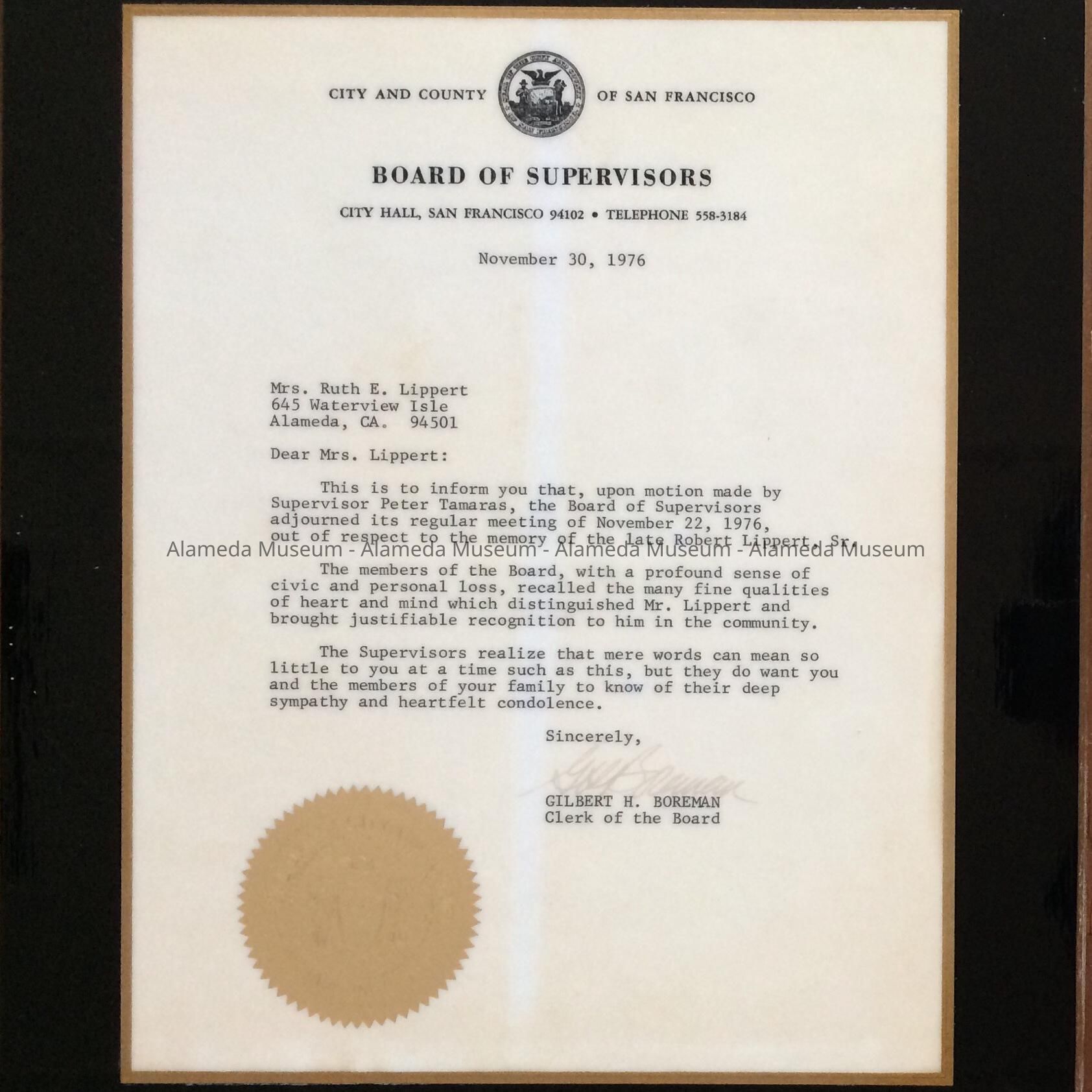 Description: Plasticized Plaque, with black paint border and gold trim, of a letter of condolences from the Board of Supervisors of the City and County of San Francisco to Mrs. Ruth E. Lippert, Alameda, on the death of her husband, Robert L. Lippert.