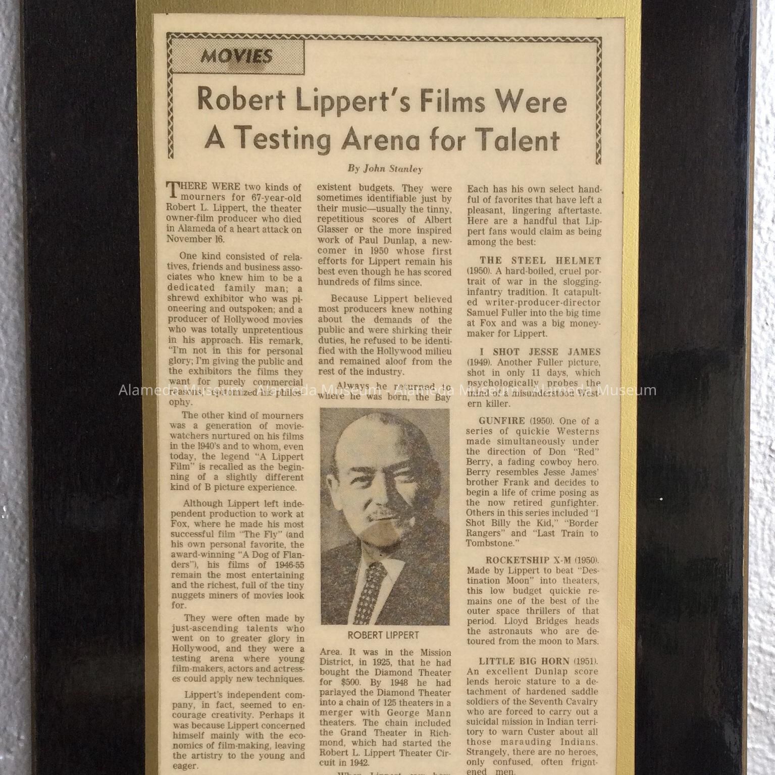 Plasticized plaque of Examiner and Chronicle Newspaper Clipping Plaque about Robert Lippert, 1976Entry/Object ID