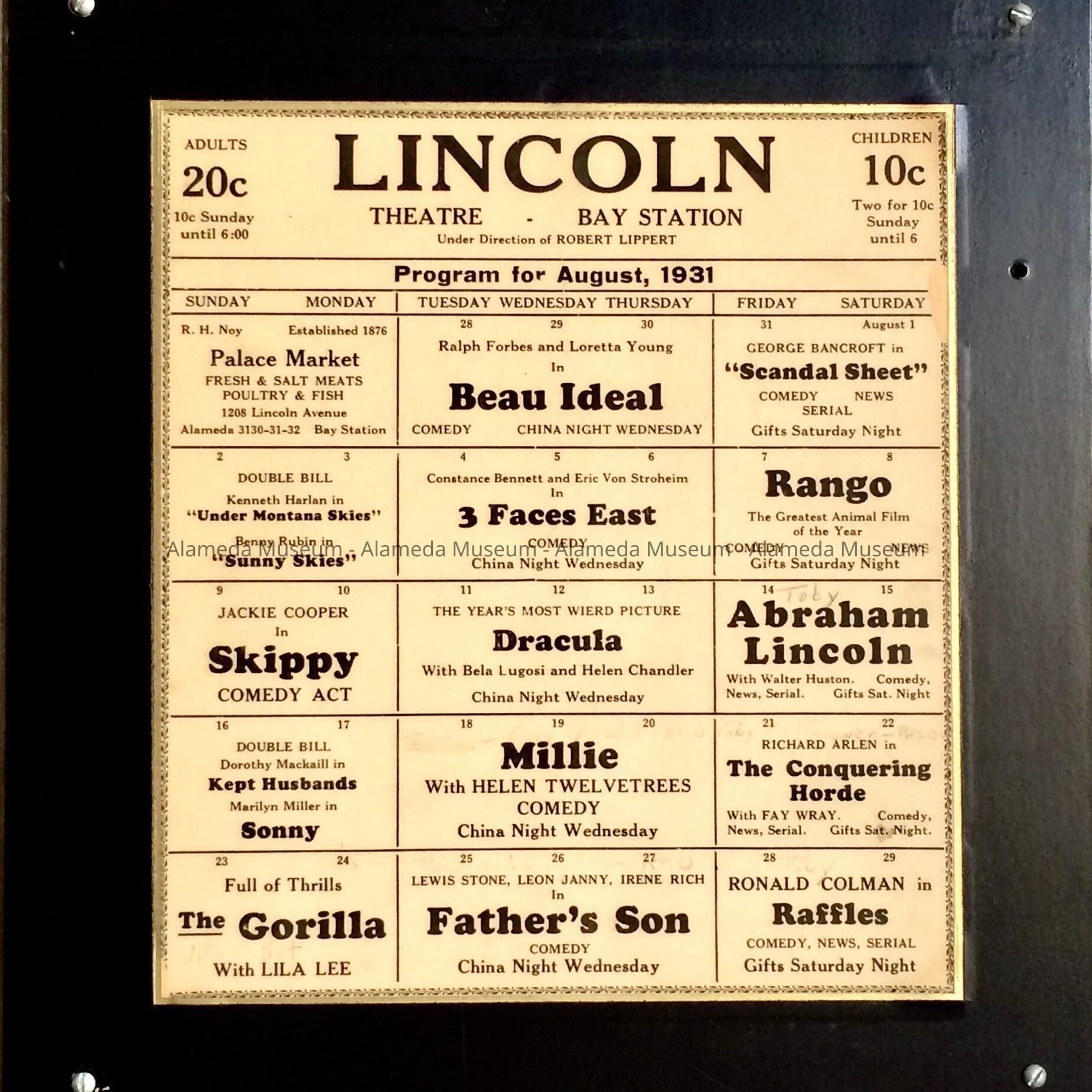Description: Plasticized Plaque, with black paint border and gold trim, of a flyer with the program of upcoming showings at Lincoln Theatre, Bay Station, for August, 1931, under direction of Robert Lippert.