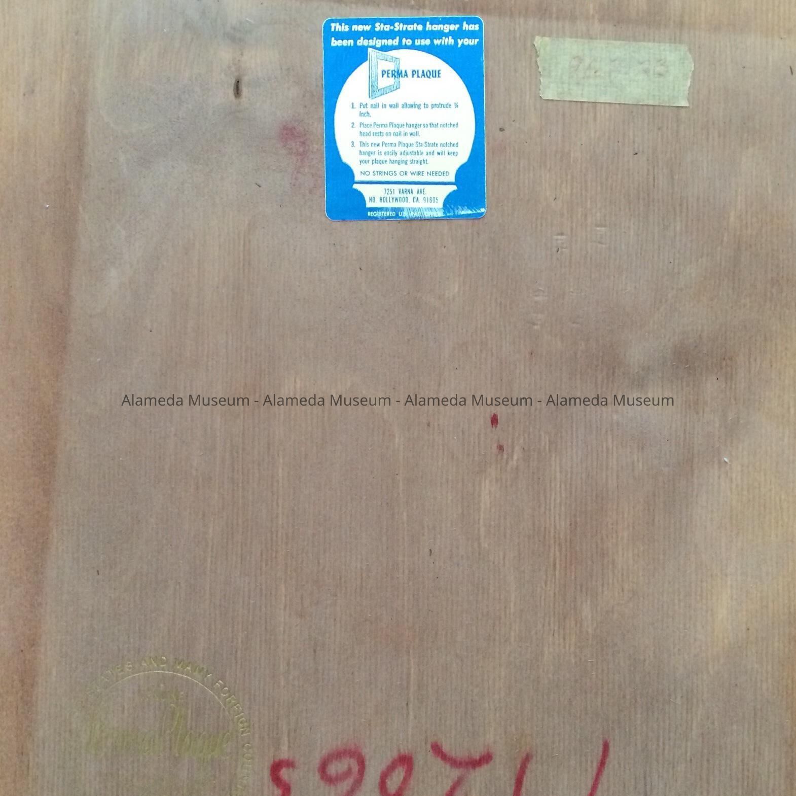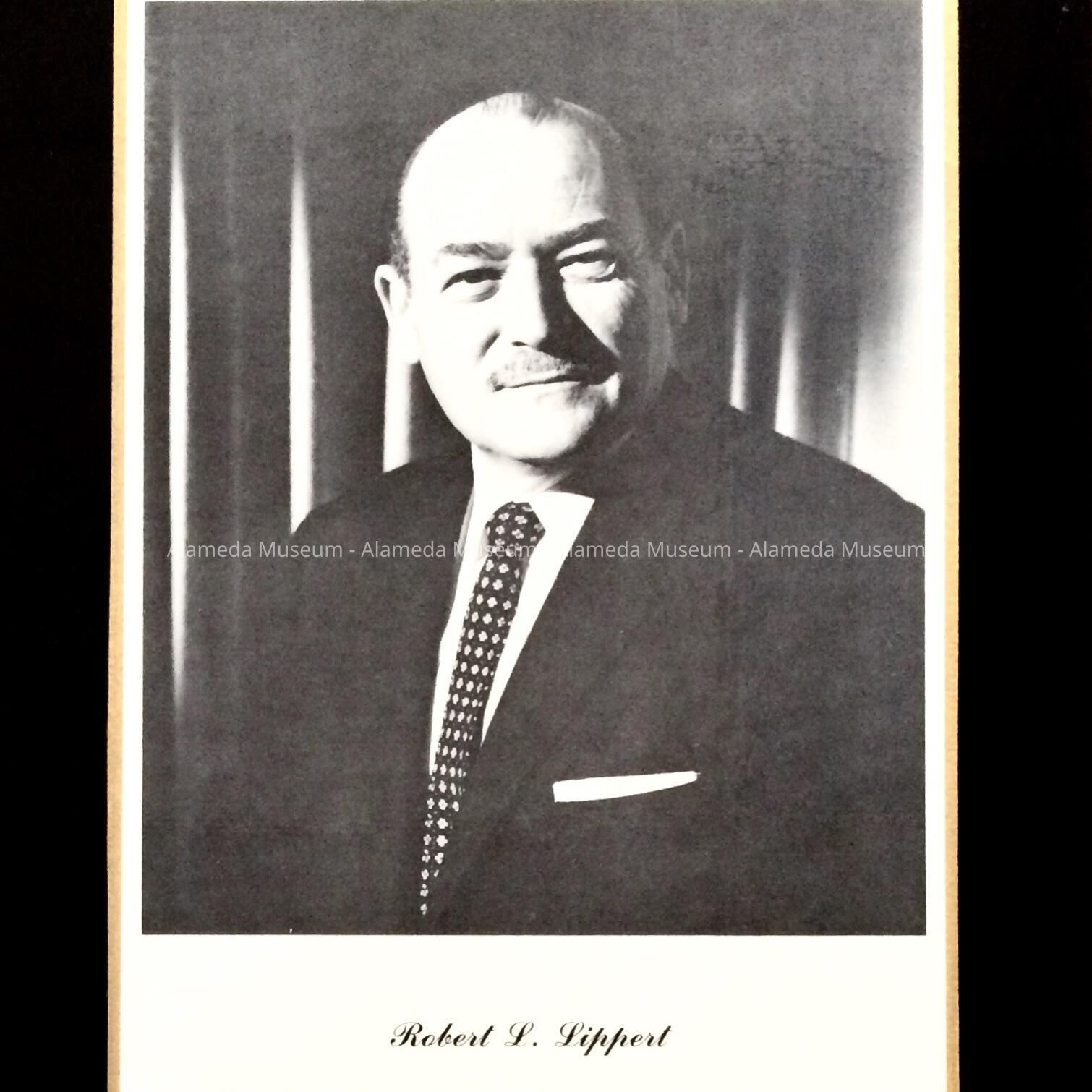 Description: Plasticized plaque on wood, with stamp on back of “thermal Plaque”, of publicity photo of Robert L. Lippert, with black border and gold trim.