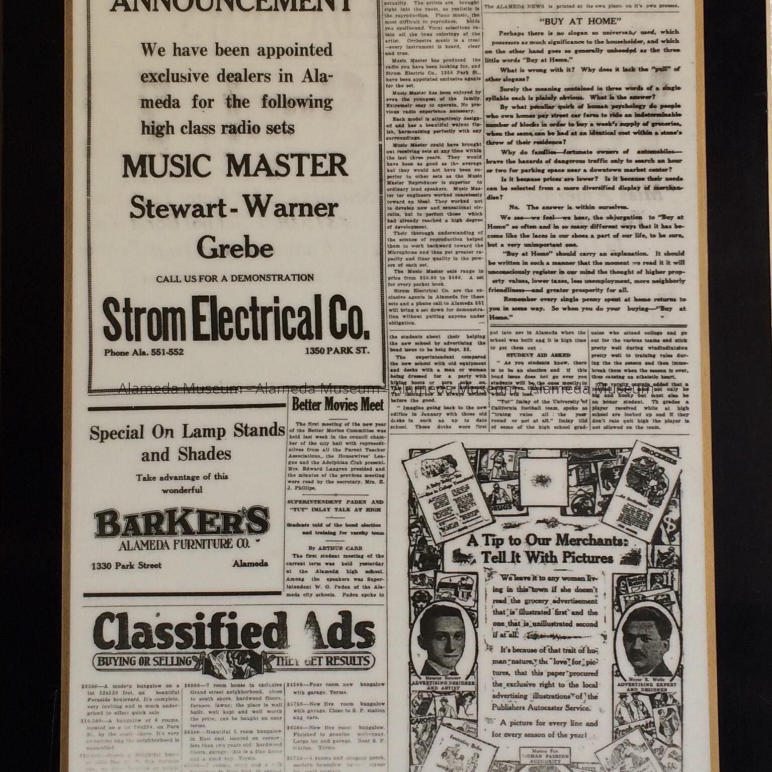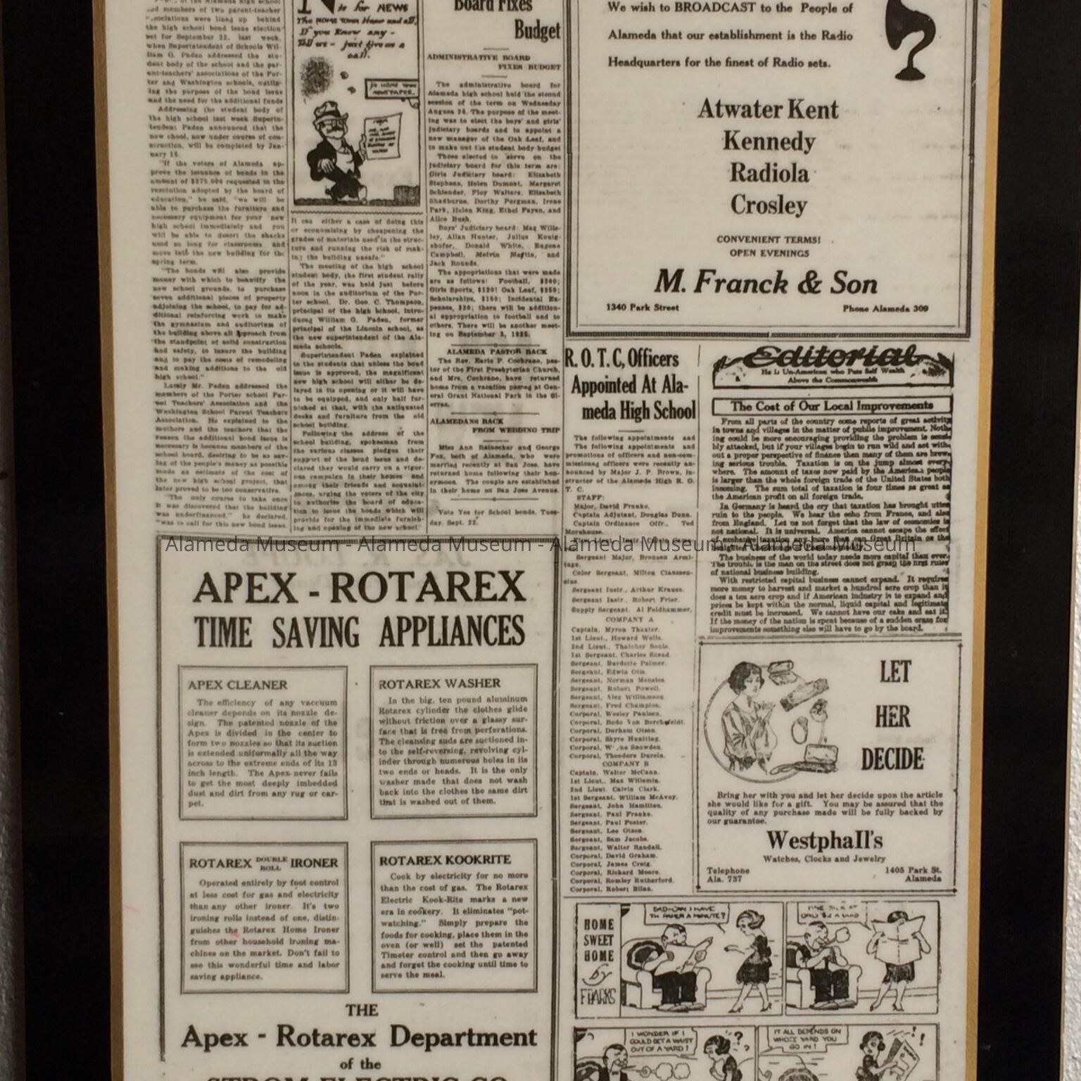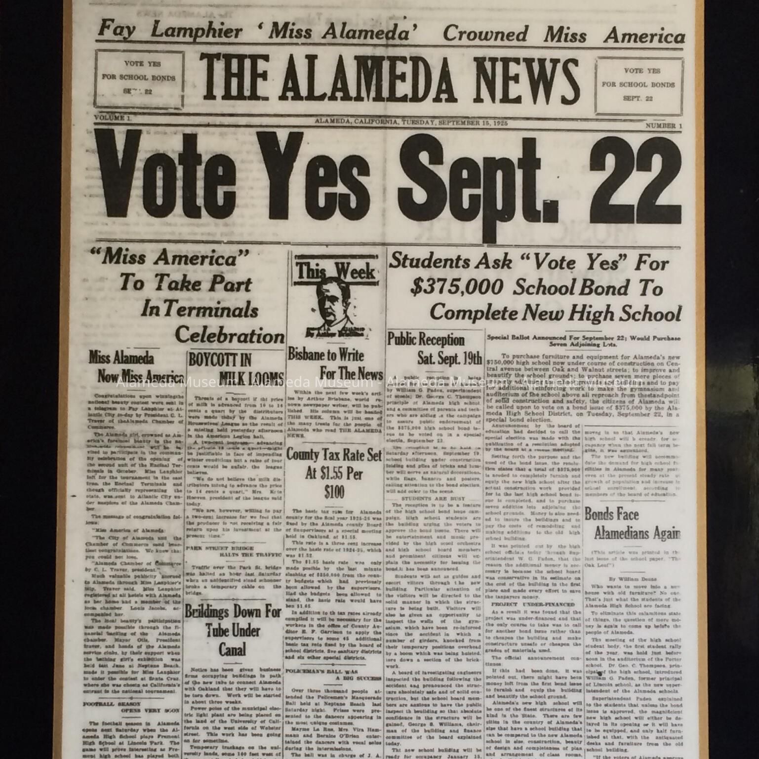 Description: Plasticized Plaques, with black paint border and gold trim, framing the pages of 'The Alameda News', Tuesday, Sept 15, 1925.