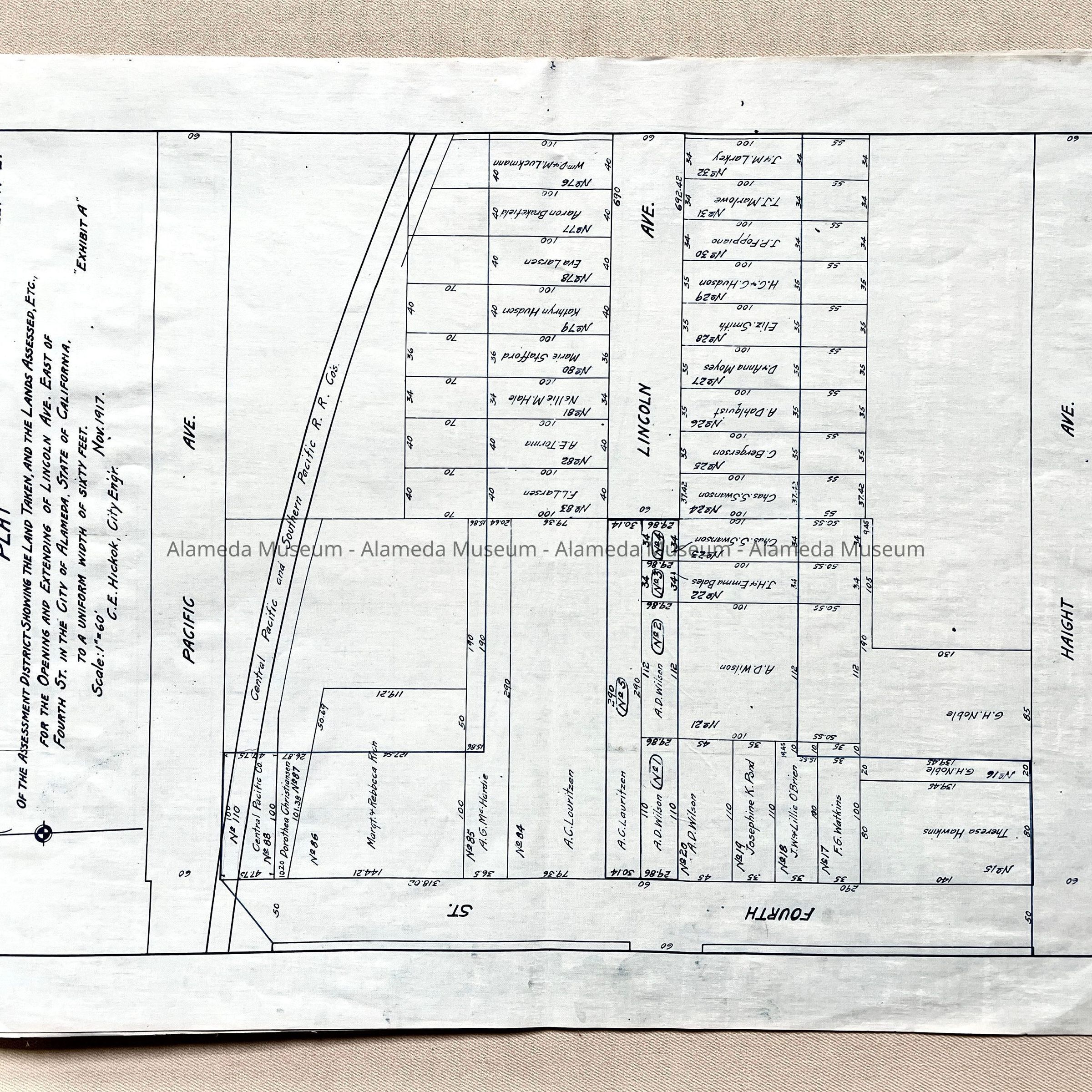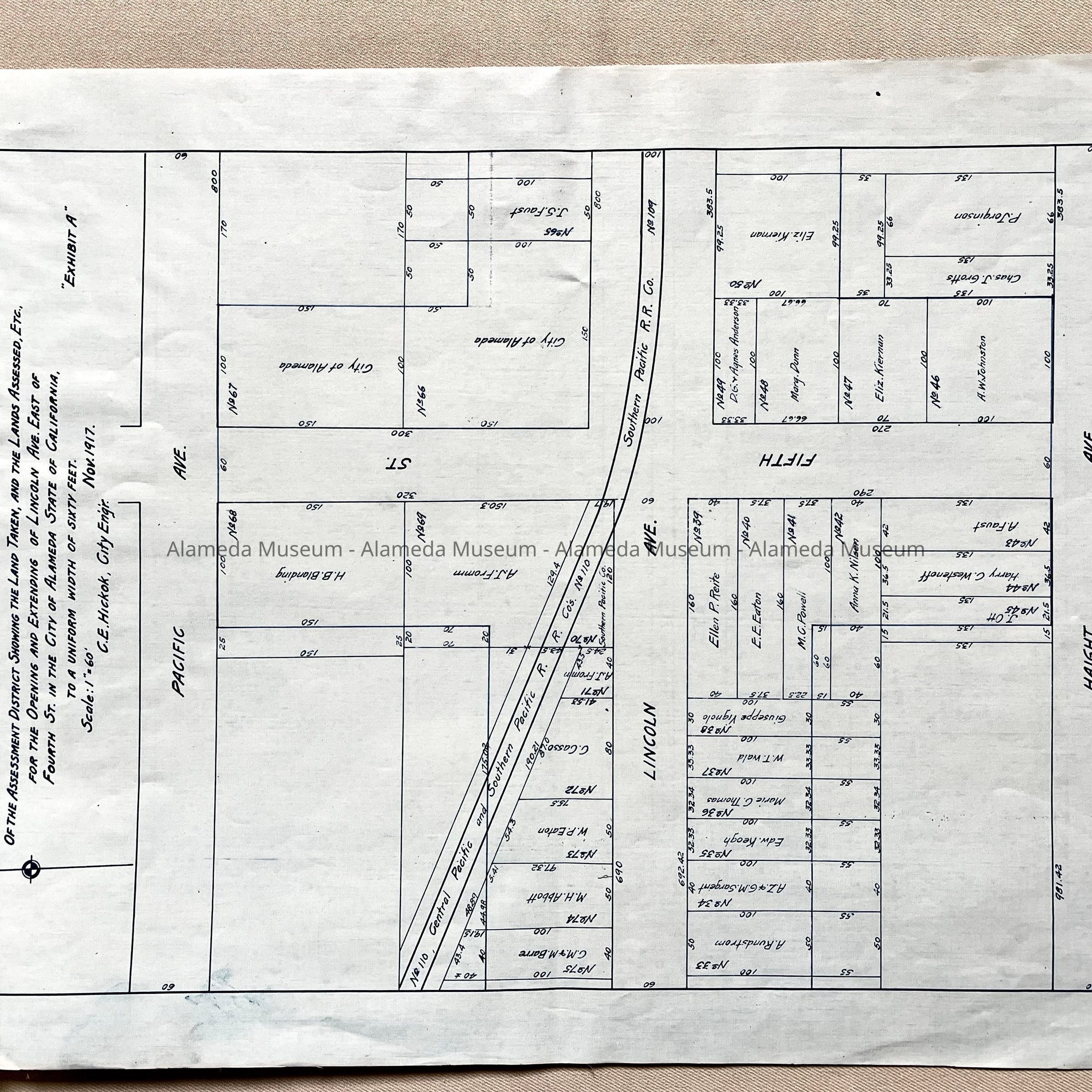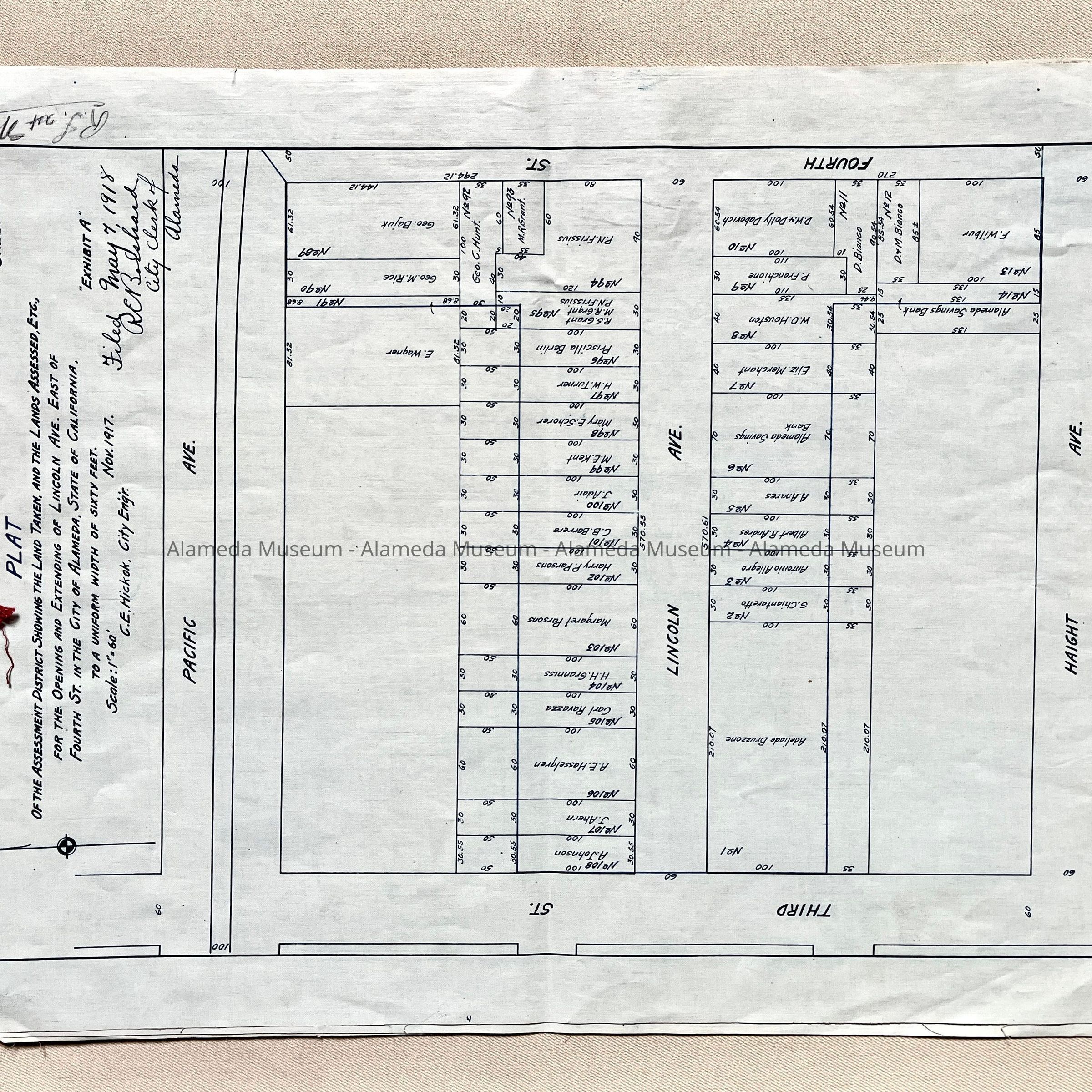 History: Plat maps depicting land taken and lands assessed, etc. for the opening and extending of Lincoln Avenue east of Fourth Street. Filed May 7, 1918. The plat map gives individual owners names and lot size, etc. in the assessed area.
