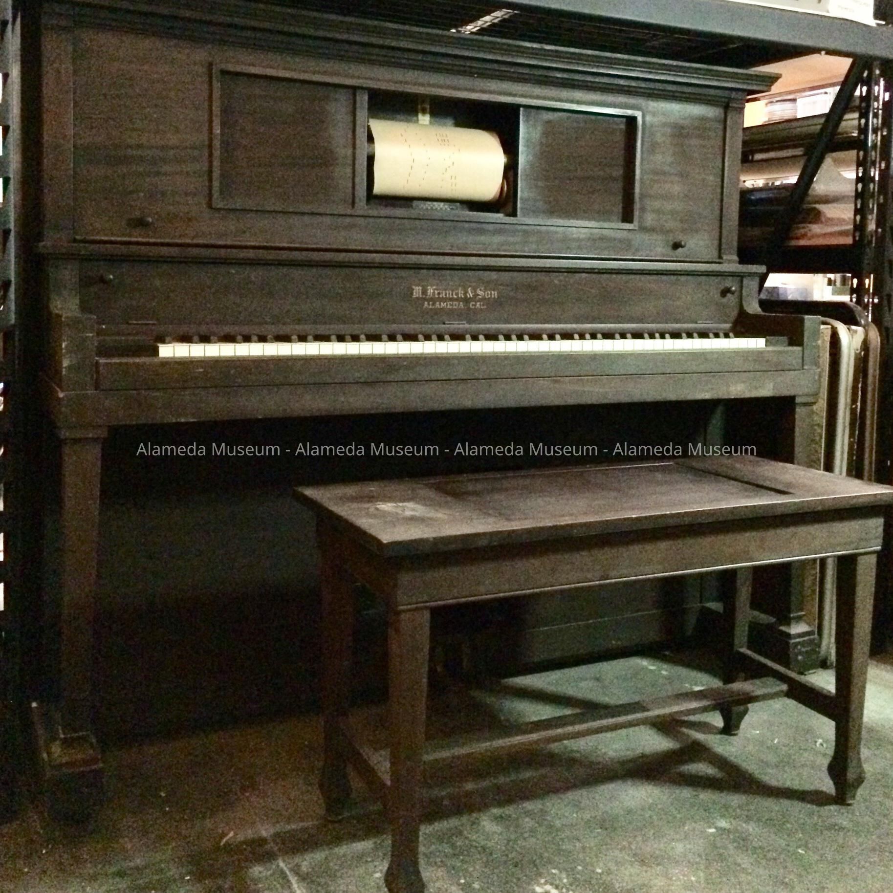 The Dark mahogany case has upper section with sliding doors which expose mechanism and roller. Keyboard covered by hinged panel. Inter panel with gold transfer caption stating "M. Franck and Son, Alameda, Cal". Code 90241 - no manufacture stated, however, interior of Piano has a duplicate caption embossed in iron "M. Franck and Son"