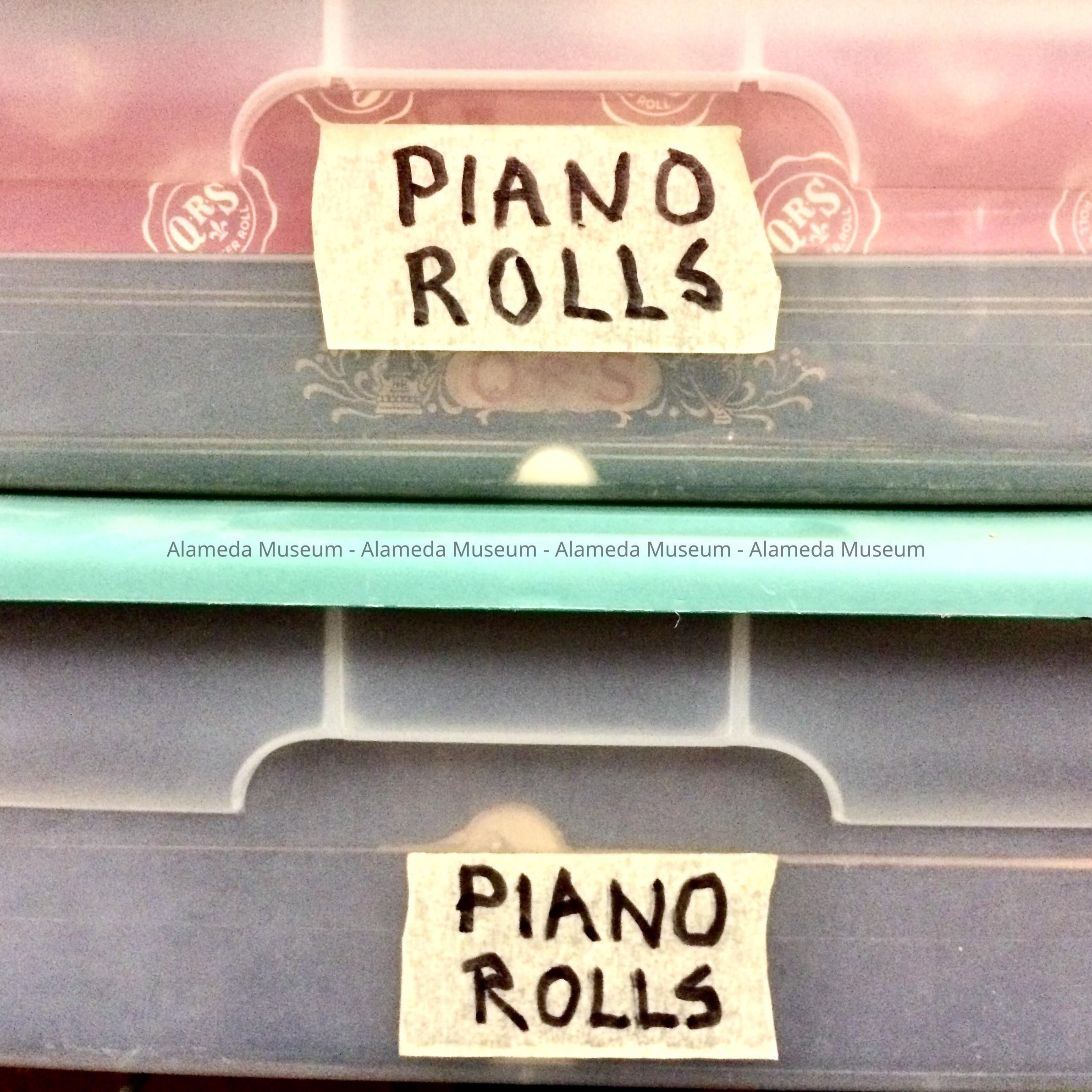 Box containing piano rolls. Perforated rolls are in original boxes with paper label stating Manufacture and song title.