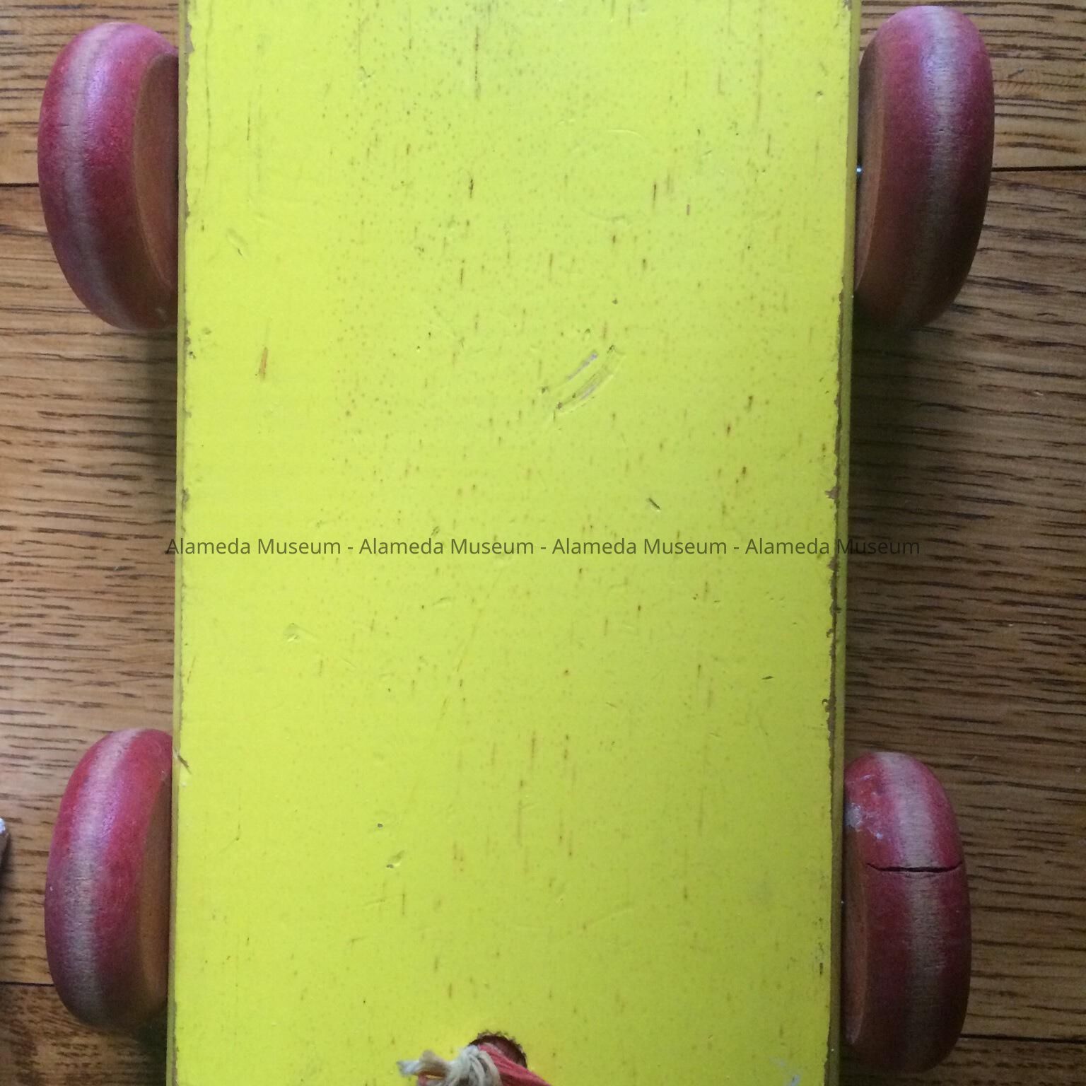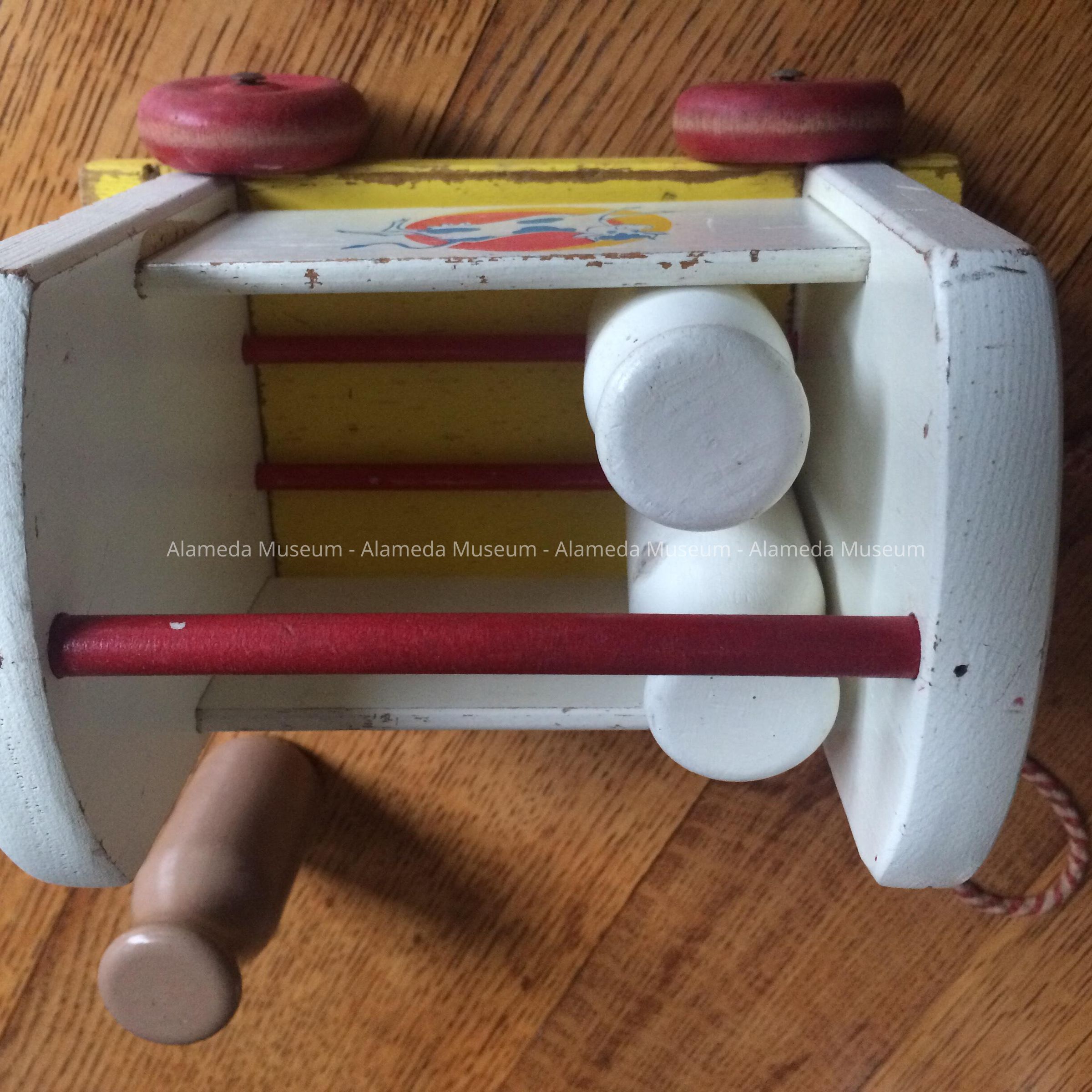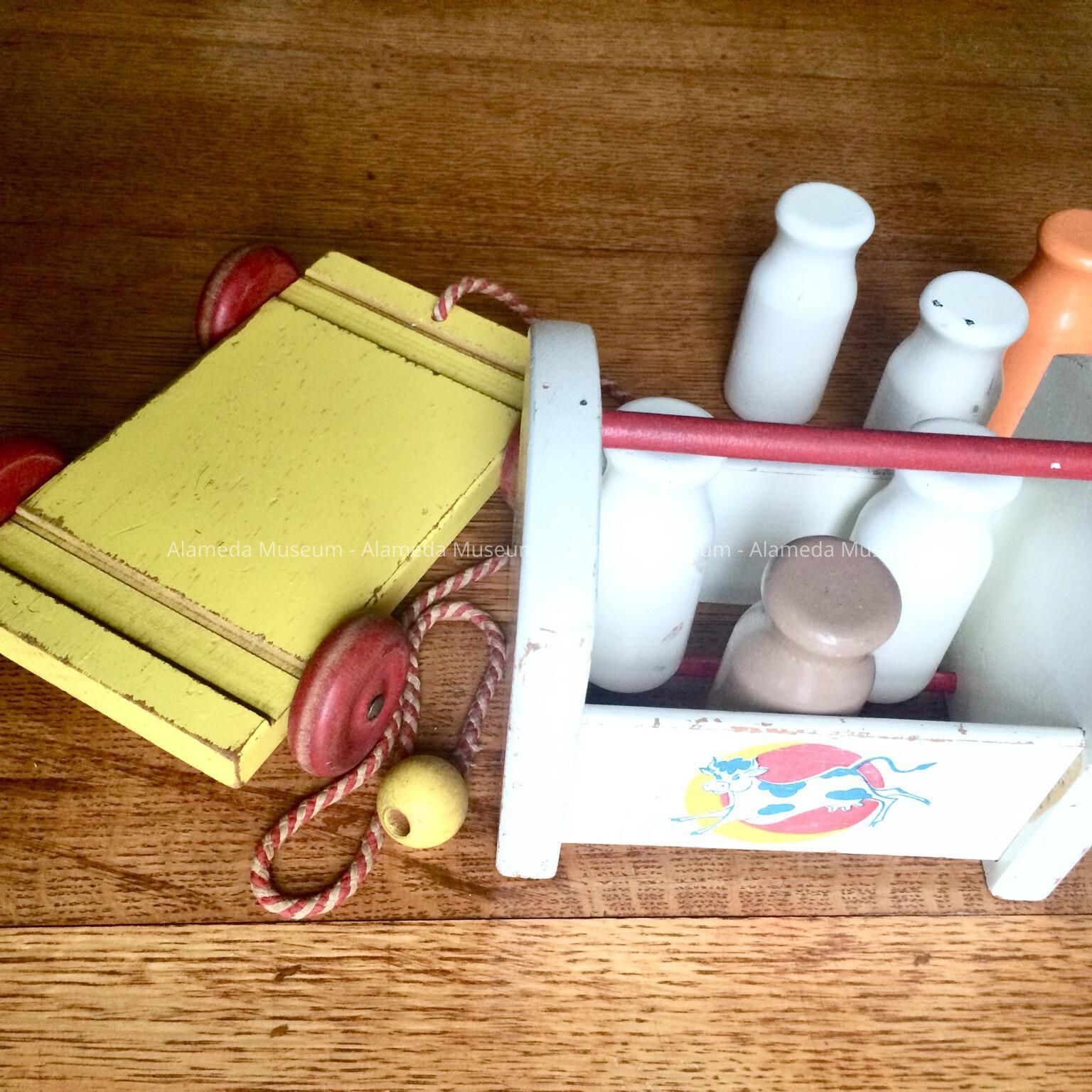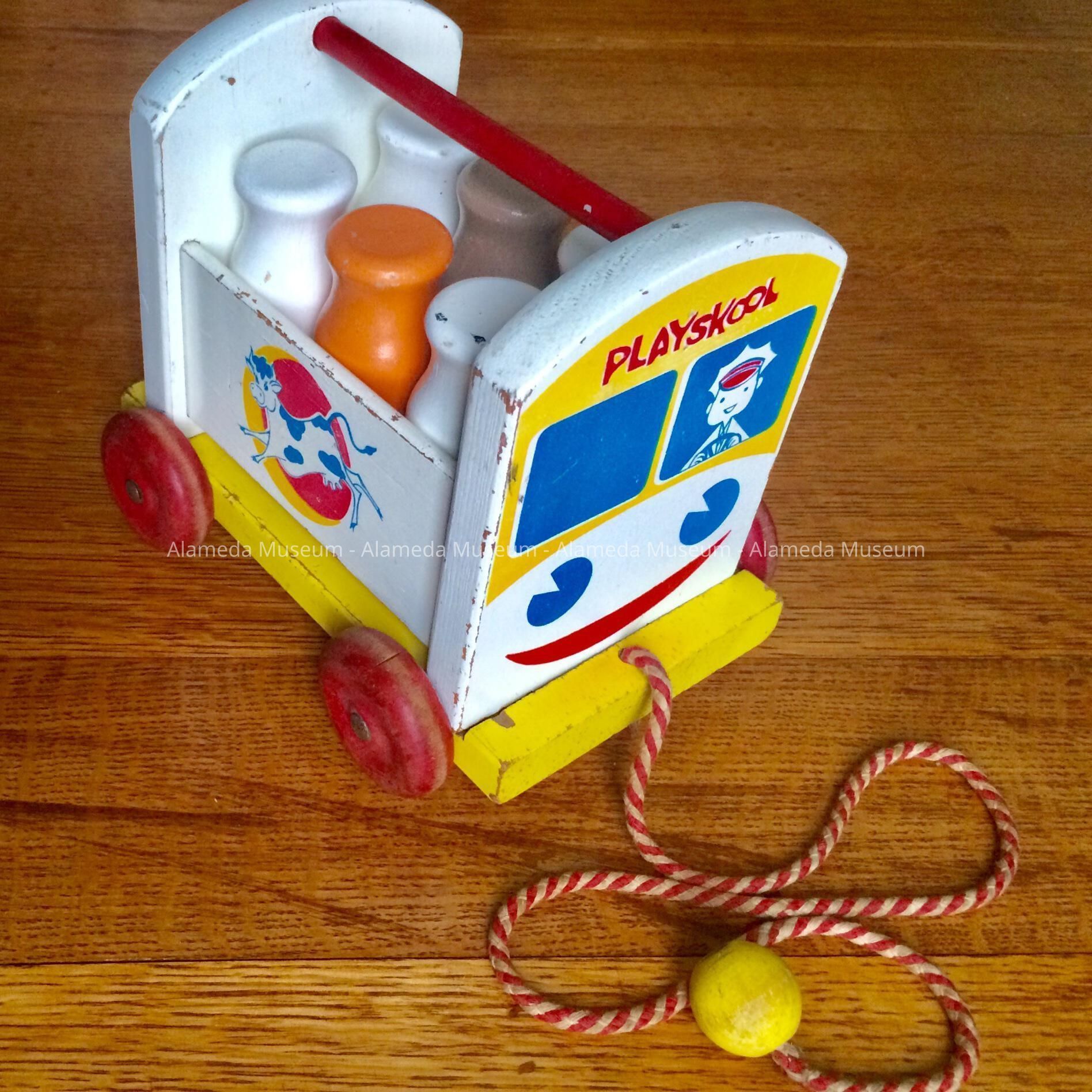 History of Object: a 1950s playskool pull toy doing double duty as a milk bottle carrier and milk delivery van. Donated in honor of this family: Elsie Follrath including her son Ben Follrath, grandson Bob Follrath, and great granddaughter Beverly Johnson (a former Mayor of Alameda).