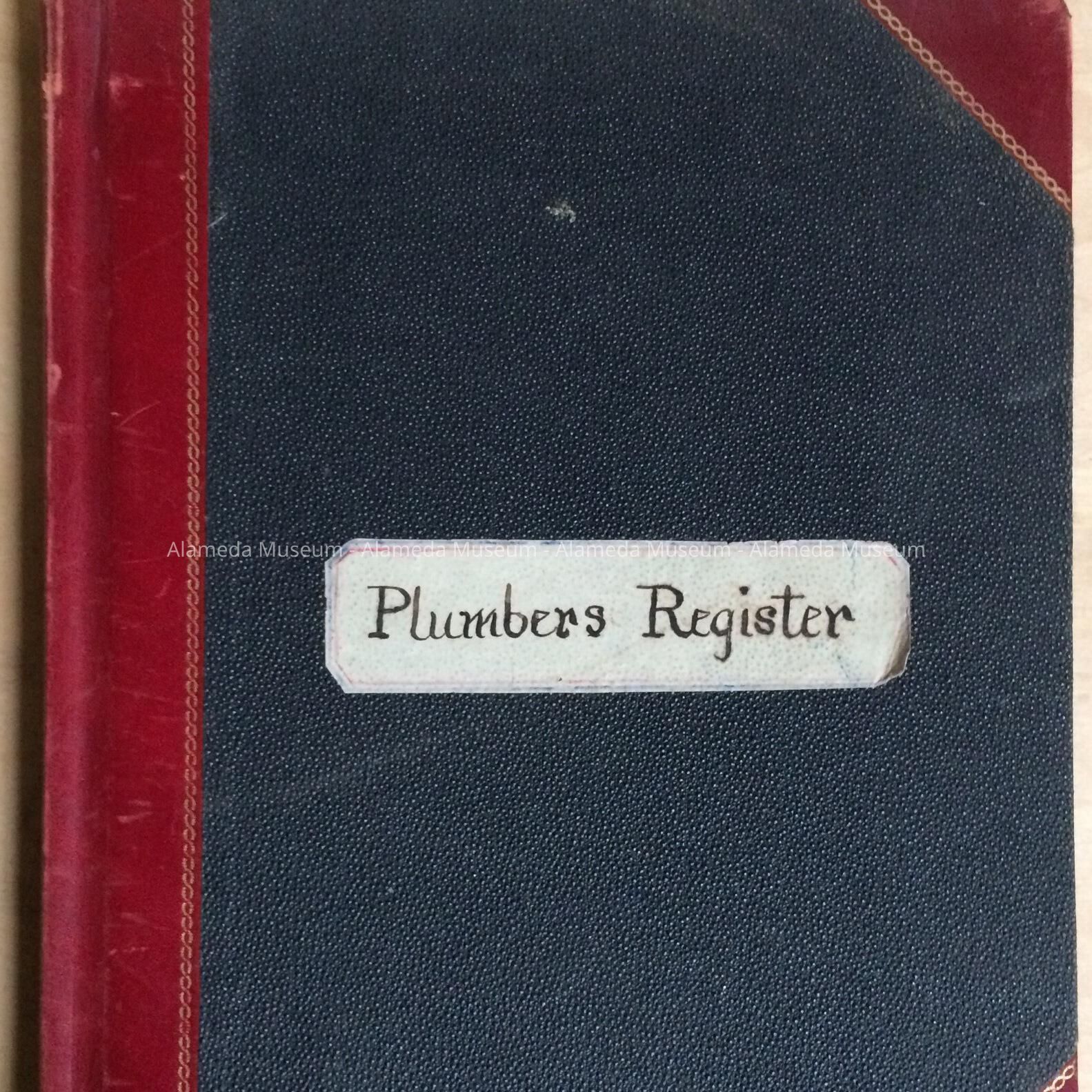 DESCRIPTION: BLACK HARD COVER, TRIM OF RED LEATHER, ACCENTUATED WITH GOLD. PAPER LABEL PRINTED ON COVER “PLUMBERS REGISTER”. 152 PAGES.