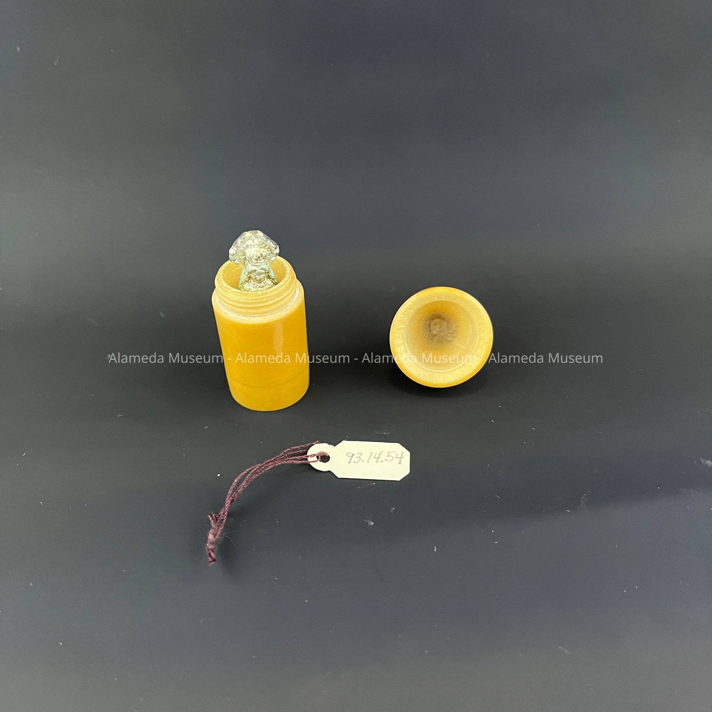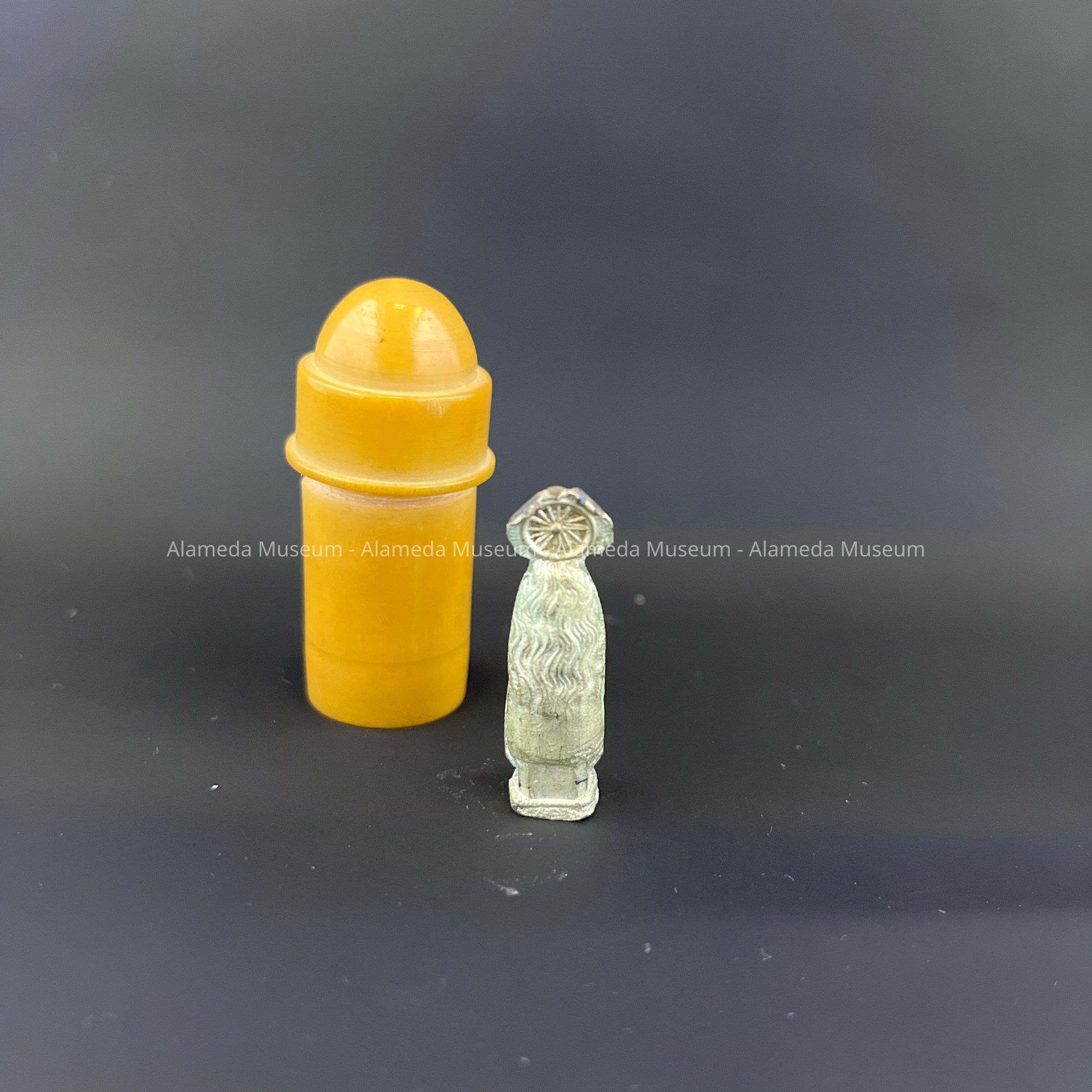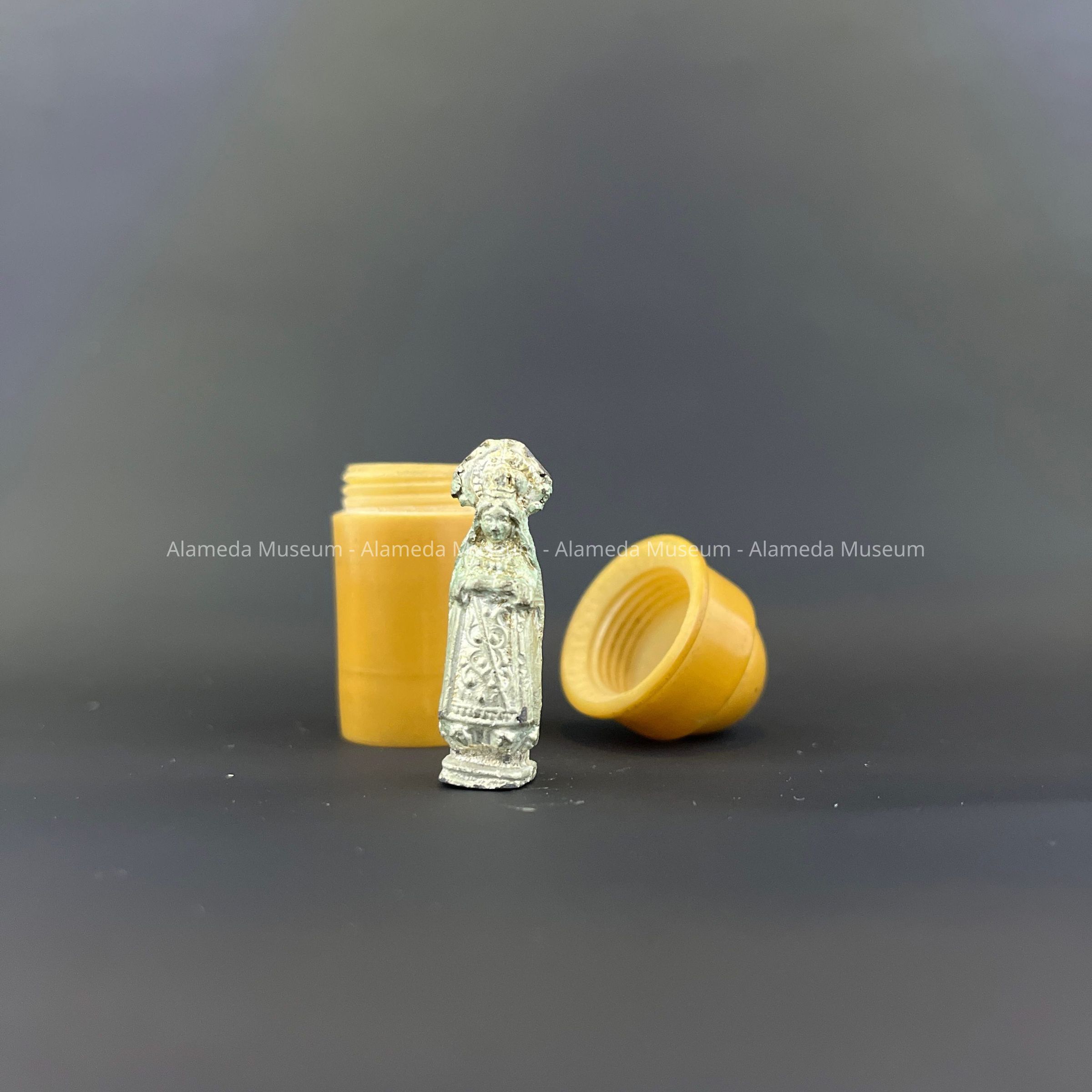 Description: A pocket devotional consisting of lead miniature Madonna figurine housed in a screw top celluloid container.