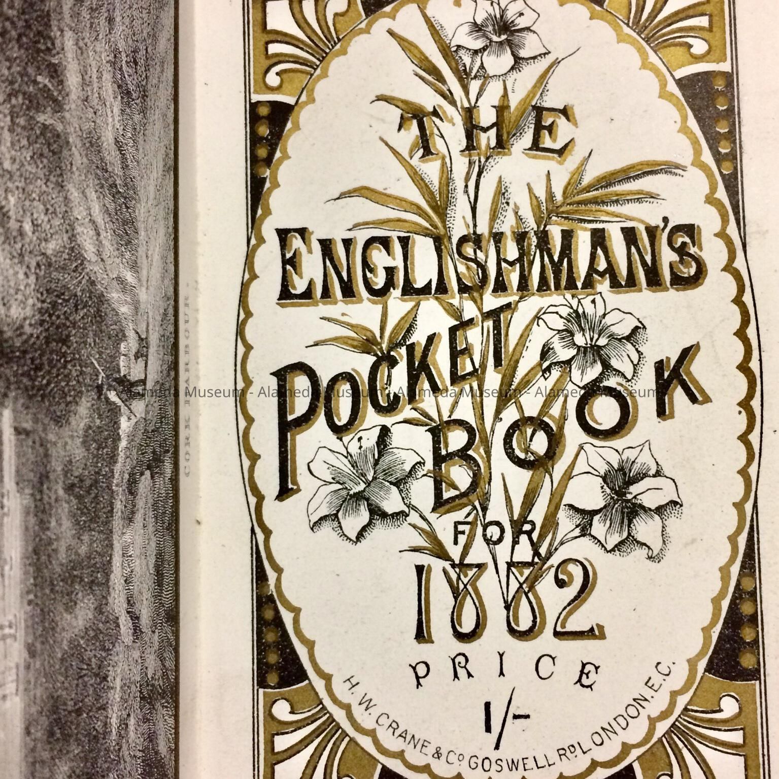 Description: Black-colored leather-covered pocket almanac, entitled "The Englishman's Pocketbook of 1882." The almanac also contains diary pages for January through December for inscribing. The book was published in England.