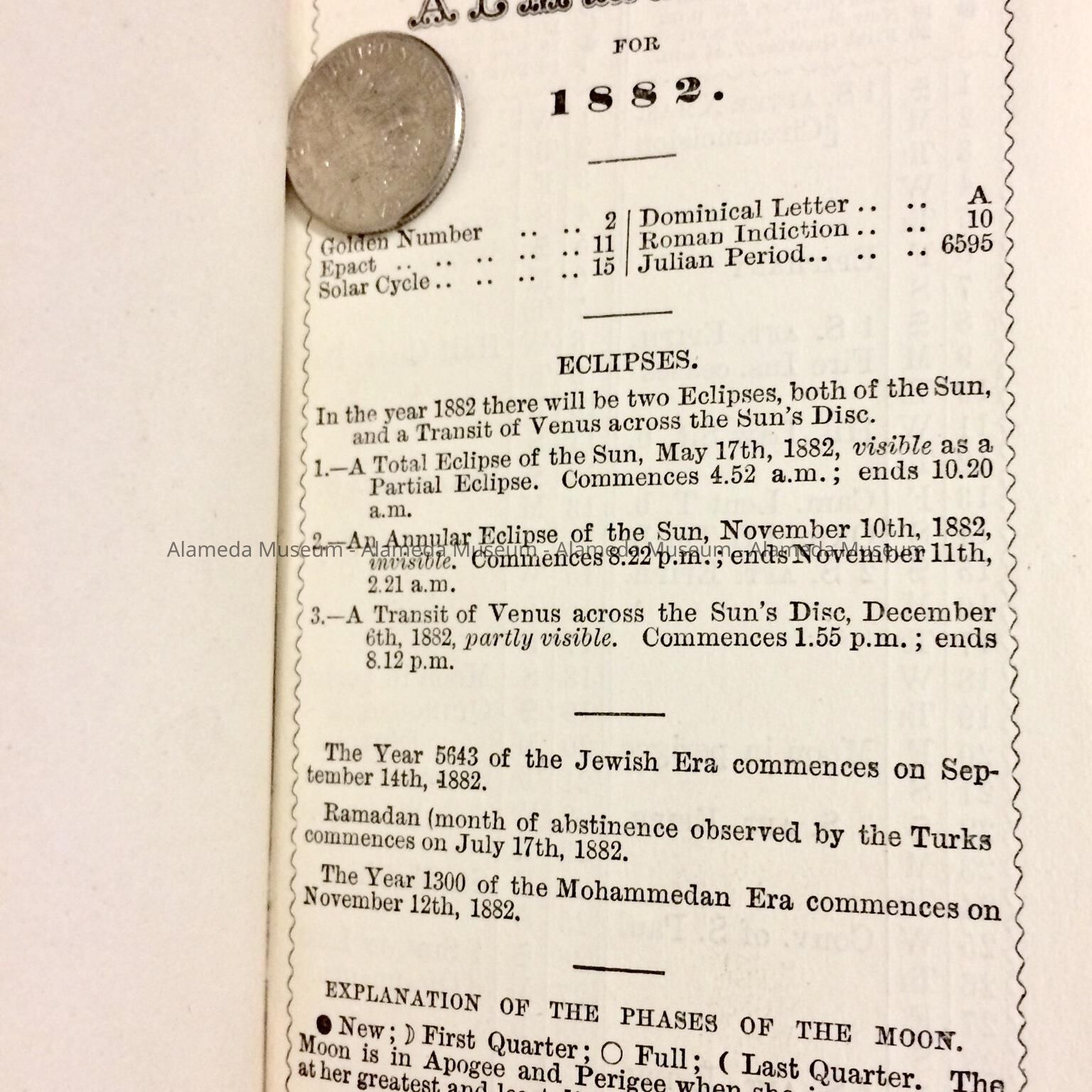 History of Object: Pocket diary and almanac for 1882. Owned by Cornelius Marsh Lee, Builder and early resident of Alameda.
