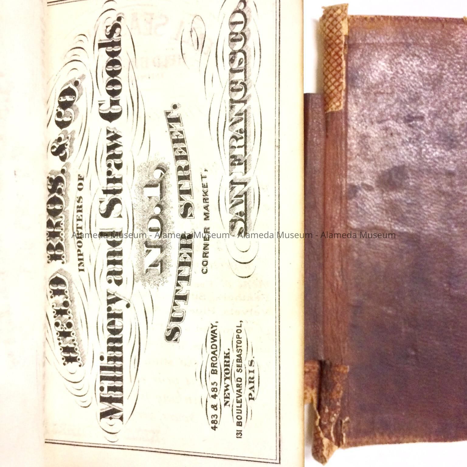 HISTORY OF OBJECT: A POCKET-SIZE NOTEBOOK ORIGINALLY BELONGING TO EMMA PALMER, HER DAUGHTER, AND GRANDSON. THE FAMILY MOVED TO ALAMEDA FOLLOWING THE 1906 EARTHQUAKE AND LIVED IN ALAMEDA FOR MANY YEARS. THE NOTEBOOK ALSO INCLUDES A RAILROAD SCHEDULE FOR THE CENTRAL PACIFIC RAILROAD, DATED 1871. ALSO INCLUDED ARE TIMES AND ROUTES OF THE FERRY BOAT AS WELL AS THE ALAMEDA BRANCH SCHEDULE FOR THE CITY OF ALAMEDA.