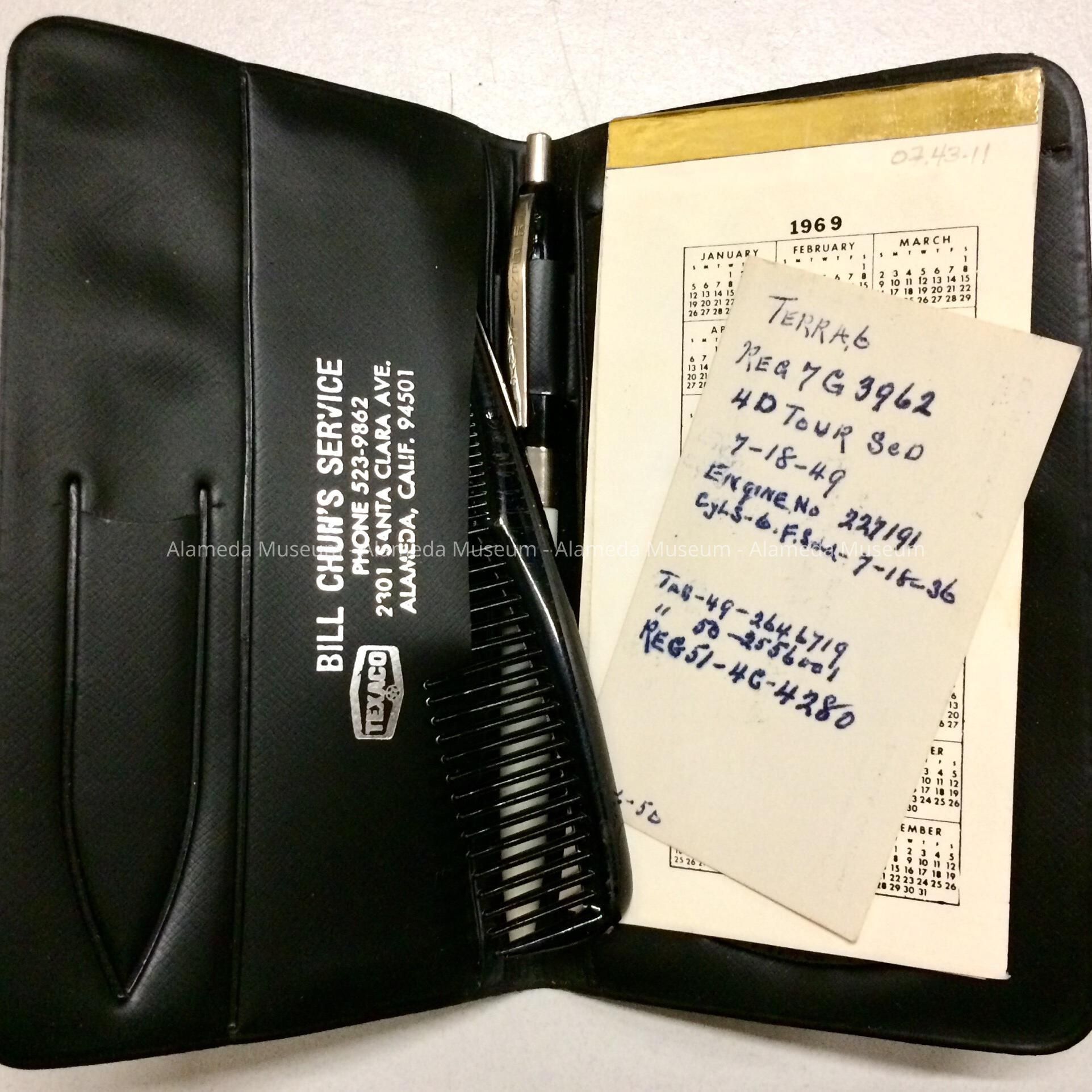 HISTORY OF OBJECT: A POCKET NOTEBOOK PRESENTED AS A PREMIUM BY BILL CHUN'S SERVICE, A TEXACO DEALER, LOCATED AT 2301 SANTA CLARA AVENUE, ALAMEDA.