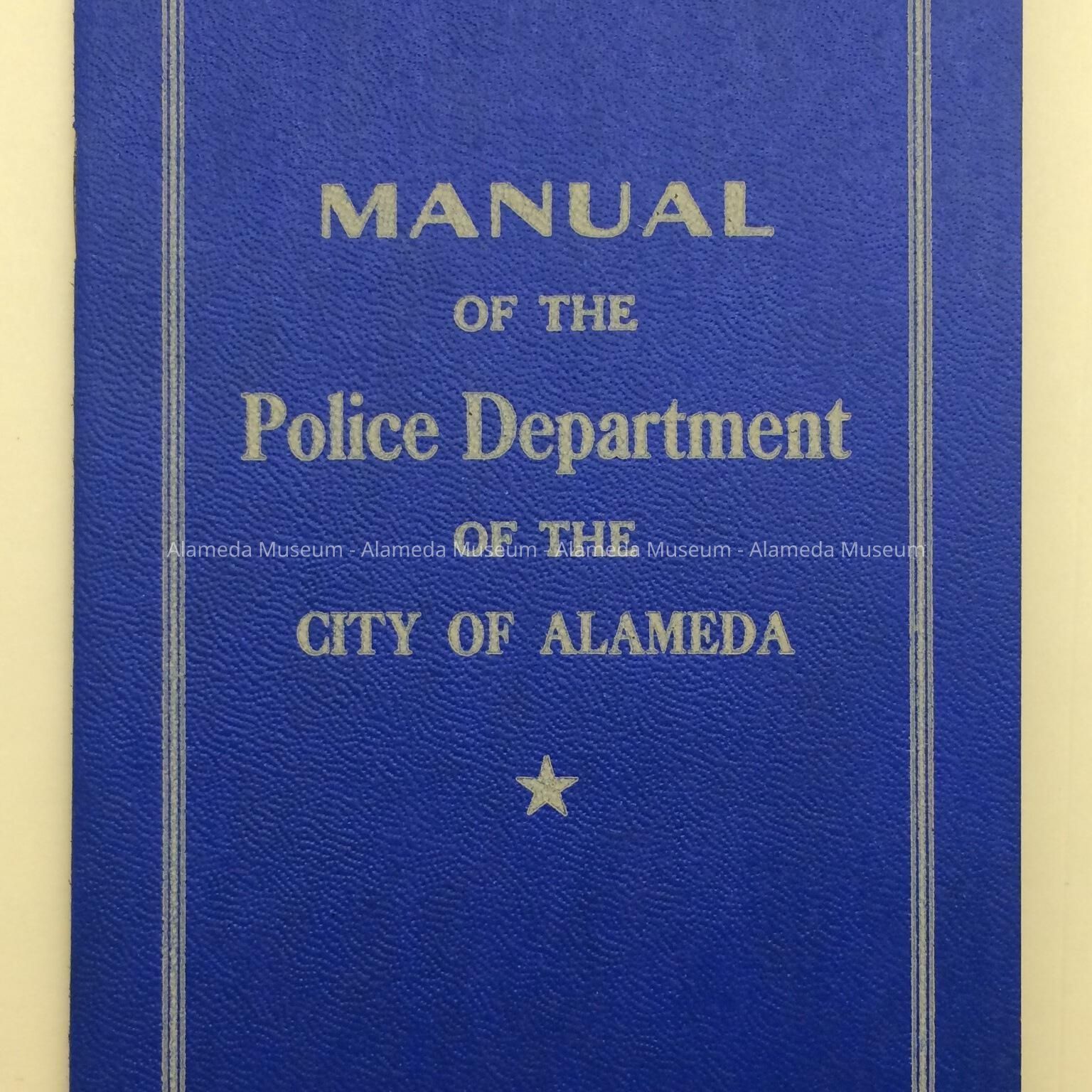 Description: Thin soft bound booklet with sky-blue leather-look paper card stock cover, titled: “Manual of the Police Department of the City of Alameda”.