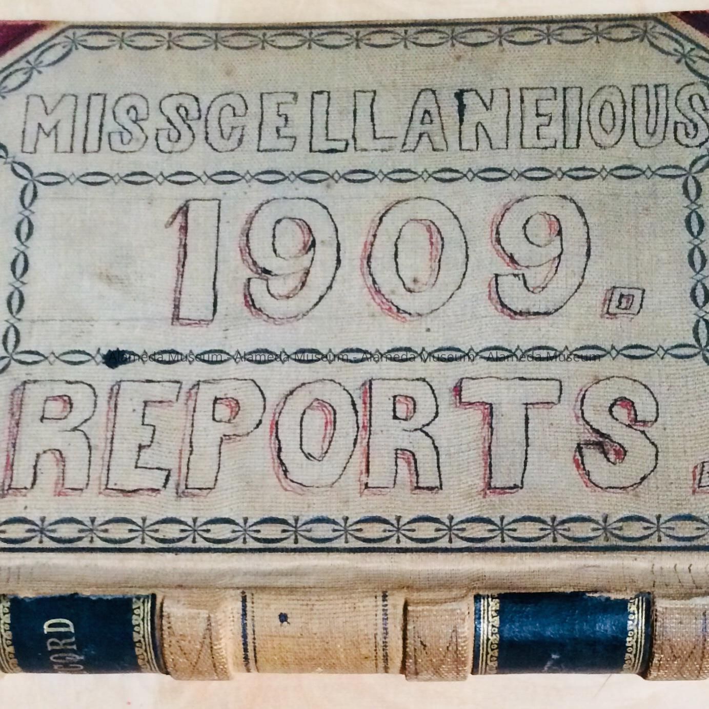 Description: Hard cover record or ledger book, off-white cover with leather trim. On cover in red and black ink it states "Misscellaneius (mispelled) Reports, 1909. On the spine in gold "Record".