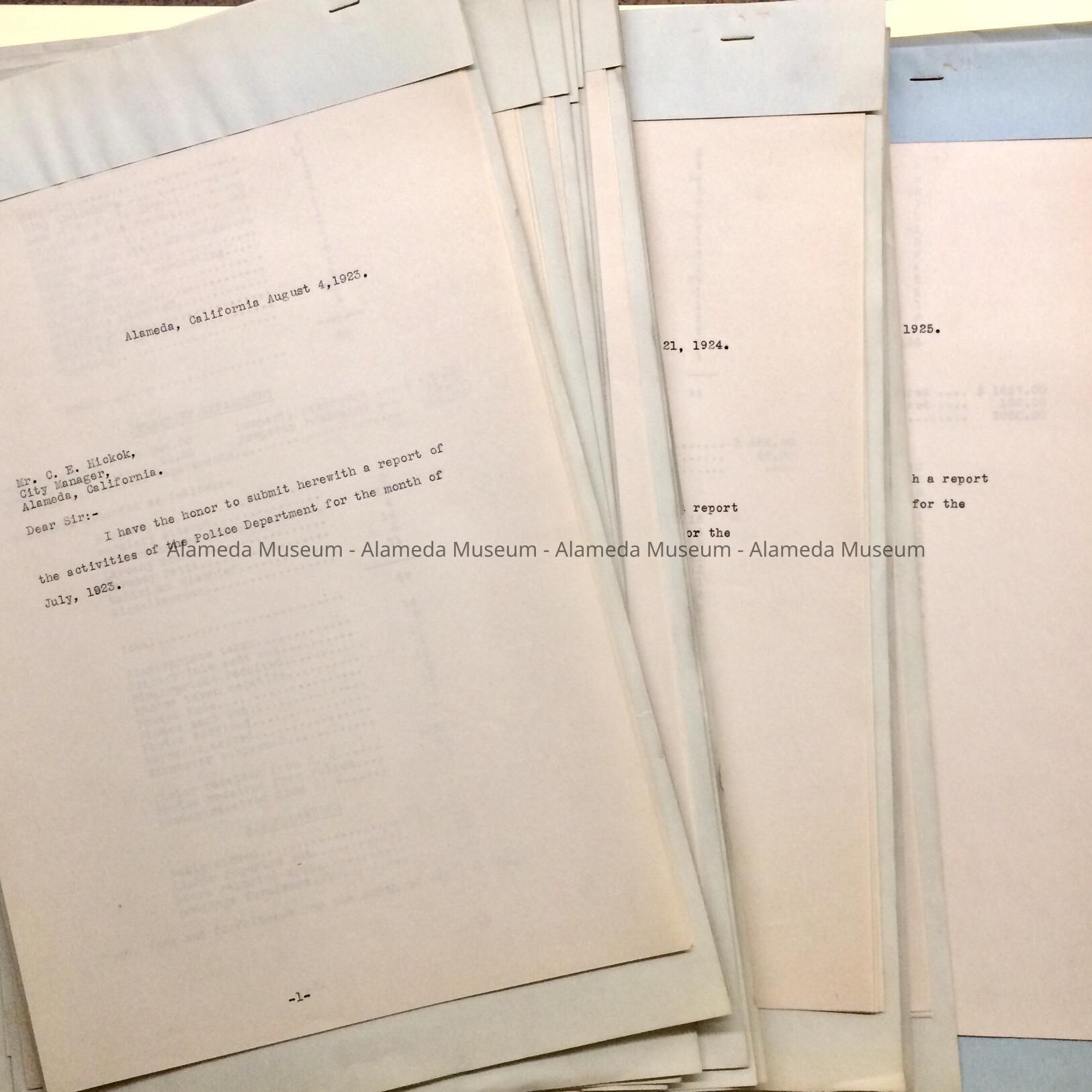 History of Object: 24 Monthly Police Department Reports from August 1923 to July 1925. Reports include statistics of reasons for arrests, no. of animals