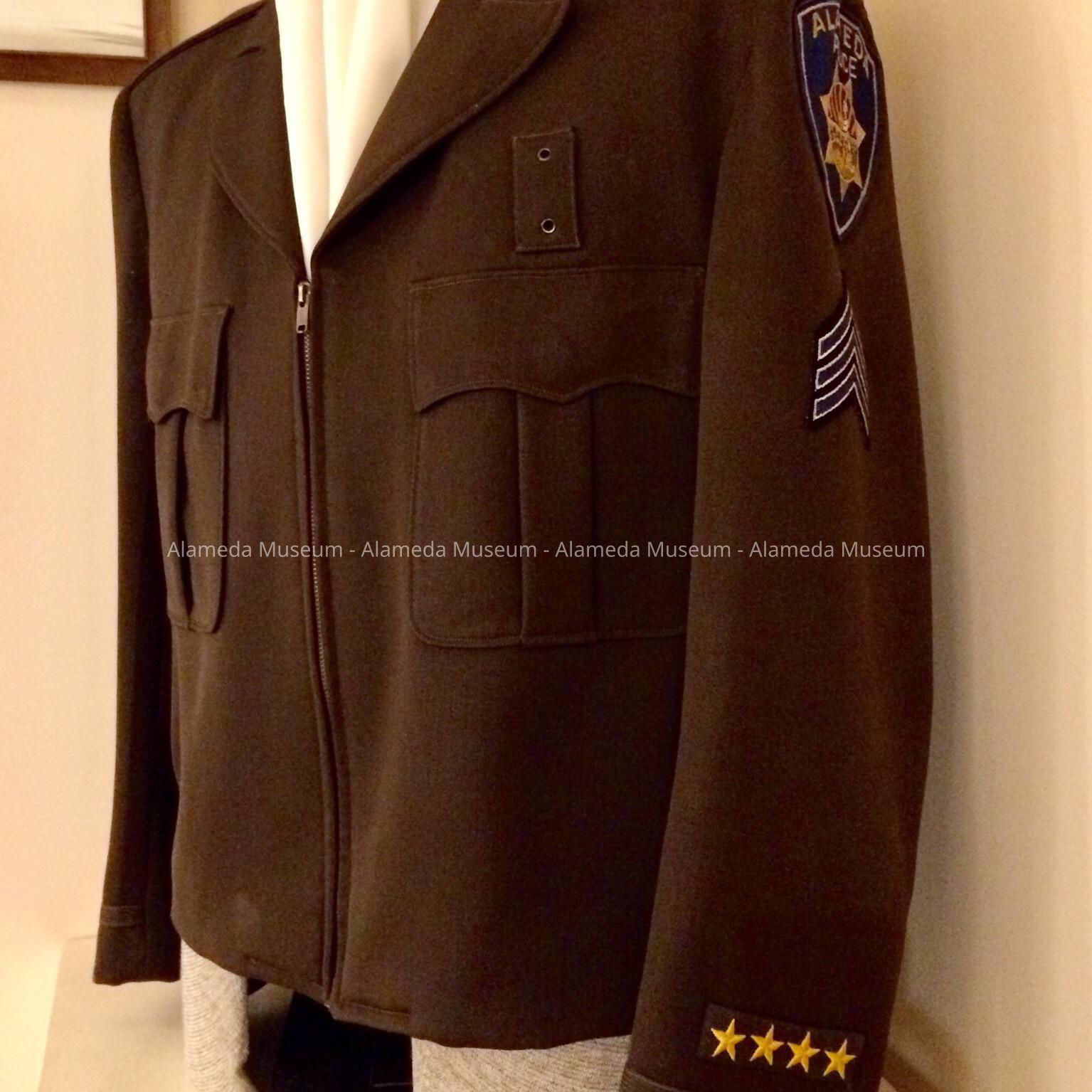 BROWN-COLORED, SERGE JACKET, WITH EMBLEM ON THE UPPER LEFT ARM. EMBLEM IS SHIELD-SHAPED IN SILK EMBROIDERY IN BLUE-, GOLD-, AND ORANGE-COLORED THREADS. EMBLEM STATES, "ALAMEDA POLICE." ON THE RIGHT SLEEVE ARE THREE CHEVRONS IN BLUE AND GOLD SILK EMBROIDERY ON A BLACK-COLORED BACKGROUND. LABEL WHICH IS SEWN TO THE INNER POCKET STATES, "THE HUB, SCHNEIDER'S, OAKLAND." NO SIZE LABEL IS SEWN ON THE GARMENT. 4 GOLD STARS ON SLEEVE.