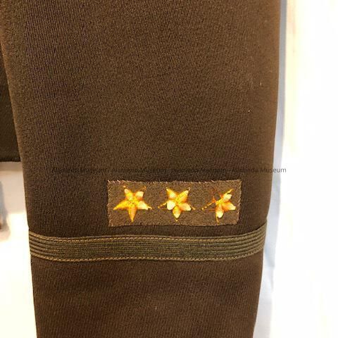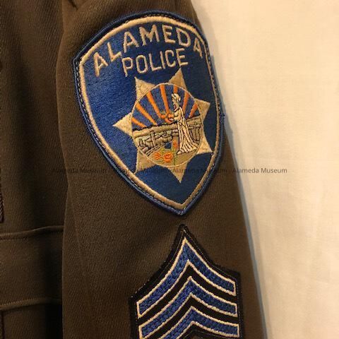 BROWN-COLORED SERGE UNIFORM POLICE JACKET, WITH EMBLEM ON UPPER LEFT ARM. EMBLEM IS SHIELD-SHAPED IN SILK EMBROIDERY IN BLUE, GOLD, AND ORANGE COLORS. EMBLEM STATES, "ALAMEDA POLICE " ON THE RIGHT SLEEVE ARE THREE BLUE- AND GOLD-COLORED SILK EMBROIDERED CHEVRONS ON A BLACK-COLORED BACKGROUND. THREE GOLD STARS ON ONE OF THE SLEEVES. (STARS MAY INDICATE LENGTH OF SERVICE YEARS.)