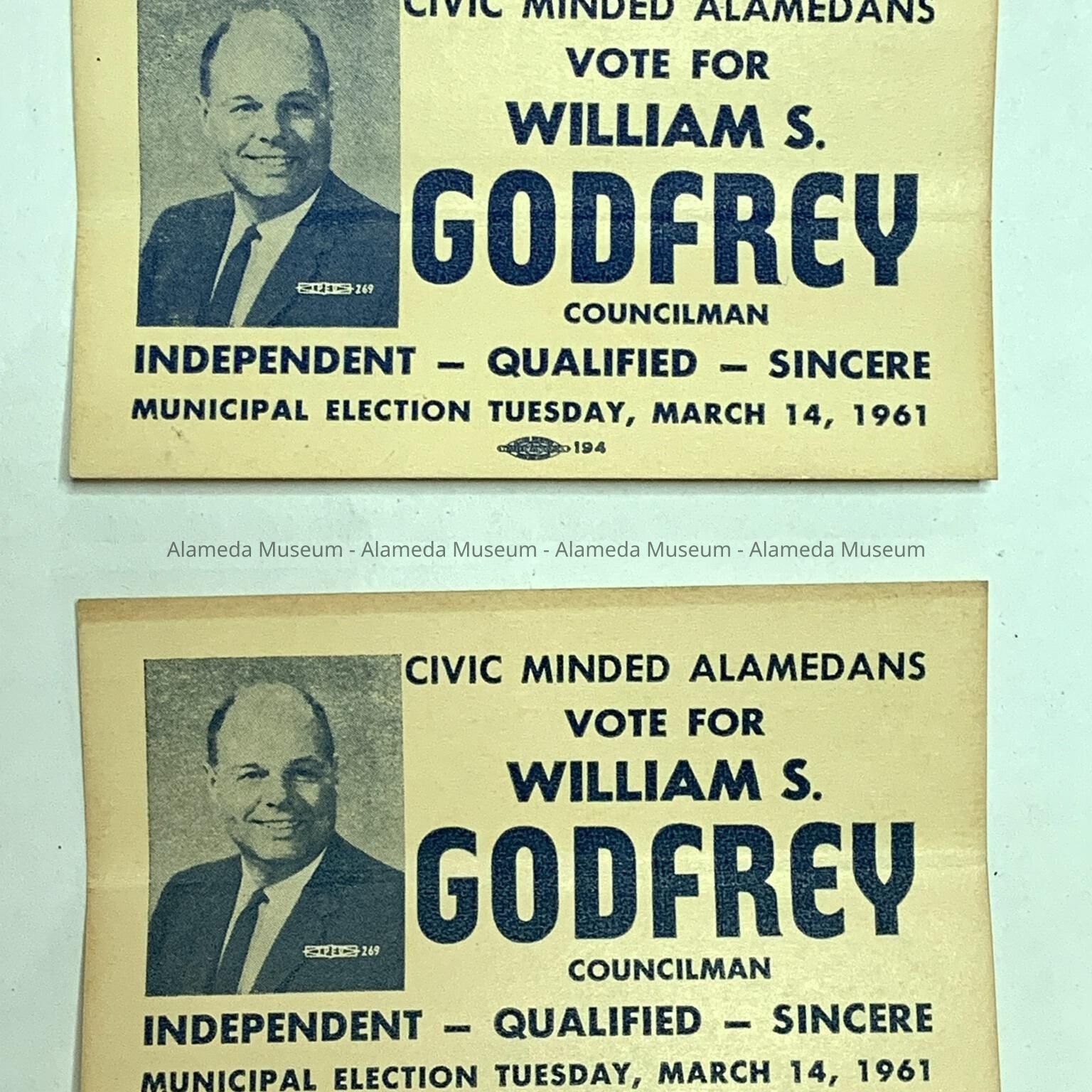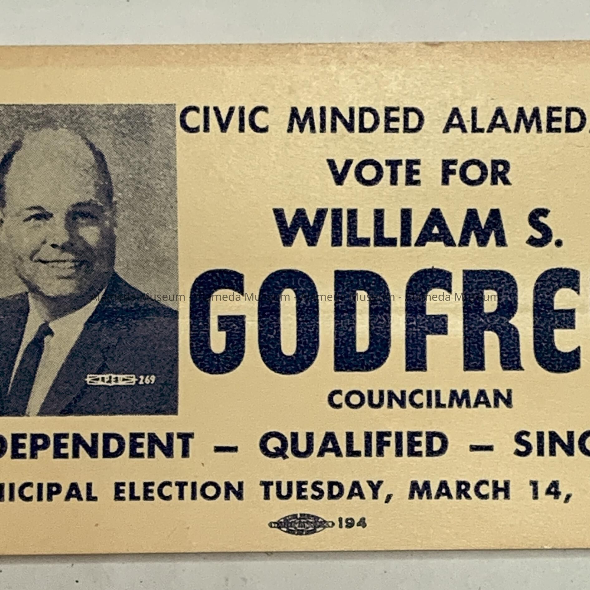 HISTORY OF OBJECTS: POLITICAL CALLING CARDS FOR WILLIAM S GODFREY, WHO RAN FOR CITY COUNCIL IN 1961.
