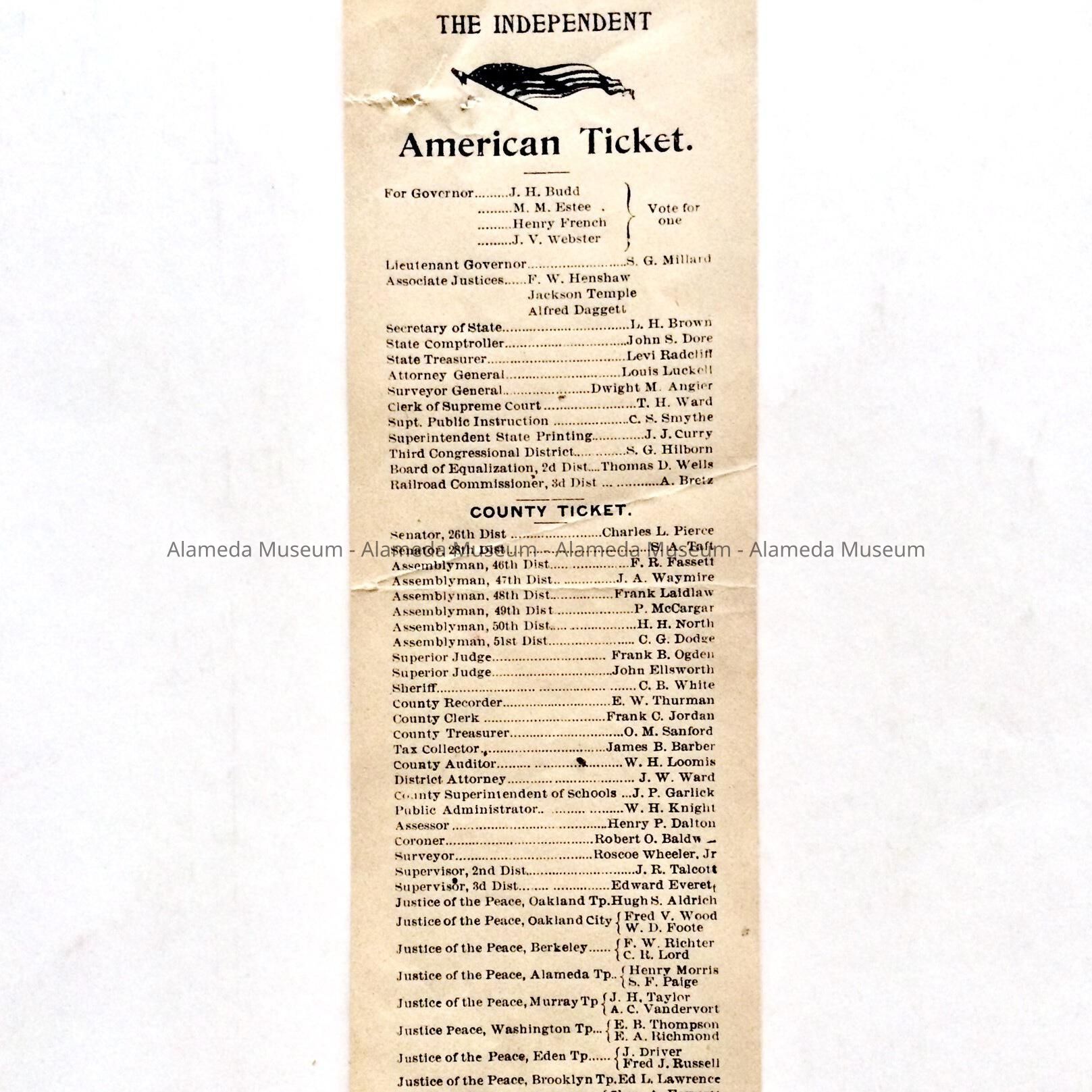 Political Candidates List for Independent - American ticket, c. 1890sEntry/Object ID