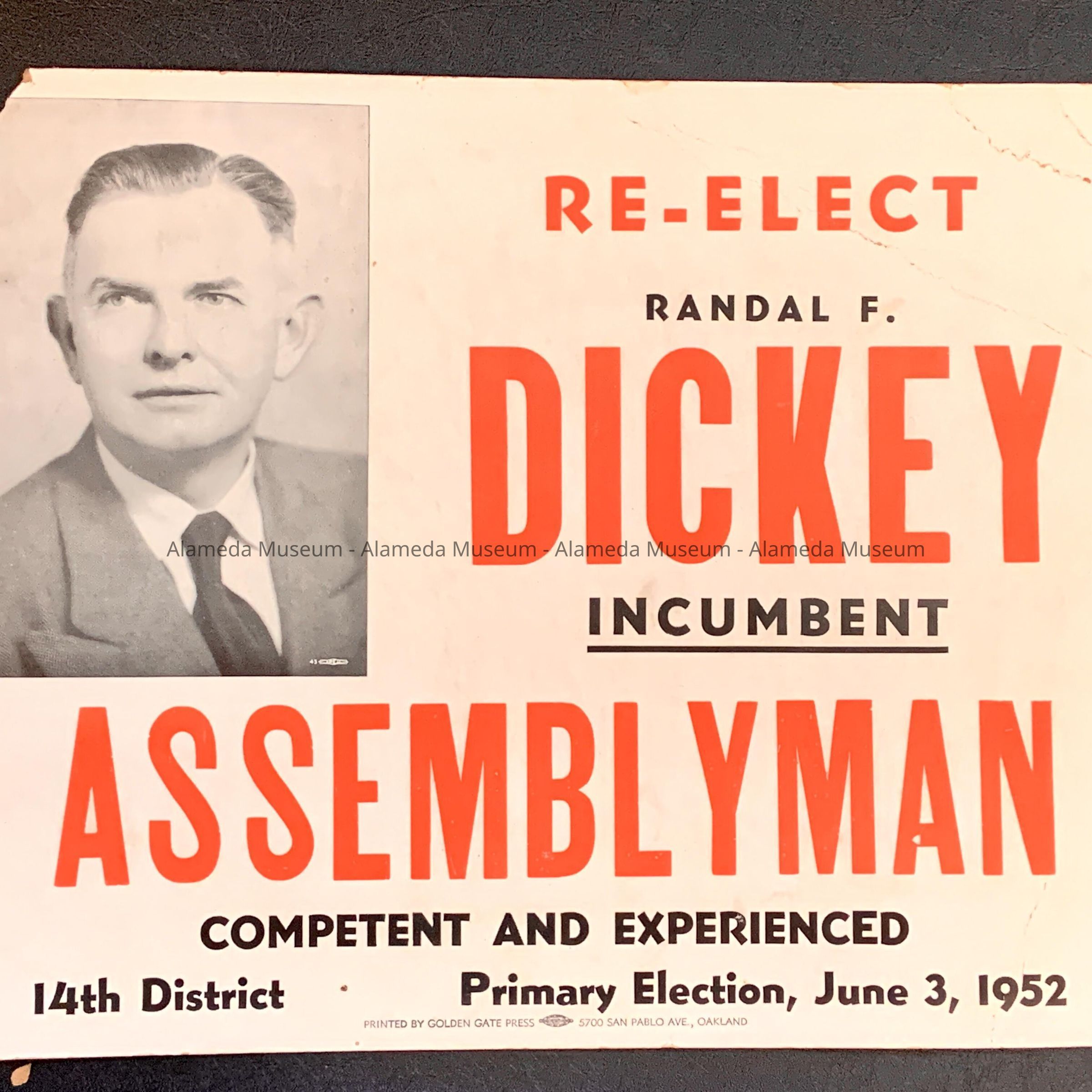 HISTORY OF OBJECT: A POLITICAL POSTER FOR THE REELECTION OF RANDALL DICKEY FOR ASSEMBLYMAN IN THE FOURTEENTH DISTRICT. ELECTION DATE OF JUNE 3, 1952. MR. DICKEY WAS AN ALAMEDA RESIDENT.