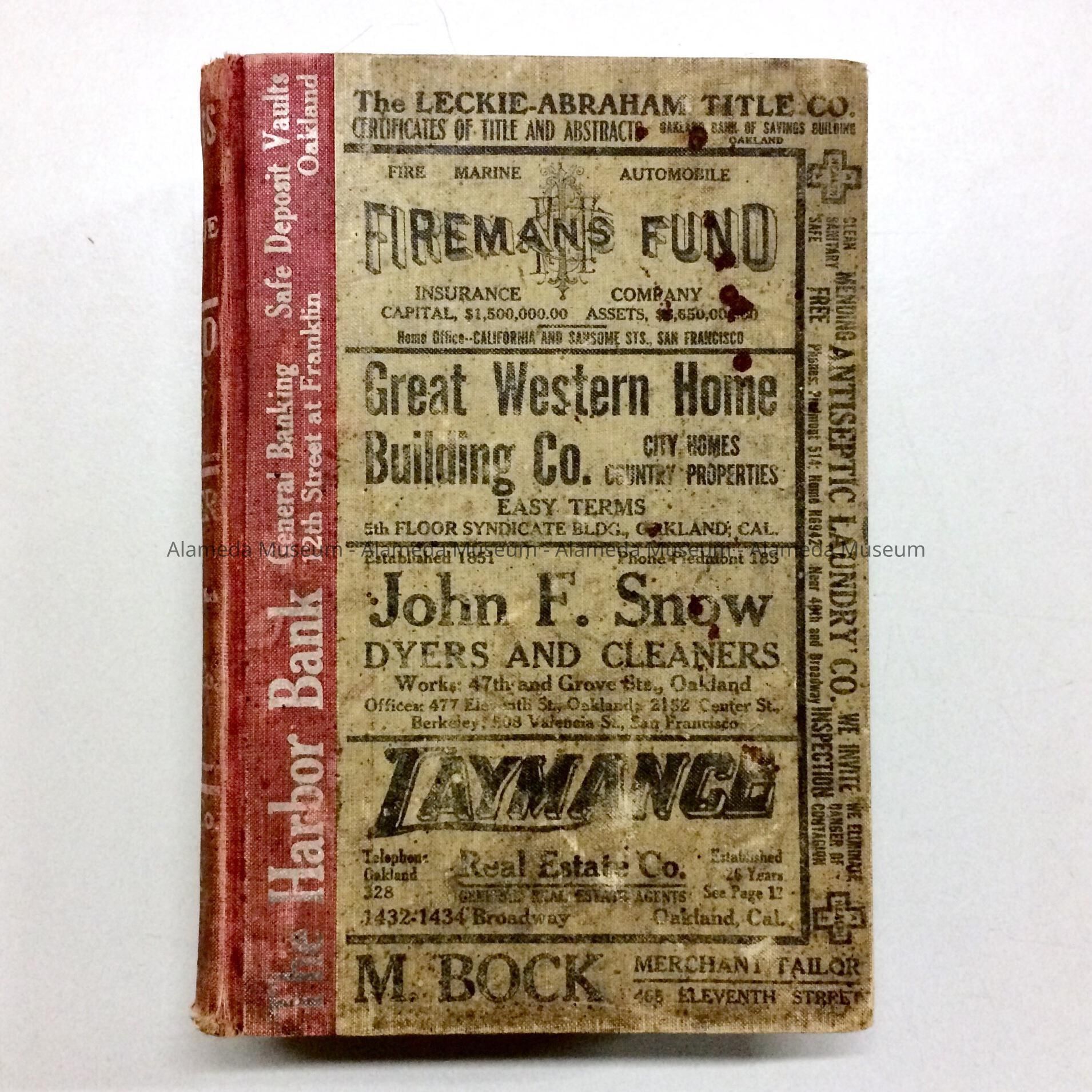 Description: Hard bound volume. Cover has ads for businesses printed with black colored type on pale gray colored buckram. Spine of red colored buckram has bold printed caption "Oakland Directory" in white colored type.