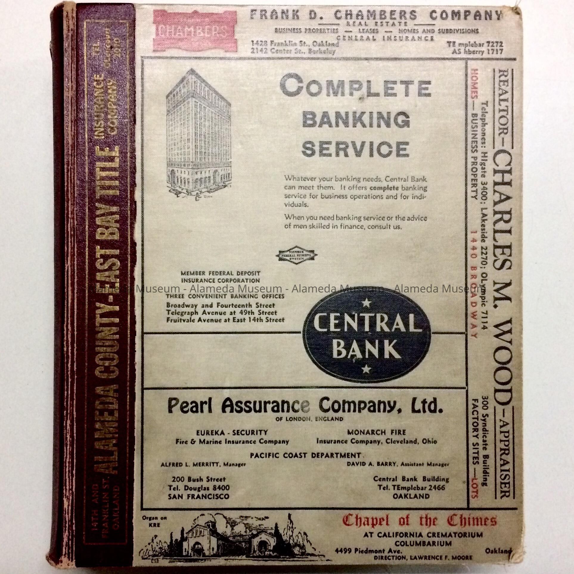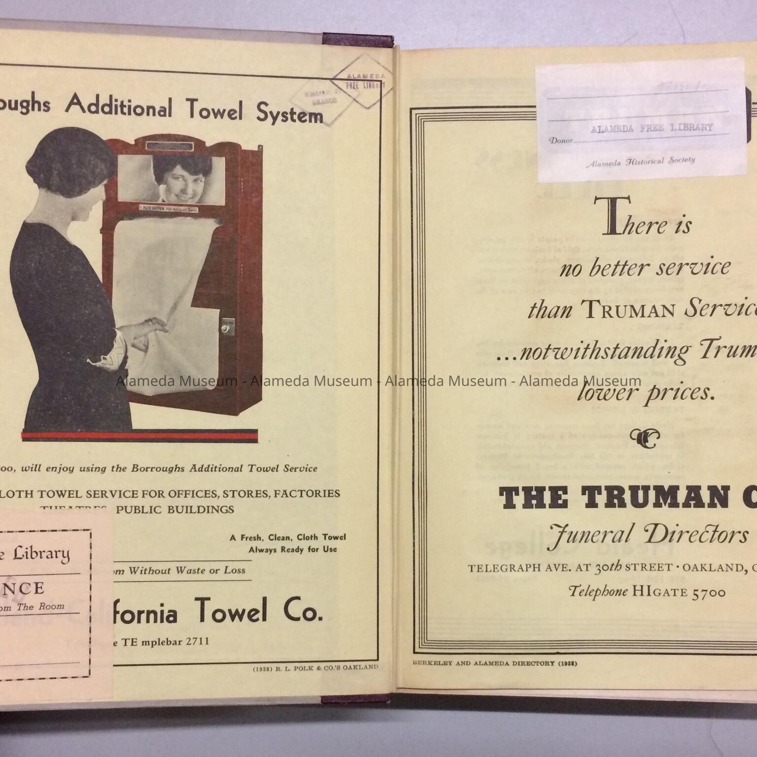 POLK'S OAKLAND-ALAMEDA-BERKELEY CITY DIRECTORY FOR 1938. IT WAS A "CANCELLED" PUBLICATION FOR THE REFERENCE DEPARTMENT OF THE ALAMEDA FREE LIBRARY. IT WAS PRESENTED TO THE ALAMEDA HISTORICAL SOCIETY BY THE ALAMEDA FREE LIBRARY IN 1956. IT WAS ORIGINALLY NUMBERED "730" IN THE MUSEUM COLLECTION, BUT NOT CATALOGED UPON RECEIPT.