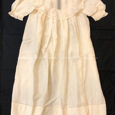 A. Pongee full length baby dress, off-white, trimmed with embroidery & drawn work.
