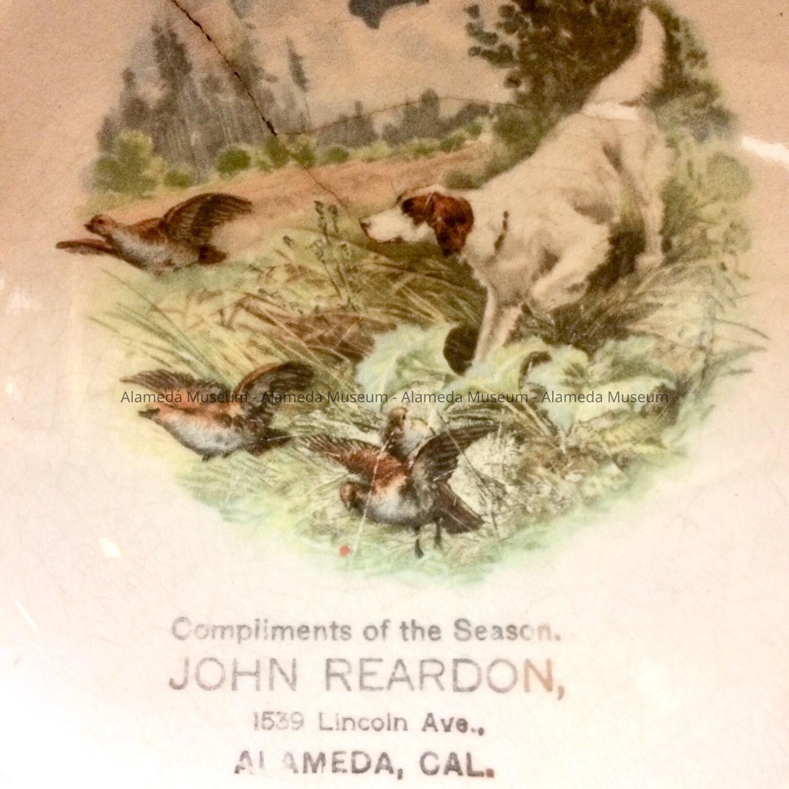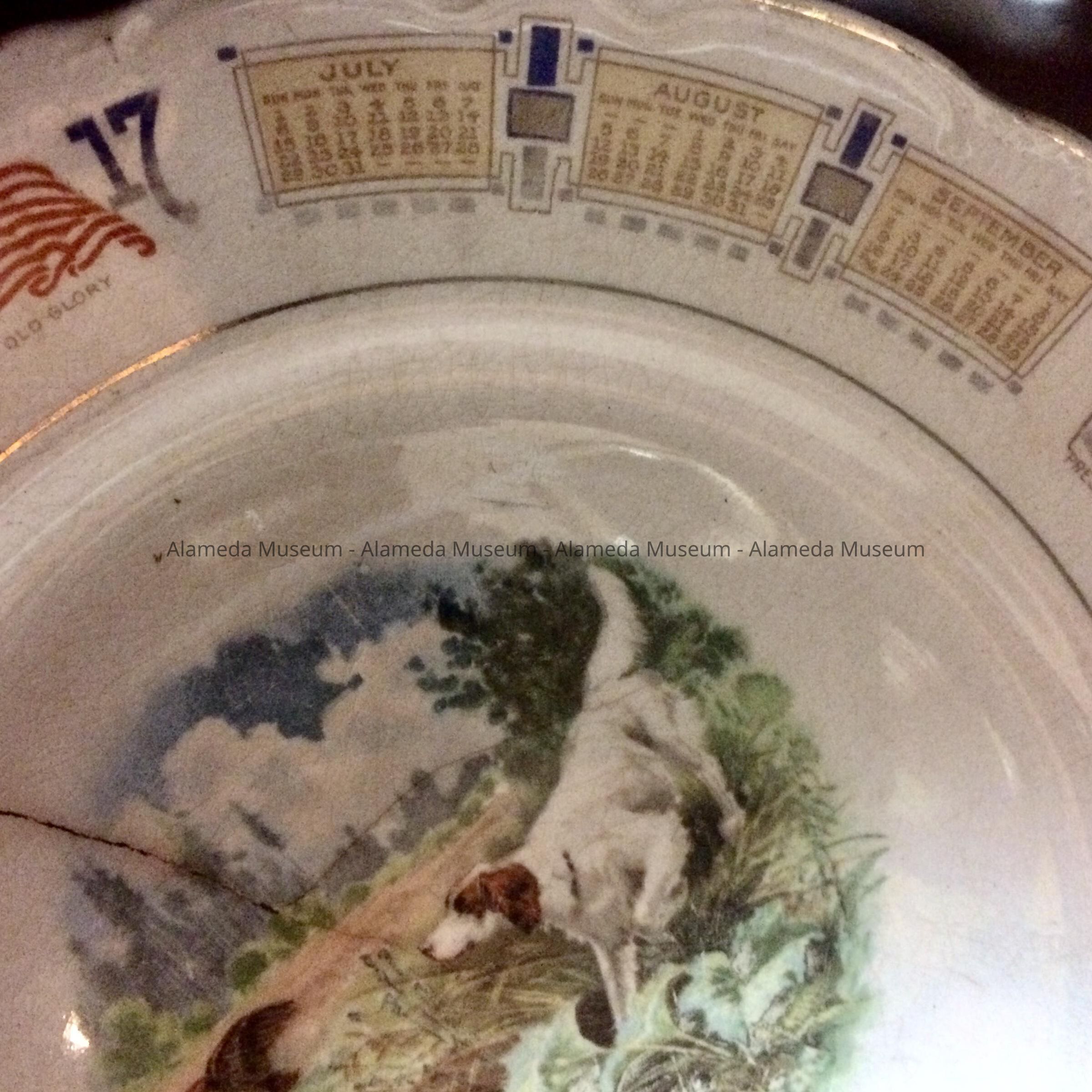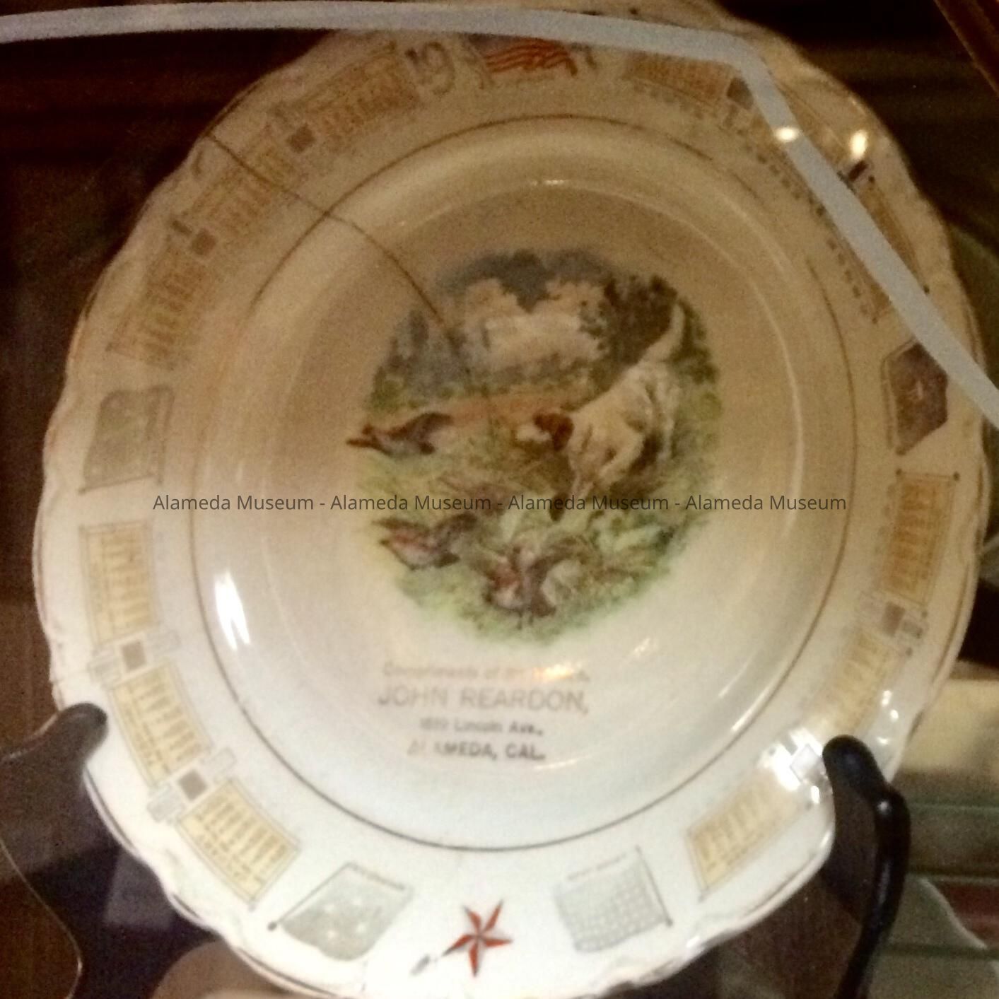 Description: Semi porcelain plate, manufactured by D, E. McNicol, East Liverpool, Ohio. The face of the plate has a transferred scene of hunting dogs and fowl. Below this scene it says, "Compliments of the Season, John Reardon, 1539 Lincoln Ave., Alameda, Cal.” Around the border of the plate are the twelve months of the year 1917 flanking the American flag. Size is 8½" in diameter.